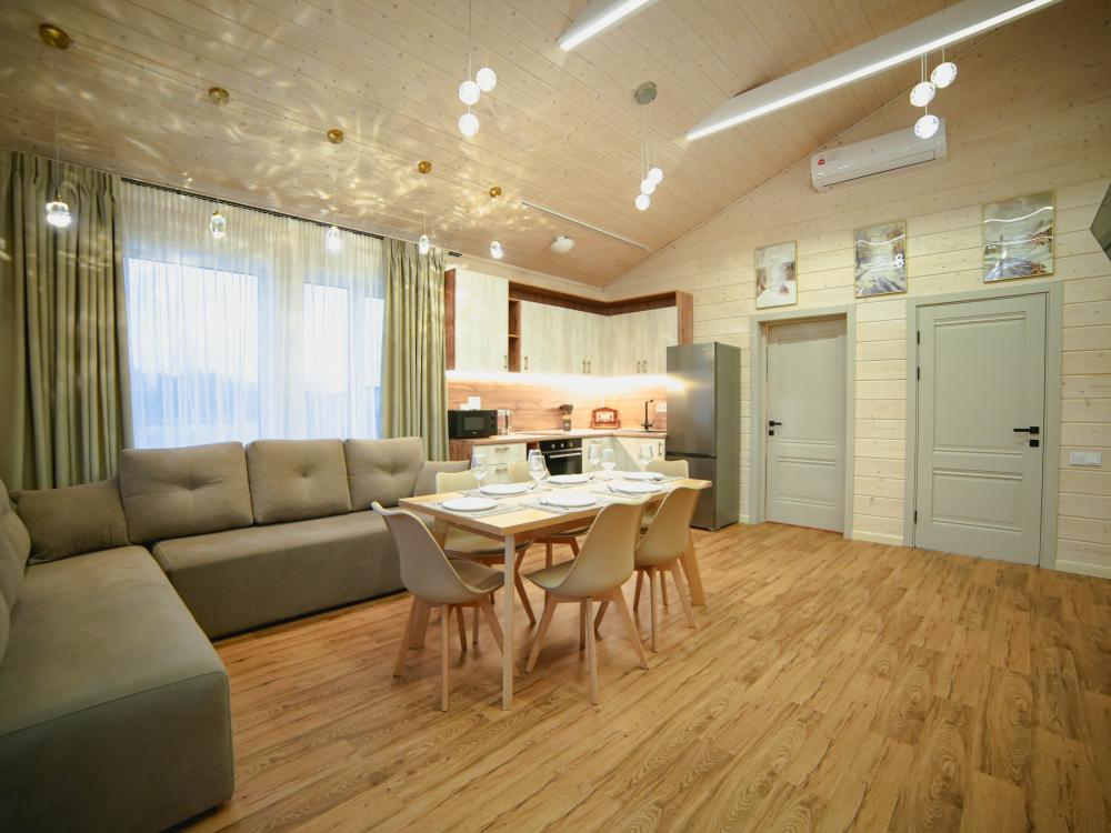 Одноэтажный компактный модульный дом с террасой и панорамным окном-стеной.В доме: гостиная с диваном-кроватью,журнальным столом и оборудованной кухней, две отдельных спальни с двуспальными кроватями. Изюминкой коттеджа является подогреваемая купель-фурако с гидромассажем и подсветкой (оплачивается дополнительно- 5000 руб.). Используя термокрышку, вы можете пользоваться ей на протяжении 5-6 часов! К купели предоставляются халаты, полотенца и тапочки.