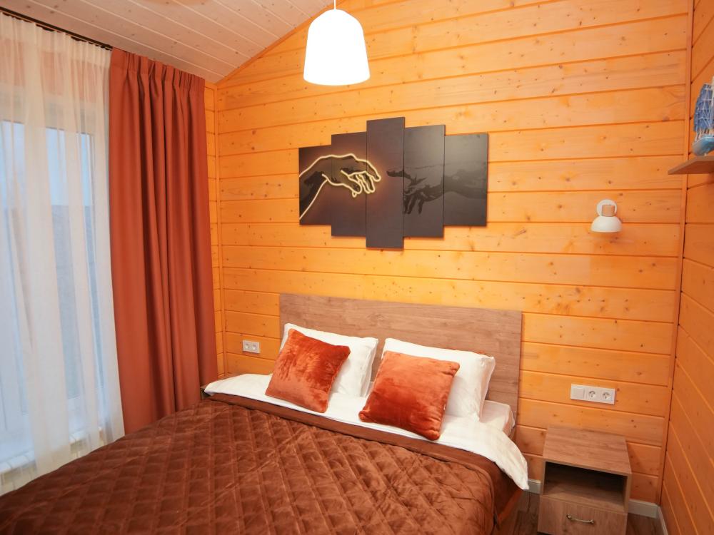 В модуле 2 основных места и 2 дополнительных. Тепло дерева и натуральных тканей помогли создать гармоничное и уютное пространство, где можно наслаждаться покоем в единении с собой, с любимым человеком или семьей. В наличии TV с интернет-каналами, Wi-Fi, индивидуальная система отопления и кондиционирования, микроволновая печь, мини-холодильник, санузел с душевой кабиной, полотенца, постельные принадлежности, уличная мебель, фен, чайник, шампунь, гель для душа и электрический подогрев пола. Для приготовления пищи на открытом воздухе предусмотрены зоны барбекю.Изюминкой коттеджа является подогреваемая купель-фурако с гидромассажем и подсветкой (оплачивается дополнительно- 5000 руб.). Используя термокрышку, вы можете пользоваться ей на протяжении 5-6 часов! К купели предоставляются халаты, полотенца и тапочки.