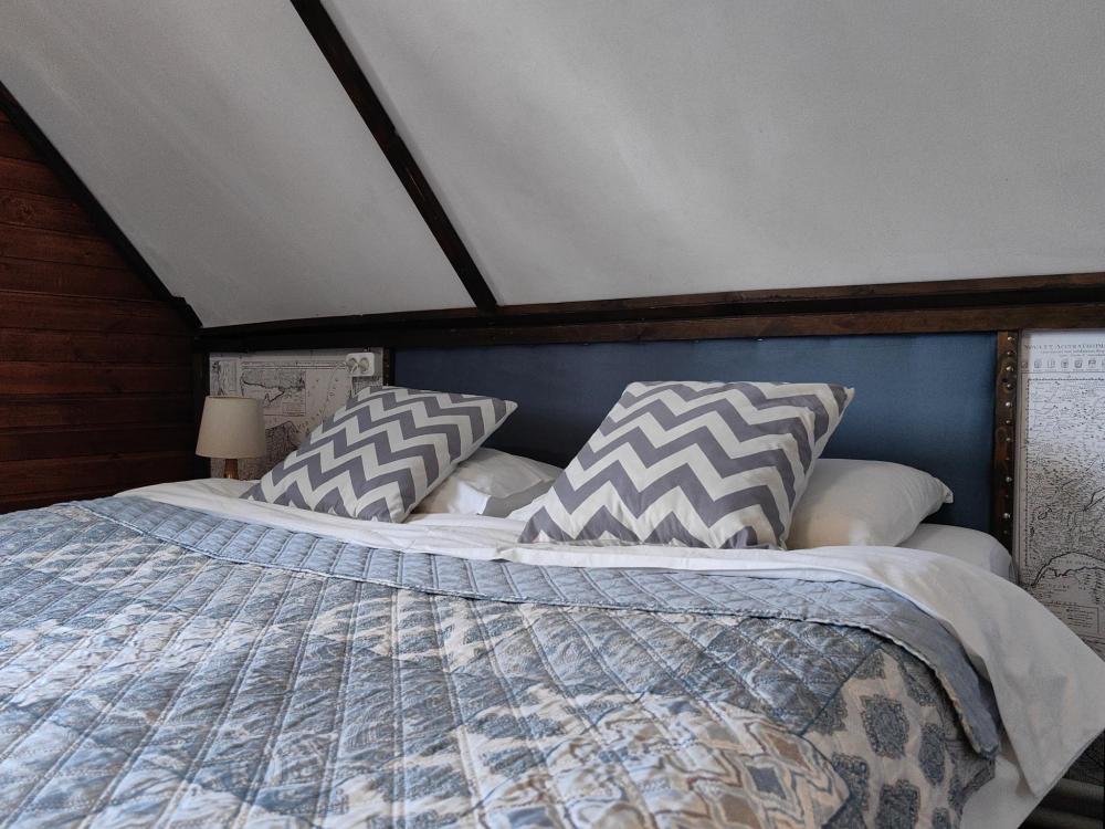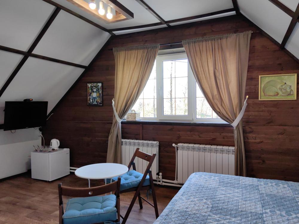 Двухместная комната с большой кроватью и собственной ванной комнатой. Комната расположена на втором этаже. Оснащение: холодильник, чайник, телевизор, столик и стулья.