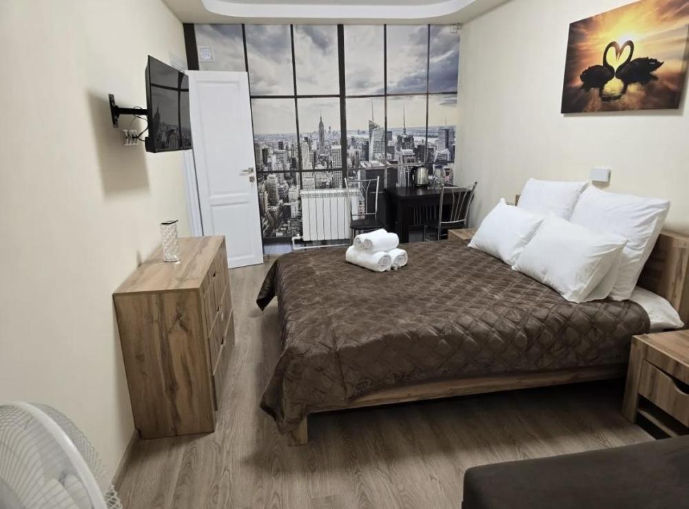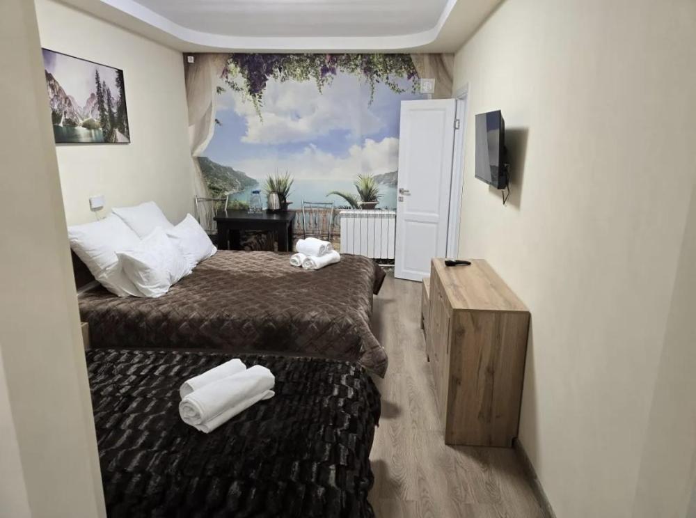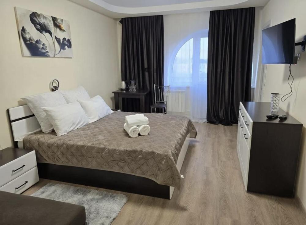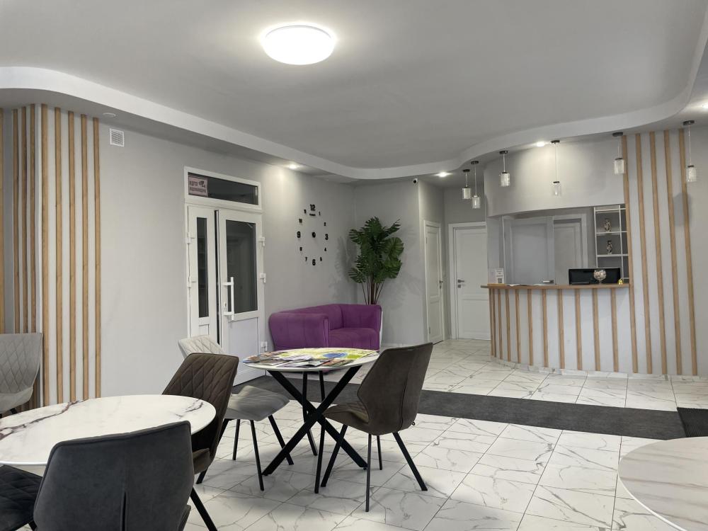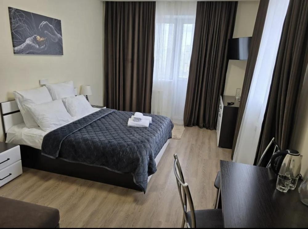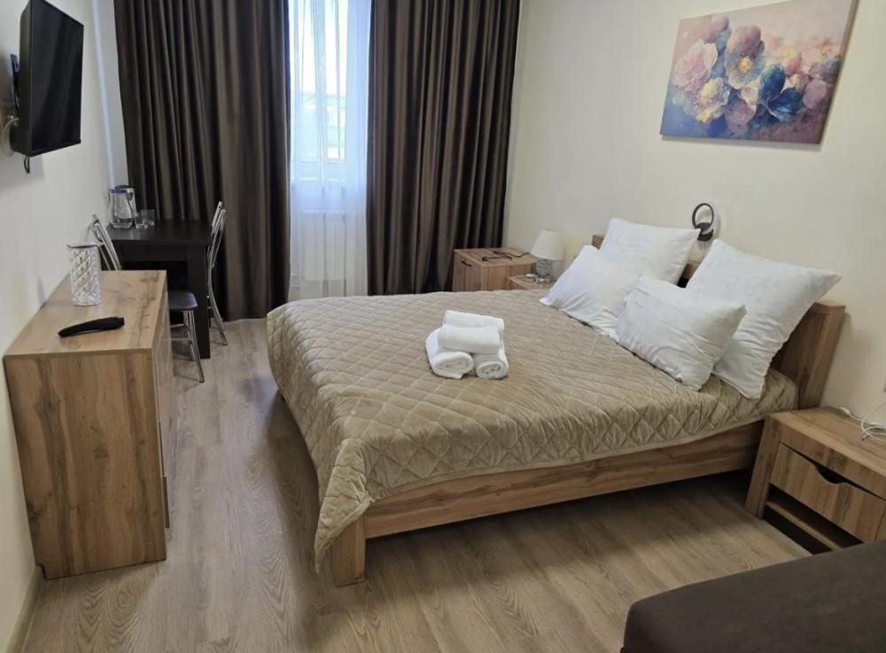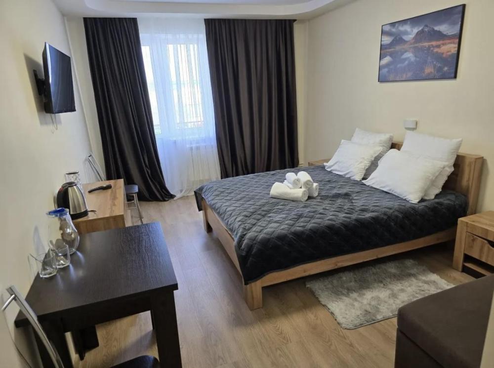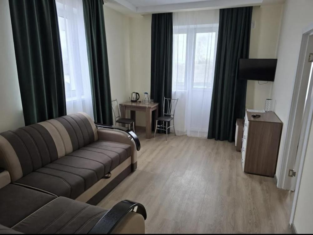 Номер с окном/балконом. Двухкомнатный люкс,просторный угловой диван,раскладывается на три полноценных спальных места, телевизор,стол,стулья,электрический чайник,стаканы,графин.Вторая комната с двухспальной кроватью прикроватными тумбами. Бесплатный Wi-Fi,на каждом этаже кулер с горячей и холодной водой,утюг и гладильная доска.