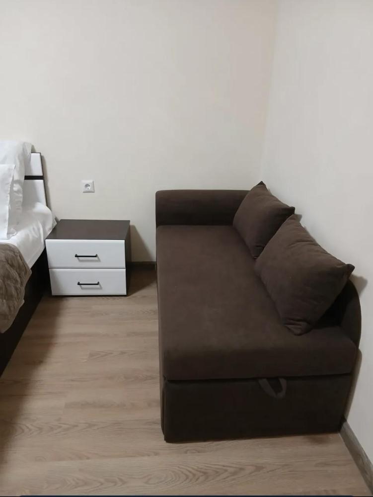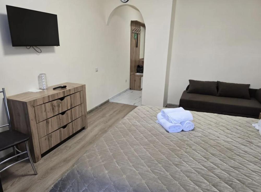 Просторный трехместный номер с одной двухспальной кроватью и раскладным диваном,удобства в номере,так же телевизор,электрический чайник,фен,стол,стулья,комод.На каждом этаже кулер с горячей и холодной водой.Номер без окна