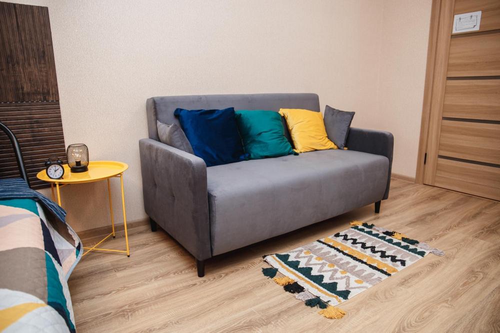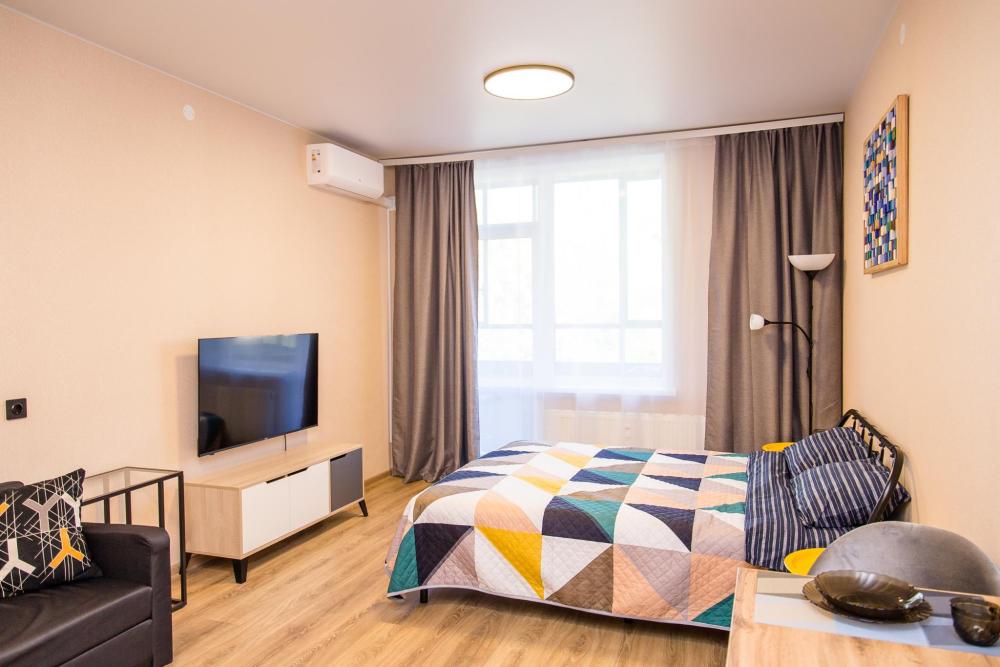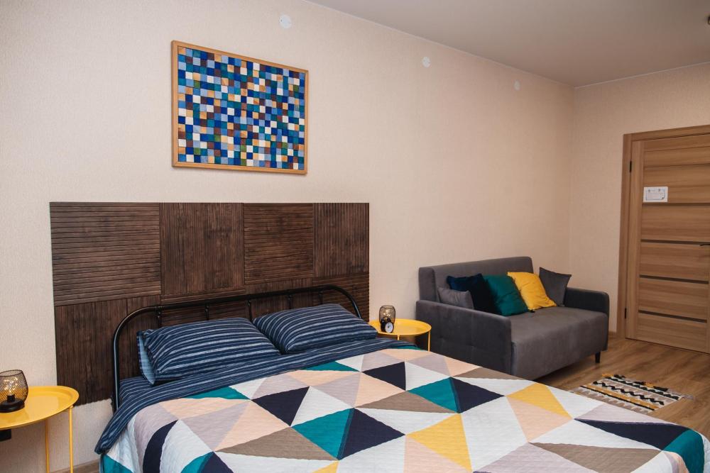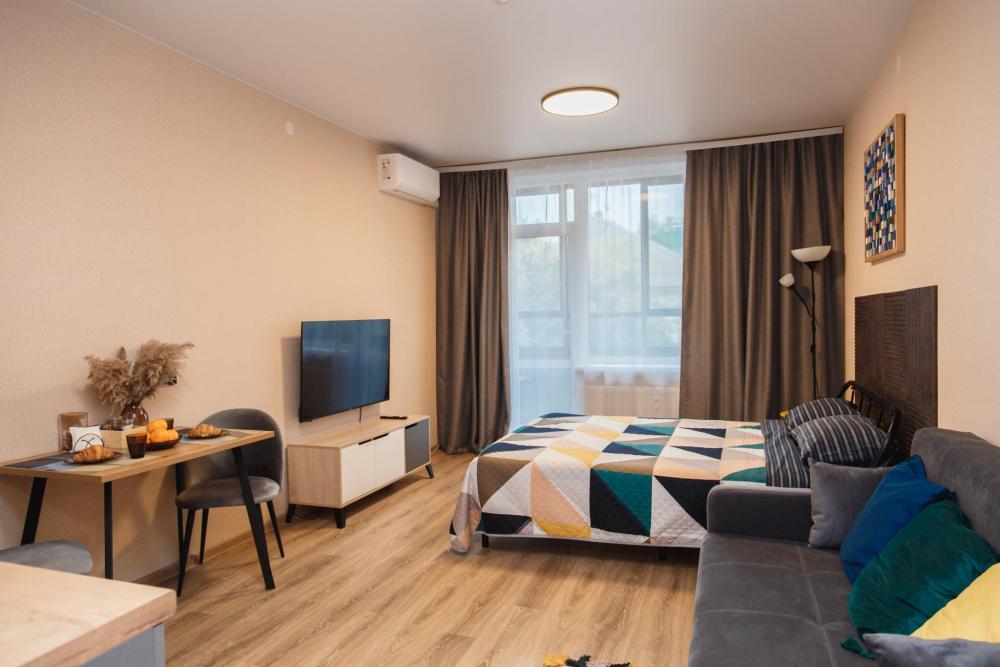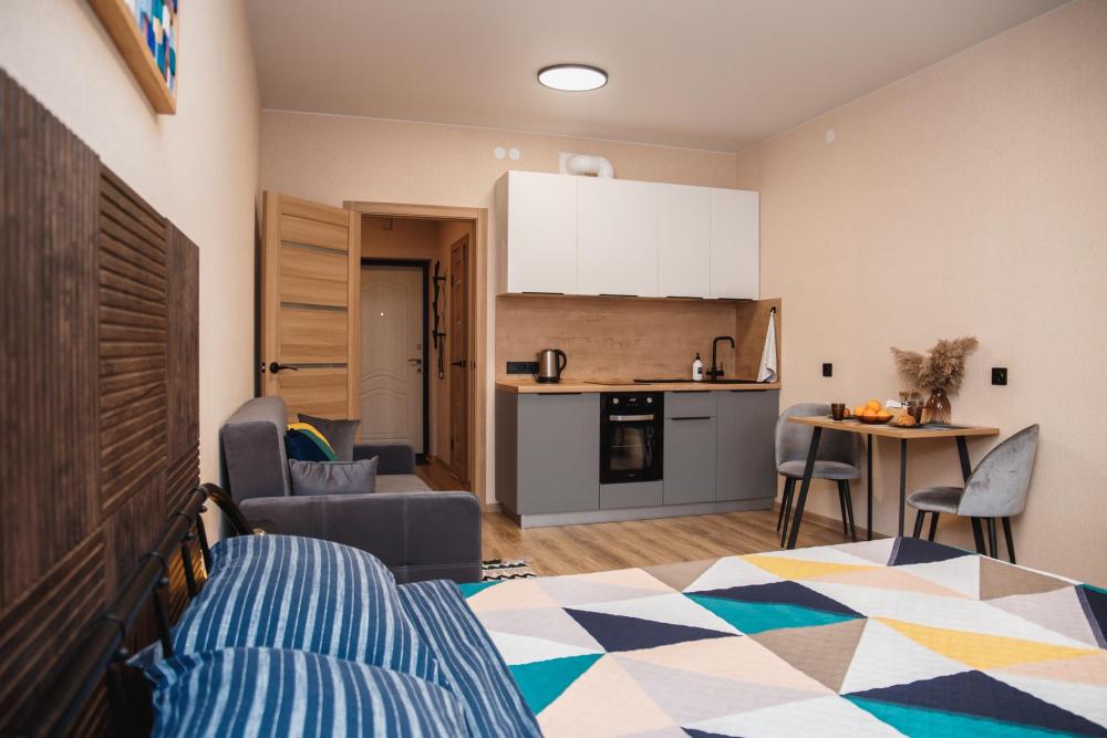 Уютные апартаменты студия. Размещение до 4 человек и все удобства для комфортного проживания: 4 спальных места (двуспальная кровать и 1,5-спальный диван), чистое постельное белье и набор полотенец, посуда для еды и готовки, гладильная доска и сушилка для белья, кондиционер, холодильник, варочная поверхность, духовой шкаф, микроволновая печь, чайник, SMART TV, WI-FI, утюг, фен, стиральная машина, пылесос, водонагреватель.