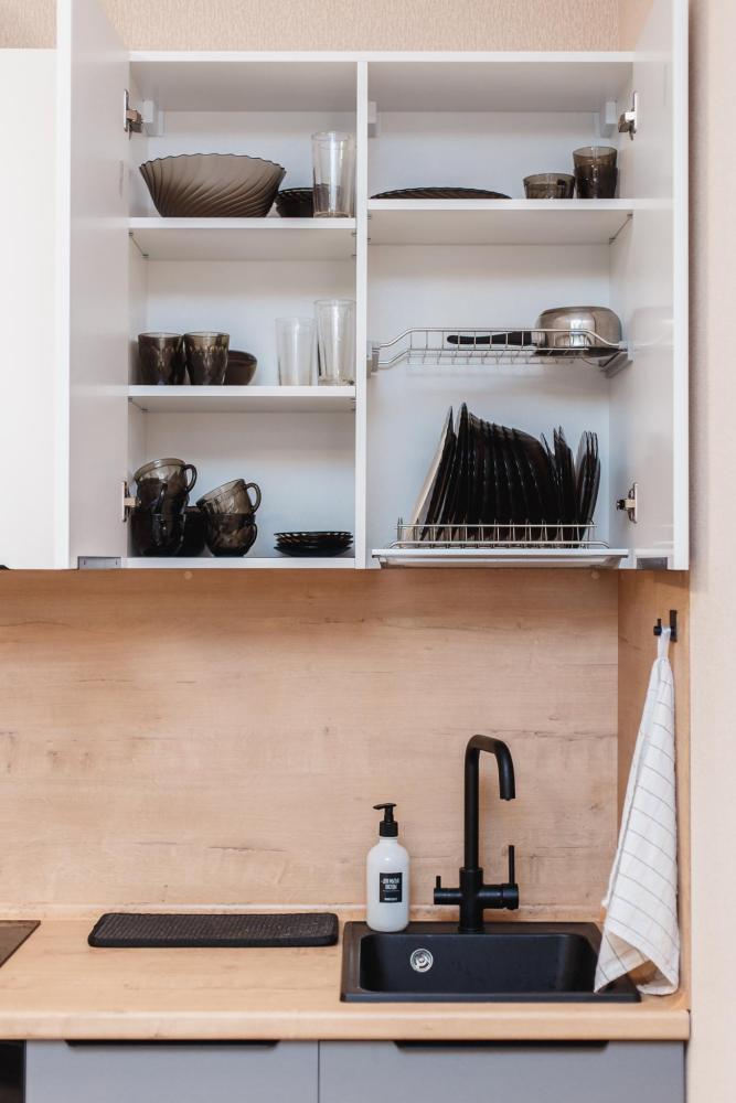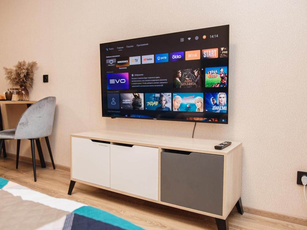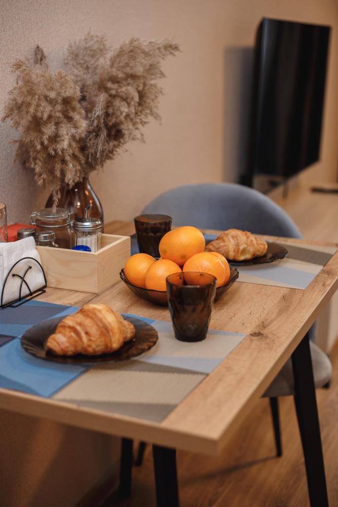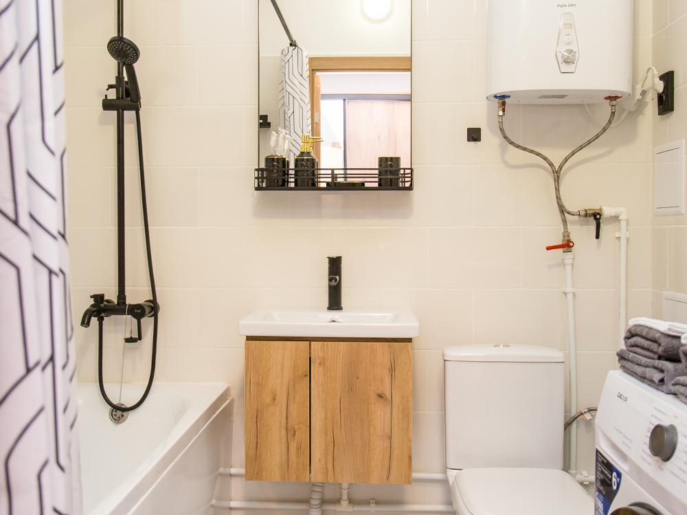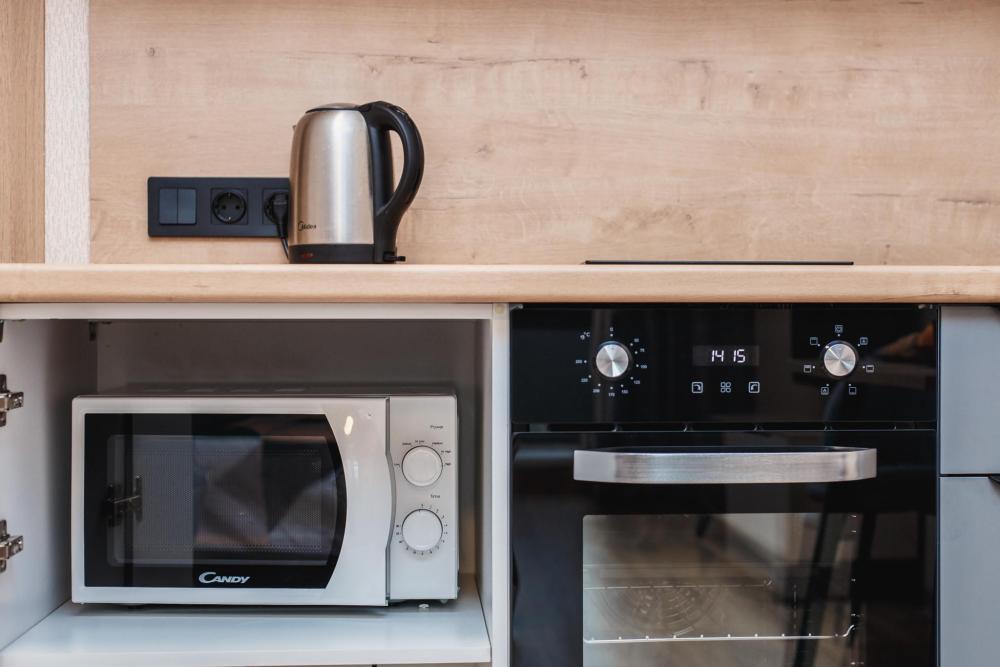 Уютные апартаменты студия. Размещение до 4 человек и все удобства для комфортного проживания: 4 спальных места (двуспальная кровать и 1,5-спальный диван), чистое постельное белье и набор полотенец, посуда для еды и готовки, гладильная доска и сушилка для белья, кондиционер, холодильник, варочная поверхность, духовой шкаф, микроволновая печь, чайник, SMART TV, WI-FI, утюг, фен, стиральная машина, пылесос, водонагреватель.