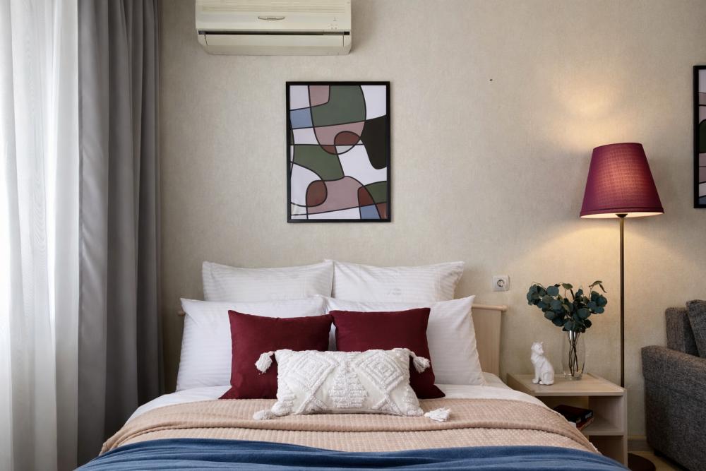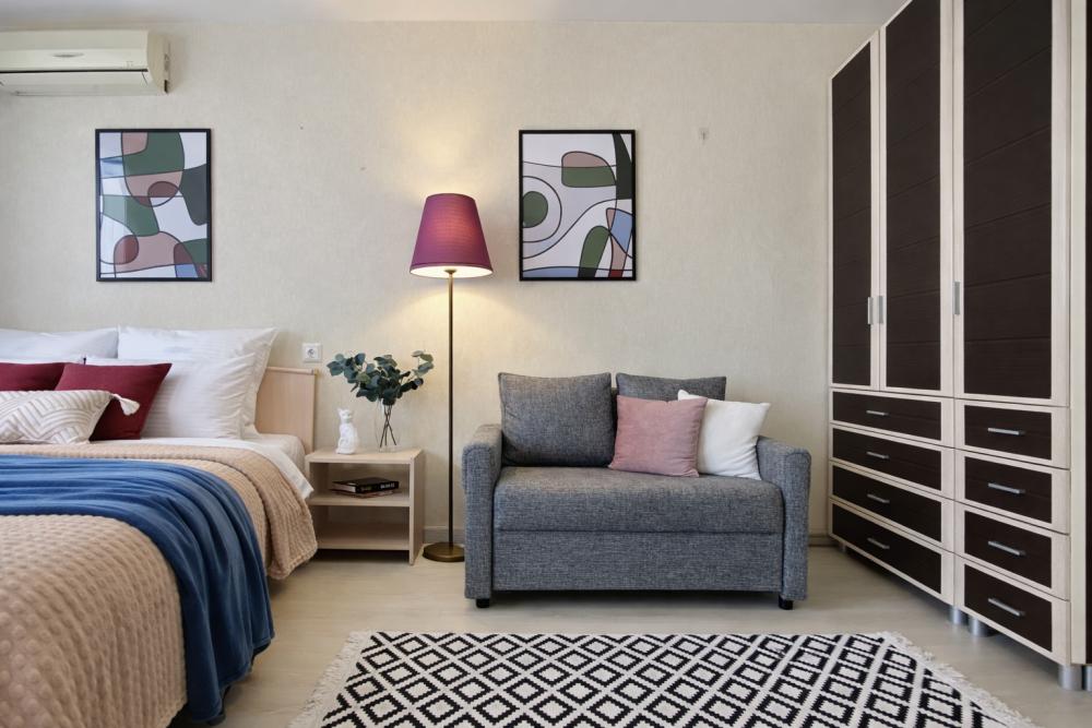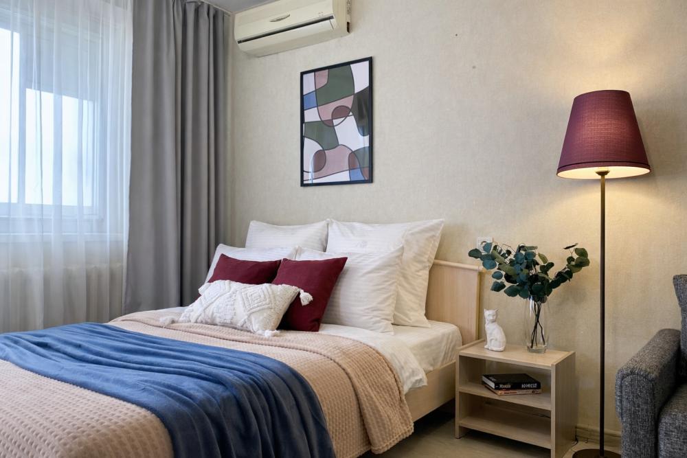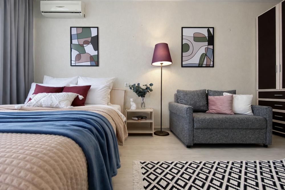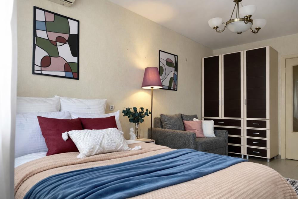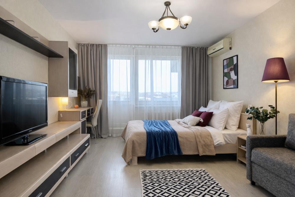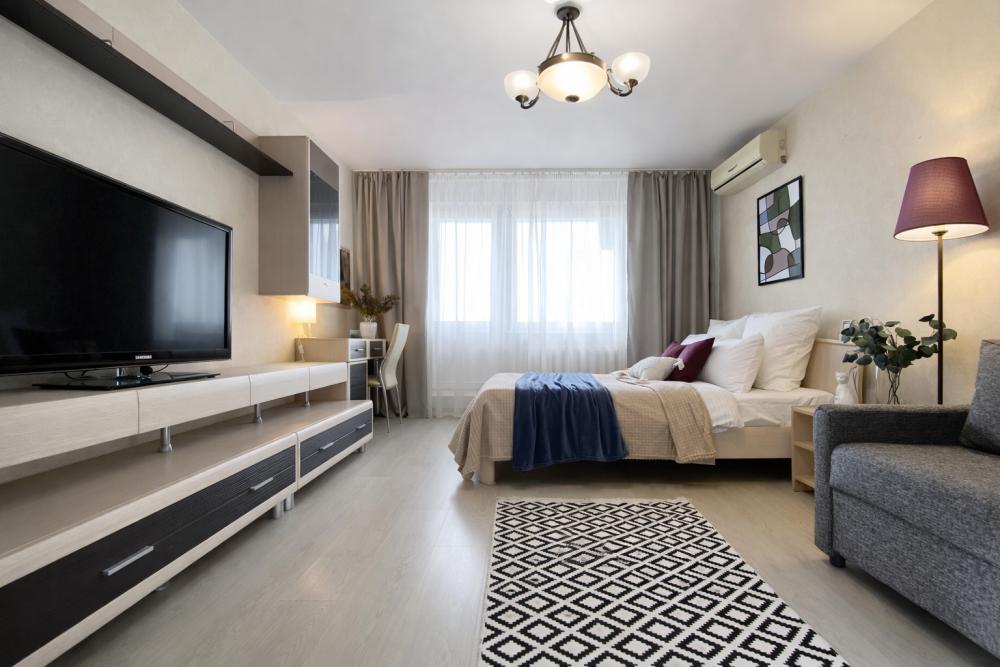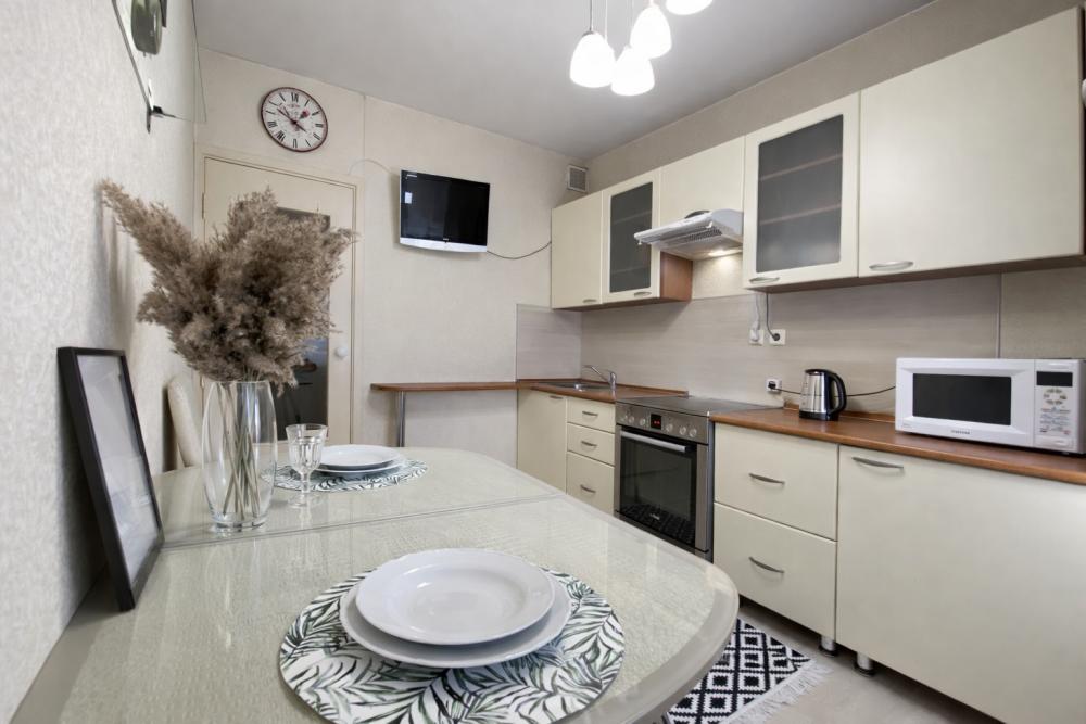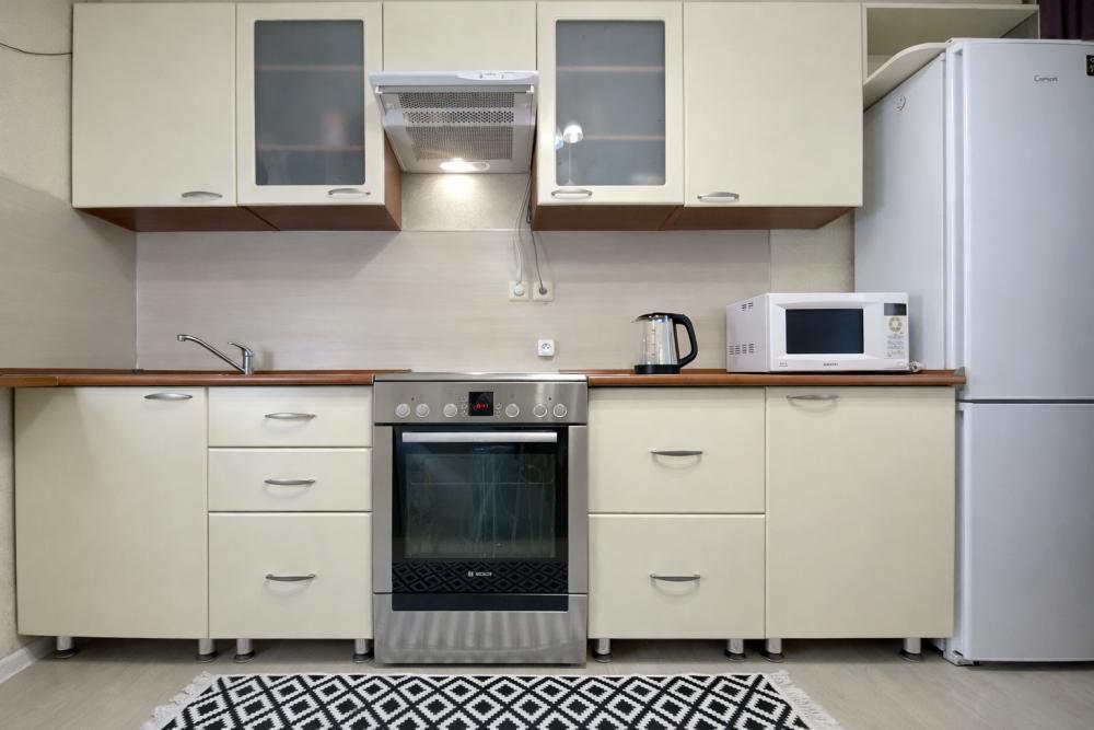 Квартира оборудована всем необходимым для комфортного проживания: Двуспальная кровать, односпальный раскладной диван. Большой телевизор в комнате и маленький на кухне. Место для работы за ноутбуком. Кухонный гарнитур, вся посуда и кухонная техника. Фен, утюг, гладильная доска. На входе в квартиру есть видеофиксация, это необходимая мера для обеспечения безопасности имущества, камера направлена исключительно на вход.
