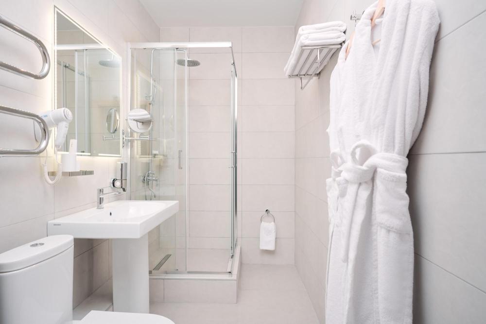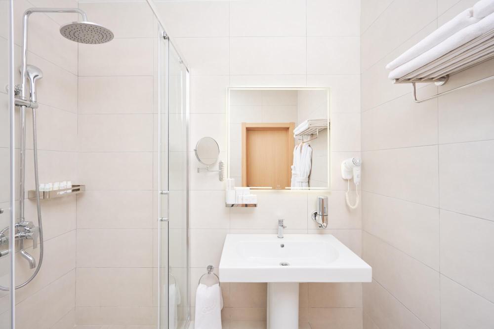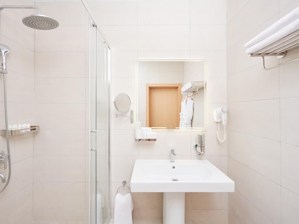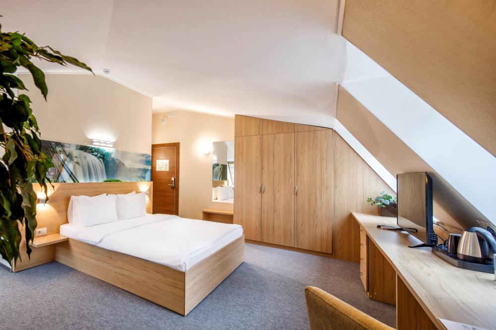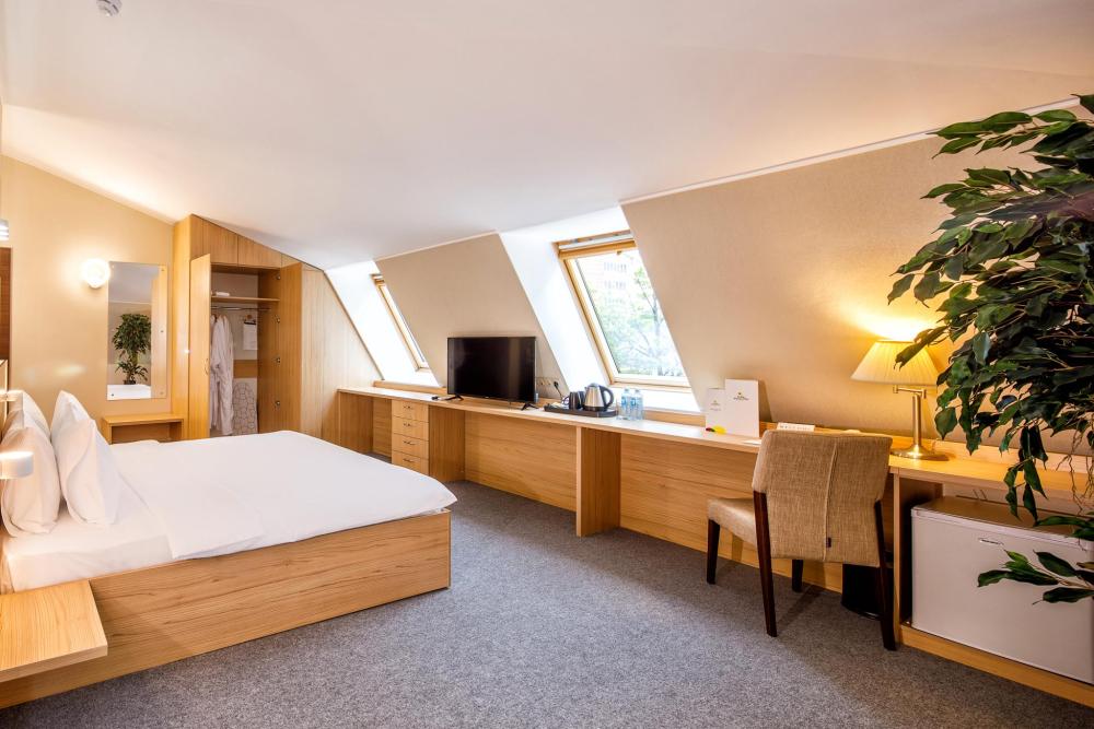Просторный номер с двуспальной кроватью. Возможно одноместное, двухместное и трехместное размещения. В оснащение номера входит: одна двуспальная кровать и раскладное спальное место, телевизор с плоским экраном, кабельное телевидение, фен, мини-холодильник, душ, банные принадлежности, халат, тапочки, чайная станция. Софа раскладывается, возможно трехместное размещение.