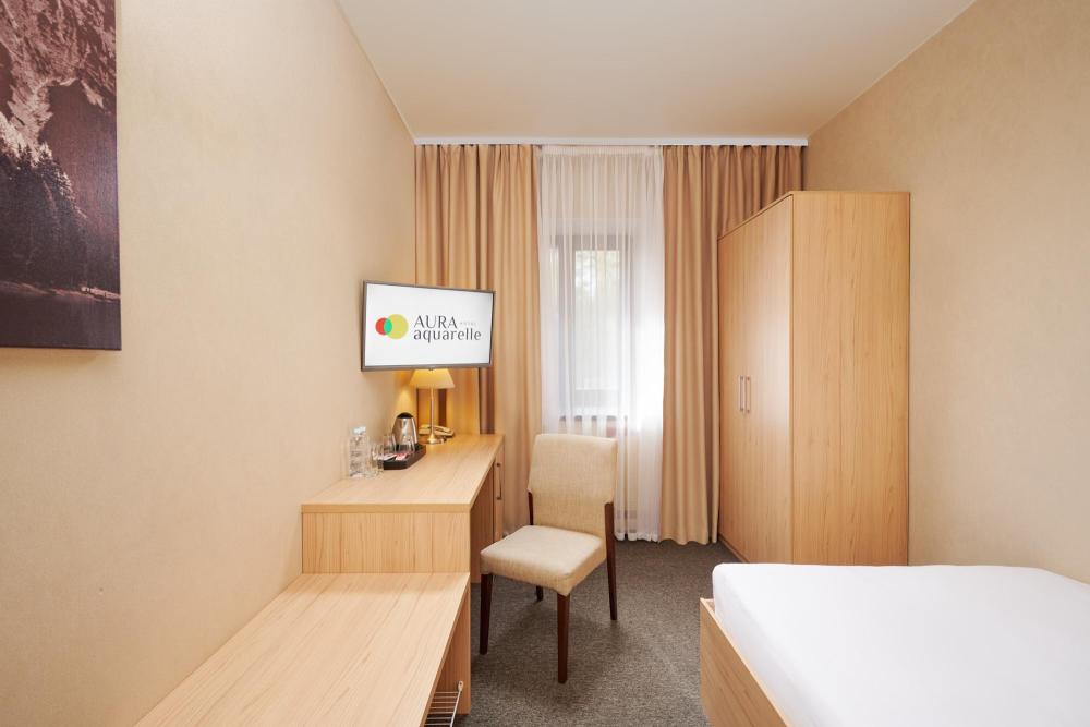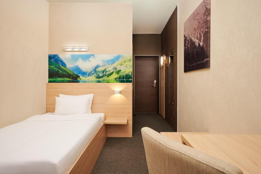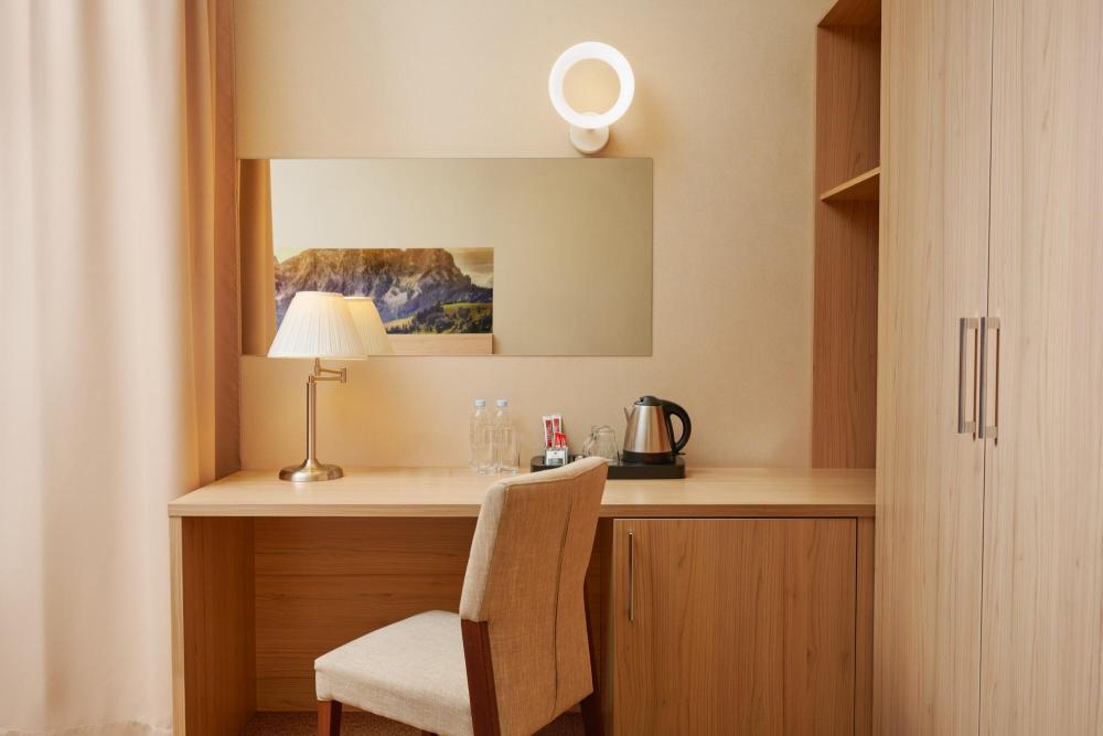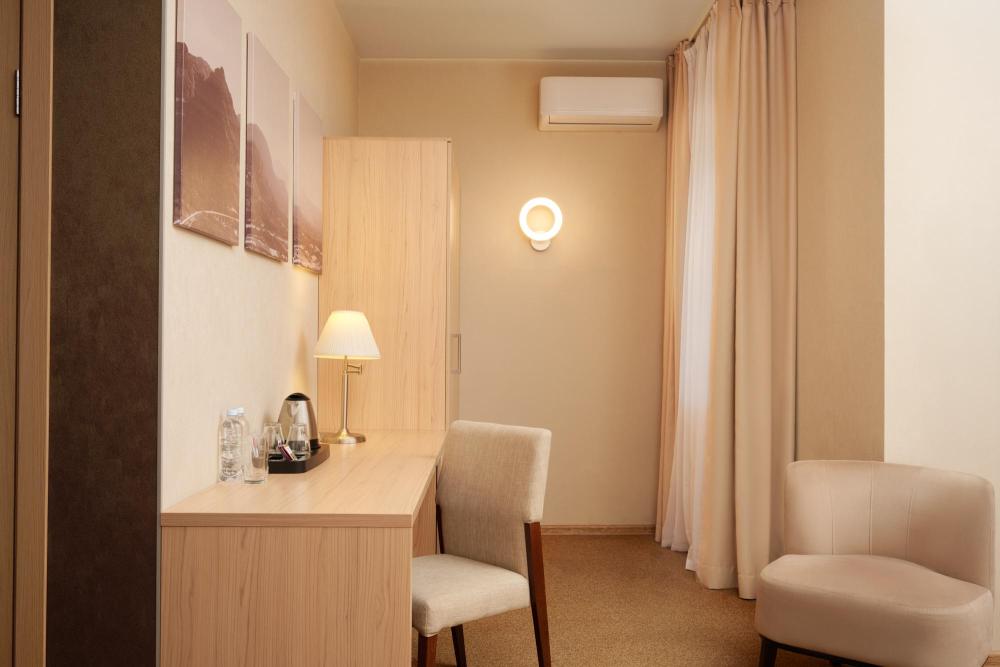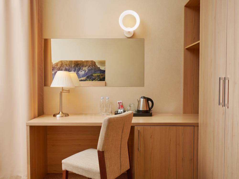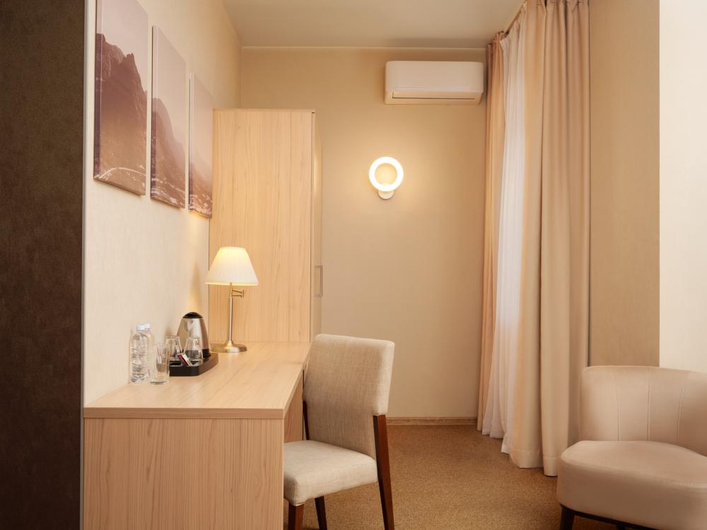 Уютный номер категории для одноместного размещения. В оснащение номера входит: одна полутораспальная кровать (повышенной комфортности), телевизор с плоским экраном, кабельное телевидение, фен, мини-холодильник, душ, банные принадлежности, халат, тапочки, чайная станция