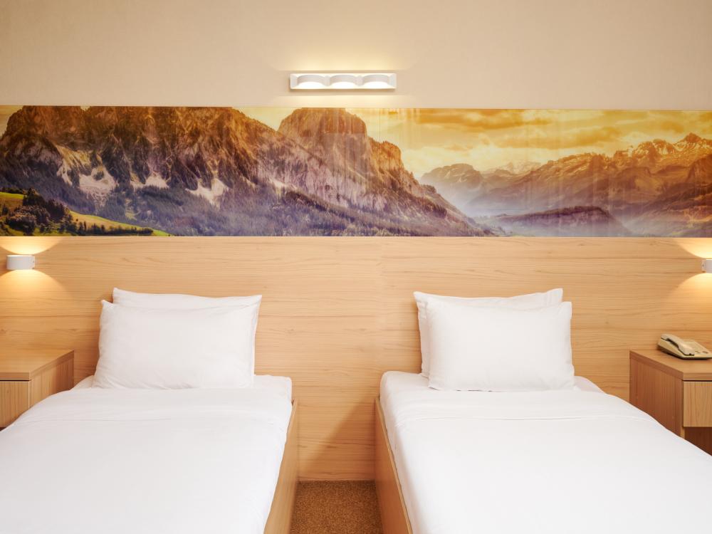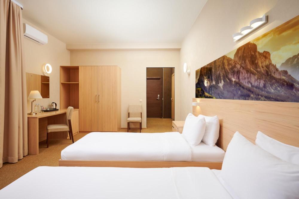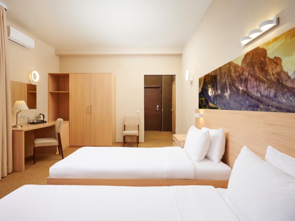 Уютный номер для одноместного или двухместного размещения. В оснащение номера входит: две двуспальные кровати, телевизор с плоским экраном, кабельное телевидение, фен, мини-холодильник, душ, банные принадлежности, халат, тапочки, чайная станция