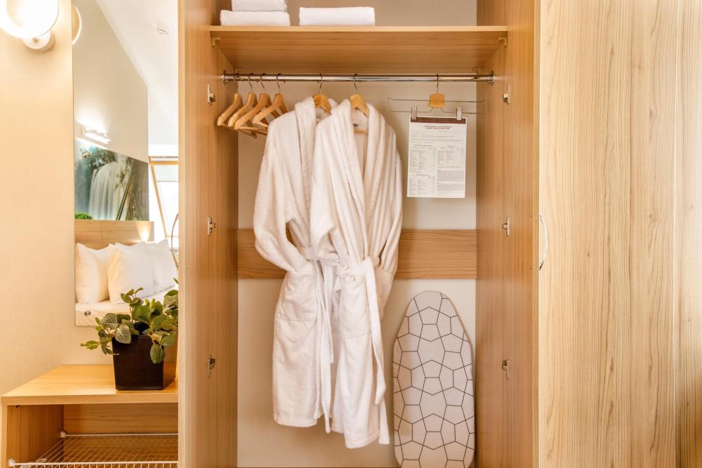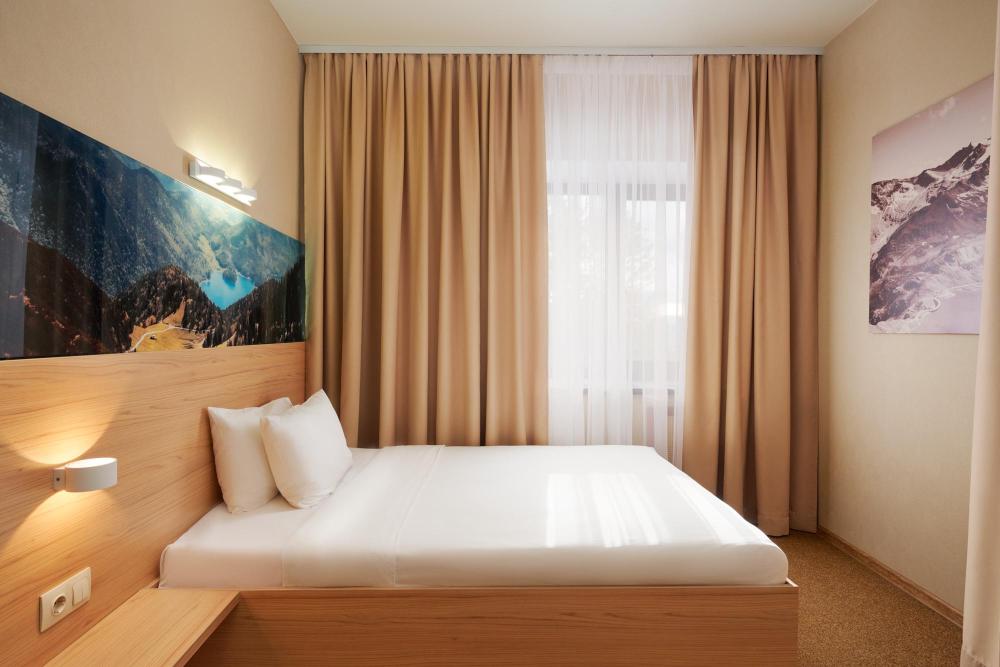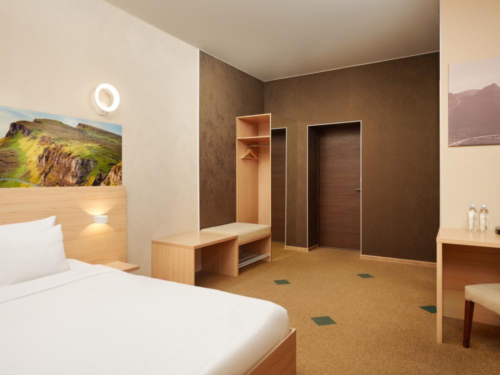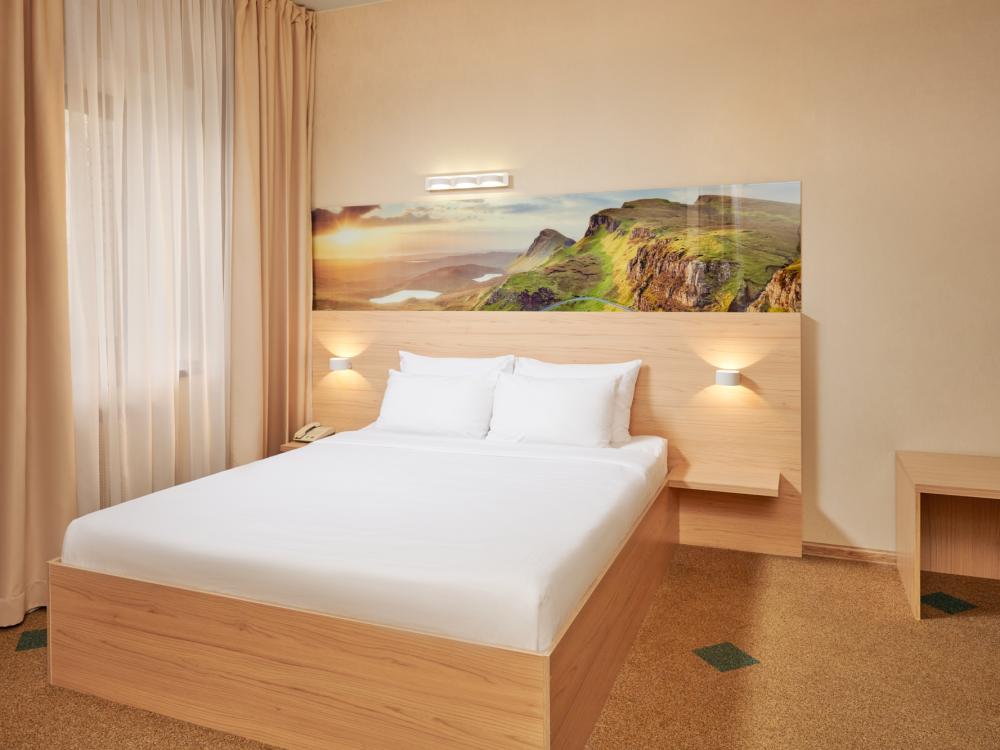 Двухместный стандарт с одной кроватью для одноместного или двухместного размещения. В оснащение номера входит: одна двуспальная кровать, телевизор с плоским экраном, кабельное телевидение, фен, мини-холодильник, душ, банные принадлежности, халат, тапочки, чайная станция
