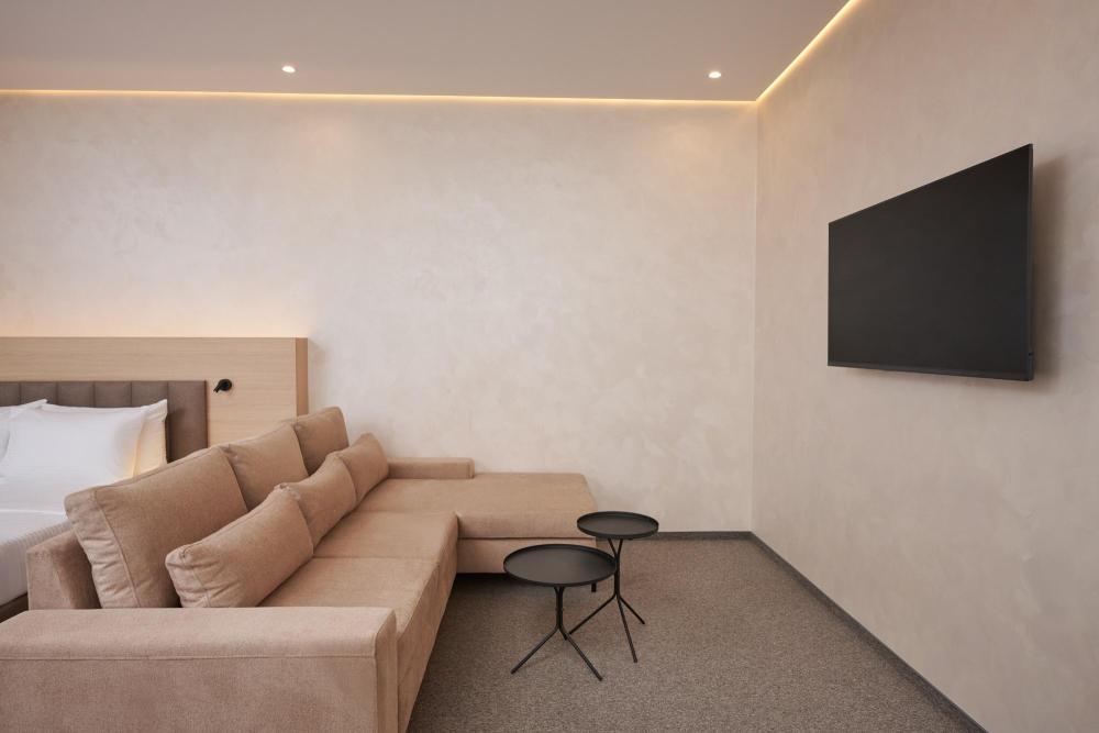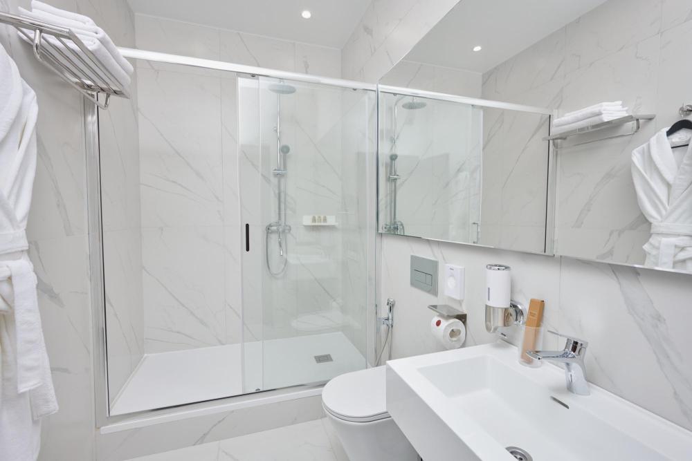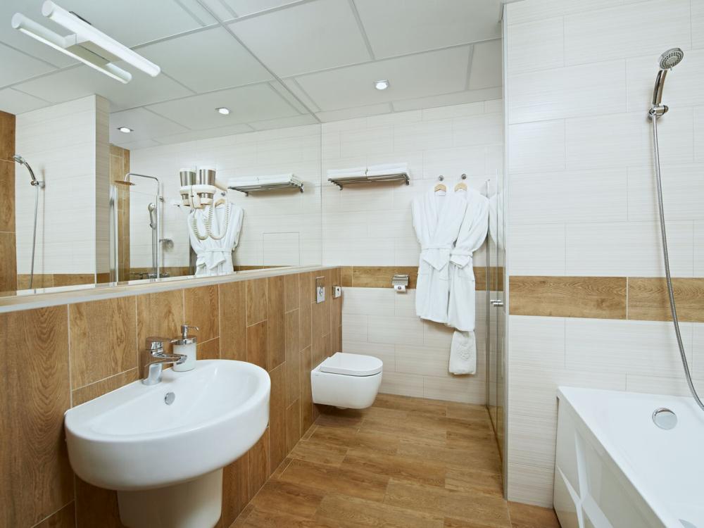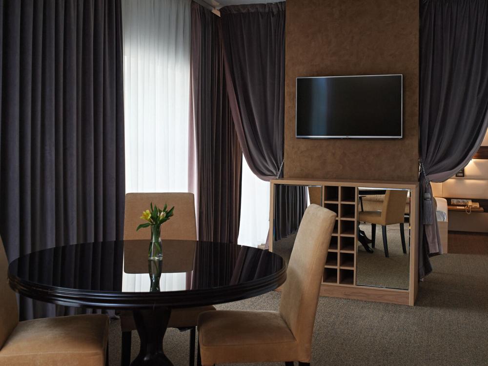 Номер с отдельной мягкой зоной с креслом, диваном столиком. Двуспальная кровать, просторная ванная комната с душевой кабиной, фен, хала, тапочки, индивидуальные средства гигиены, мини-бар, телевизор, кабельное телевидение, Wi-Fi, сейф, чайная станция.