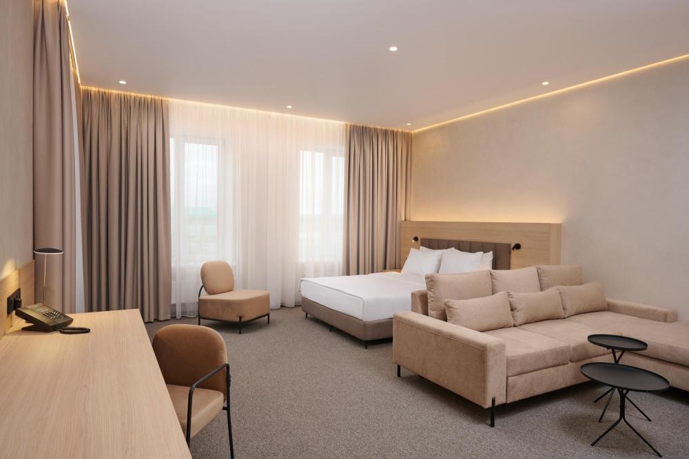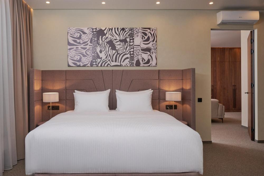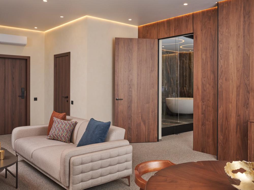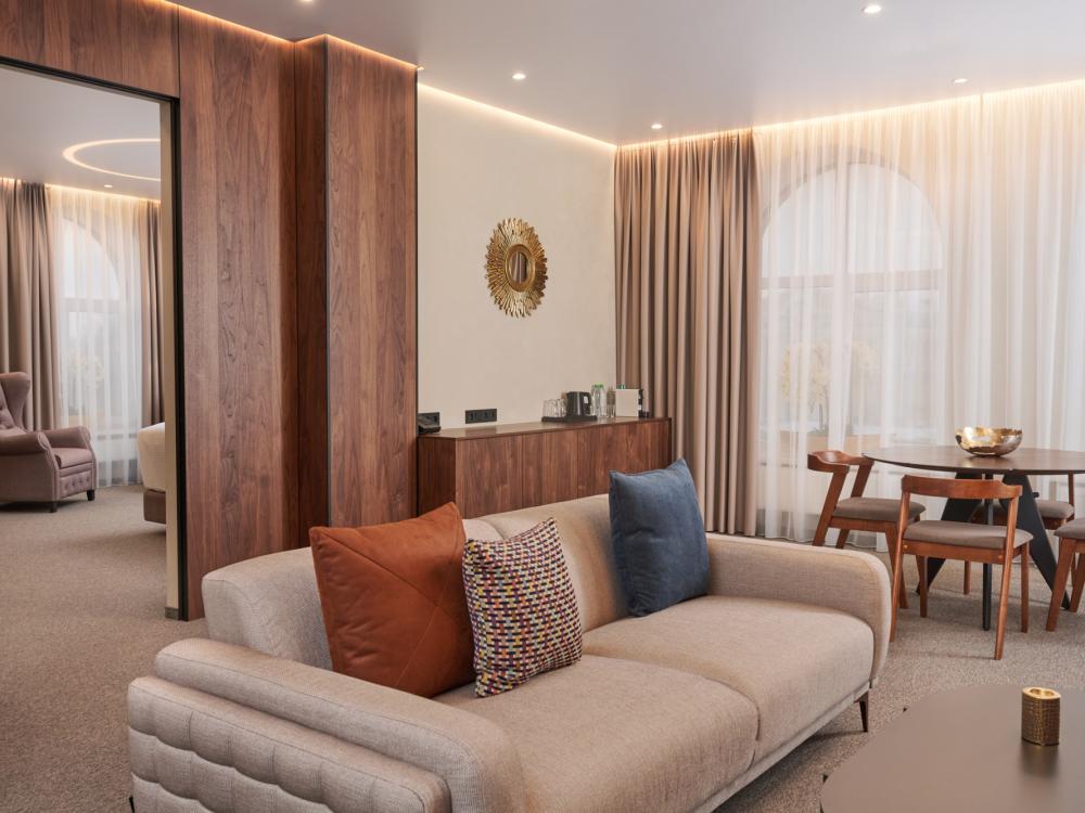 Идеальный выбор для тех, кто ценит личное пространство и комфорт. Просторная гостиная с уютной зоной для отдыха станет отличным местом для расслабления после насыщенного дня. Спальная зона имеет двуспальную кровать с качественным матрасом и постельным бельем, что гарантирует крепкий сон. В номере современная ванная комната, оборудованная всем необходимым для комфортного пребывания. В оснащение номера входит: двуспальная кровать (по запросу возможно разделить на две односпальные), просторная ванная комната, фен, халат, тапочки, индивидуальные средства гигиены, мини-холодильник, гладильная доска, утюг, smart-tv, беспроводной Wi-Fi, сейф, чайная станция, бесплатно питьевая вода, чай и кофе.