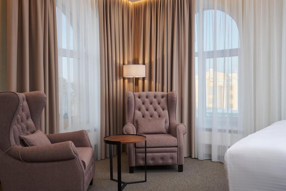 Идеальное место для деловых поездок и отдыха. Просторный двухкомнатный номер сочетает в себе элегантный дизайн и современные удобства, обеспечивая максимальный комфорт для Вашего пребывания. Просторная гостиная комната идеально подходит для встреч или отдыха после насыщенного дня. Уютная обстановка в спальне и кровать размера кинг-сайз способствуют спокойному сну и полному расслаблению. Из окон представительского люкса открывается захватывающий вид на реку Кама. Одним из главных акцентов этого номера является большая ванная комната, оснащенная роскошной ванной и современным душем. Также в люксе предусмотрен гостевой туалет, что добавляет удобства и приватности во время вашего пребывания.