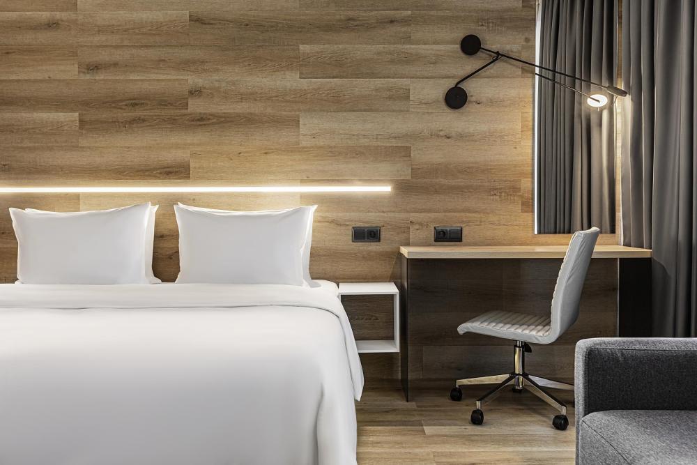 Современный просторный номер Делюкс идеально подходит для бизнеса и отдыха. Насладитесь удобным матрасом, воспользуйтесь удобной рабочей зоной, бесплатным Wi-Fi и набором для приготовления чая/кофе. К вашим услугам минибар и ванная комната с необходимыми туалетными принадлежностями. Для комфортного отдыха в любое время суток в номере есть шторы blackout.