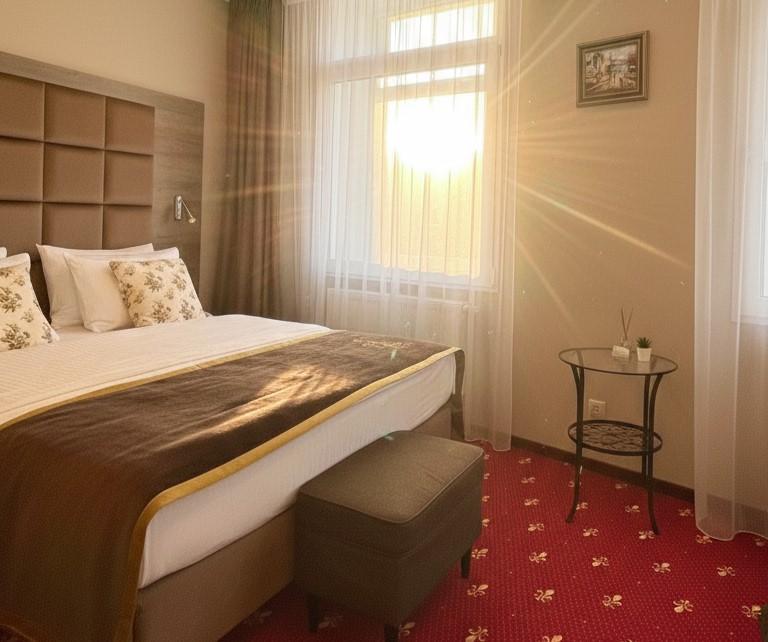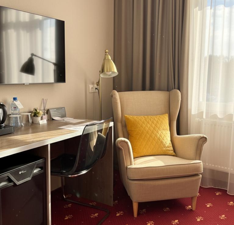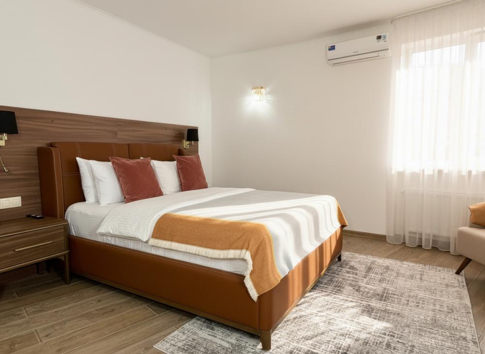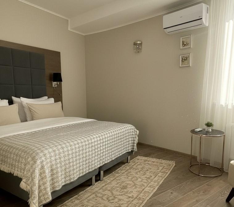 К вашим услугам представлены шесть элегантных номеров категории СТАНДАРТ-ПРЕМИУМ. Номера площадью от 24 до 28 квадратных метров идеально подходят как для индивидуального размещения, так и для проживания вдвоем. Для максимального комфорта гостей каждый номер оборудован всем необходимым: бесплатный Wi-Fi, кондиционер, цифровое ТВ (Smart TV), надежный сейф, набор для приготовления чая и кофе, бутилированная вода, косметические и другие необходимые принадлежности. В номере: Функциональное зонирование номера на прихожую, спальню и рабочее место Большая двуспальная кровать Прикроватные тумбочки Письменный стол и стул Платяной шкаф Сейф Чайная станция, кофемашина Nespresso, наборы чая и кофе Ванная комната с окном, теплым полом, тропическим душем, биде Халат и тапочки, комплект полотенец Фен, набор туалетных принадлежностей Телефон Телевизор Кондиционер Мини-бар Яндекс Станция Wi-Fi Шторы blackout
