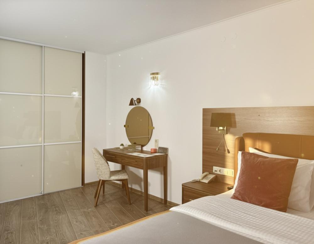 К вашим услугам представлены восемь номеров улучшенной категории ДЖУНИОР СЮИТ. Номера площадью от 26 до 38 квадратных метров идеально подходят как для индивидуального размещения, так и для проживания вдвоем. Возможно размещение третьего гостя. Для максимального комфорта гостей каждый номер оборудован всем необходимым: бесплатный Wi-Fi, кондиционер, цифровое ТВ (Smart TV), надежный сейф, кофейный уголок, бутилированная вода, косметические и другие необходимые принадлежности. Функциональное зонирование номера на прихожую, спальню и рабочее место Большая двуспальная кровать или две односпальные кровати Прикроватные тумбочки Письменный стол и стул Платяной шкаф Сейф Чайная станция, кофемашина Nespresso, наборы чая и кофе Ванная комната с окном, теплым полом, тропическим душем, биде Халат и тапочки, комплект полотенец Фен, набор туалетных принадлежностей Телефон Телевизор Кондиционер Мини-бар Яндекс Станция Wi-Fi Шторы blackout