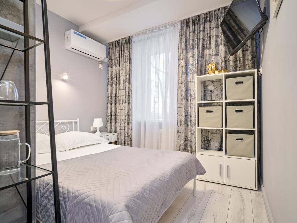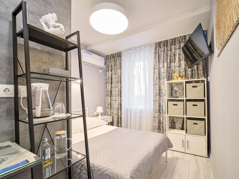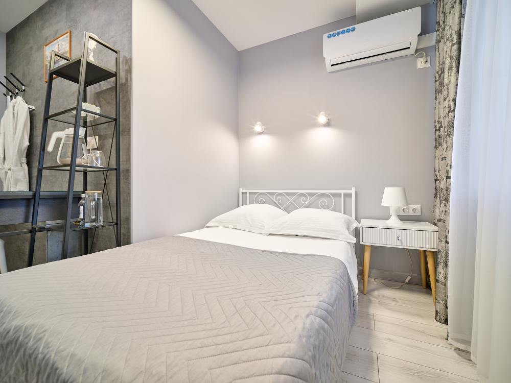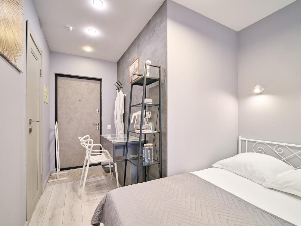 Стандартный номер с кроватью размера «king-size», завтрак включен в стоимость номера Добро пожаловать в наш номер площадью 17 м² с одной удобной кроватью среднего размера с ортопедическим матрасом и белоснежным хлопковым бельем. В собственной ванной комнате для Вас предоставлены: -Многофункциональная душевая кабина -Туалет -Полотенца 3шт -Гель для душа, шампунь, жидкое мыло, кондиционер, лосьон для тела, расческа, зубной и бритвенные наборы, губка для обуви -Тапочки одноразовые В номере также доступны: -Высокоскоростной Wi-Fi -Кондиционер -Рабочий стол, стул -Вода в графине, стаканы Электрический чайник, чайная пара, чай, сахар -Телевизор с плоским экраном -Вешалка напольная Курение в отеле запрещено Будем рады принять Вас в нашем отеле!
