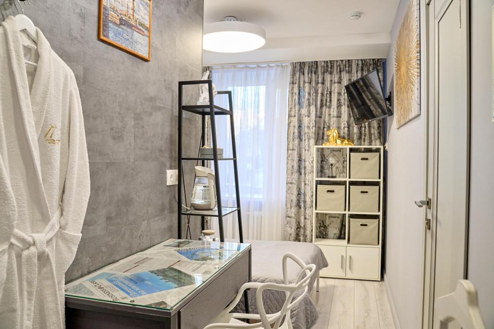 Стандартный одноместный номер, завтрак включен в стоимость номера Санузел находится рядом с номером Откройте двери в наш оригинальный, артистичный номер с площадью 17 м² и насладитесь отличным отдыхом. Удобная кровать шириной 150см с ортопедическим матрасом и белоснежным, гипоаллергенным постельным бельем из страйп-сатина обеспечат вам приятный и спокойный сон. В номере для Вас предусмотрены: -Быстрый Wi-Fi -Кондиционер -Спутниковое ТВ -Чайная зона с электрическим чайником, чайной парой, чай, сахар -Вода в графине, стаканы -Вешалка напольная -Теплый халат -Мягкие полотенца 3шт - Расширенный гигиенический набор: гель для душа, шампунь, кондиционер для волос, лосьон для тела, зубной и бритвенные наборы, расческа, губка для обуви. - Тапочки одноразовые Ростовое зеркало Из номера Вам откроется панорамный вид на центральную улицу города и липовую аллею. Парковка: Бесплатная Курение: запрещено Будем рады принять Вас в нашем отеле!