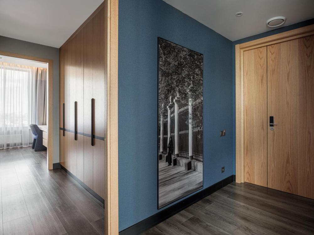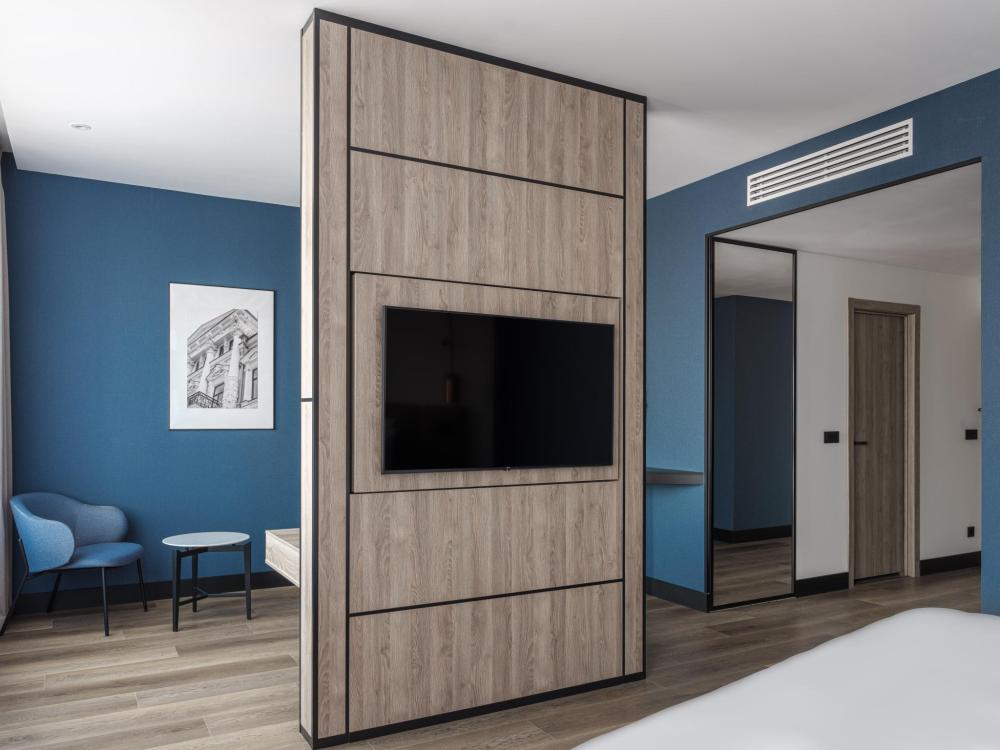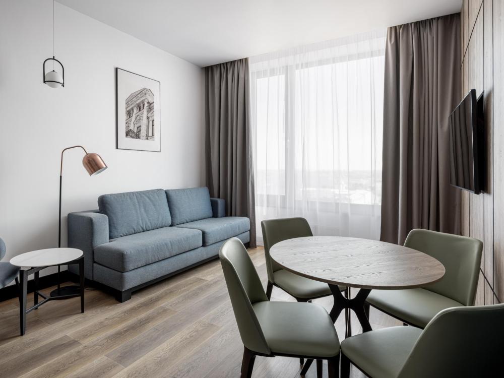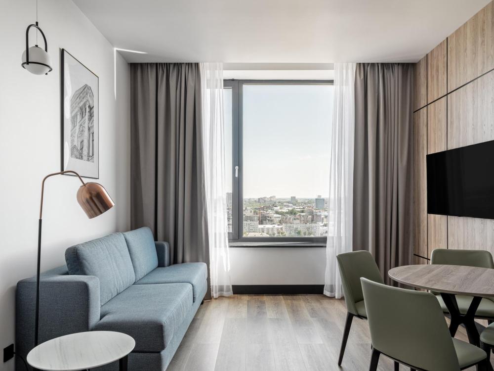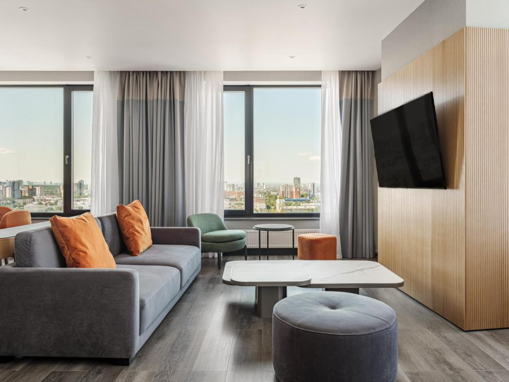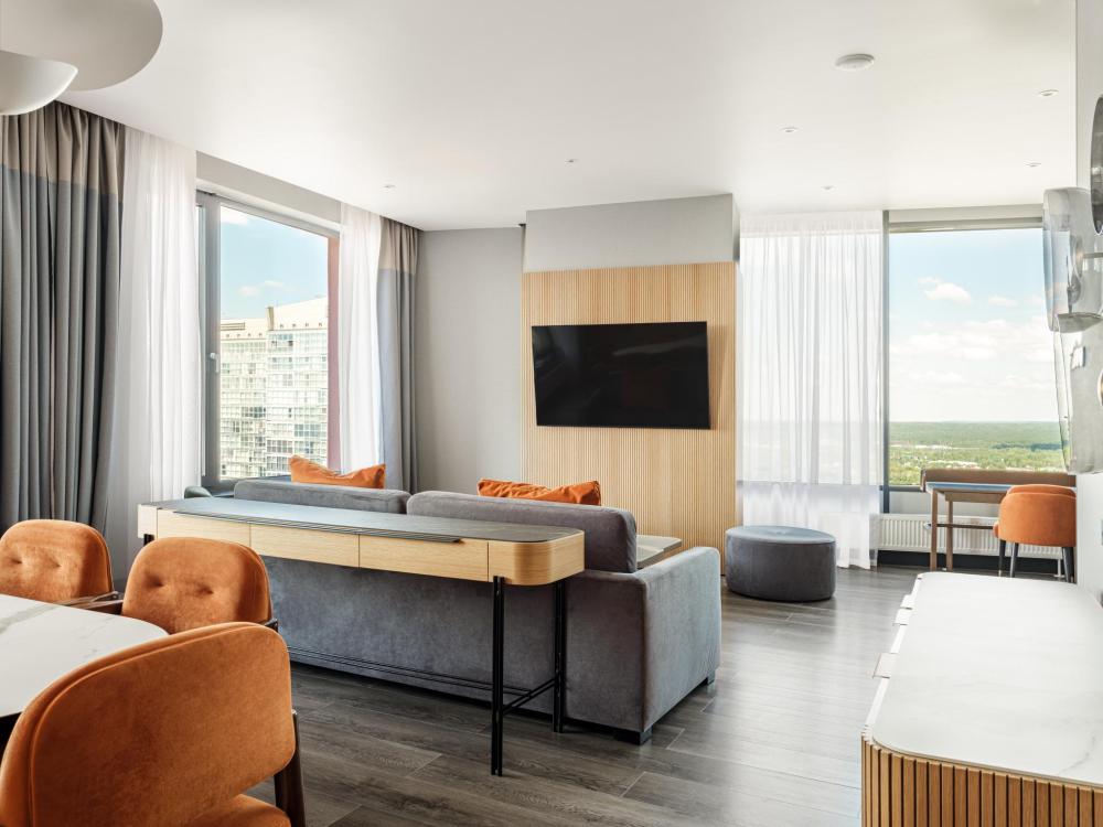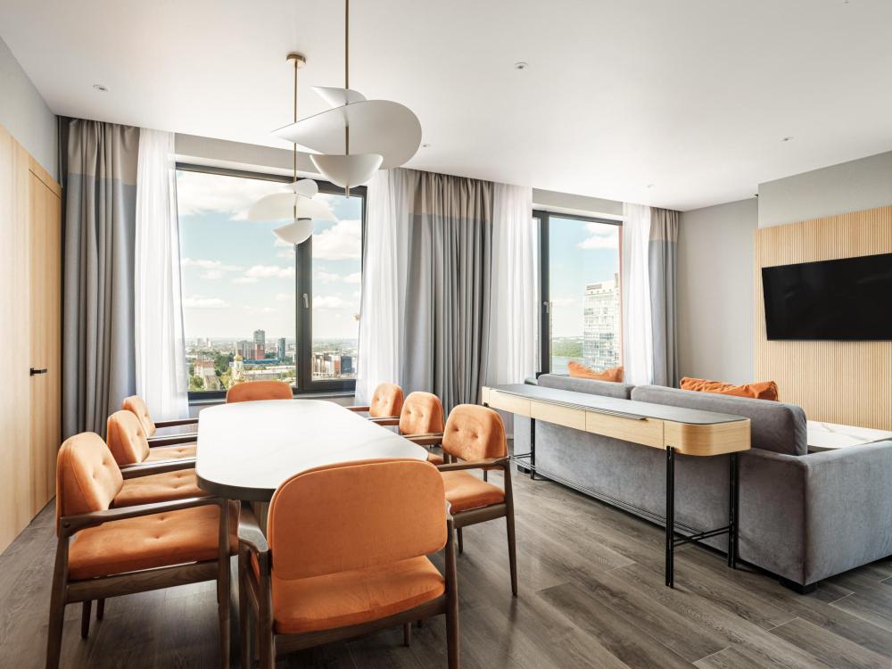 Из окон просторных Представительских люксов на верхнем этаже открывается потрясающий вид на город. Номер состоит из спальни и гостиной и современного санузла. В спальне гостей ждет просторная двуспальная кровать, телевизор, рабочее место. В гостиной расположен диван, обеденная зона, телевизор. В номере доступны дополнительные спальные места.