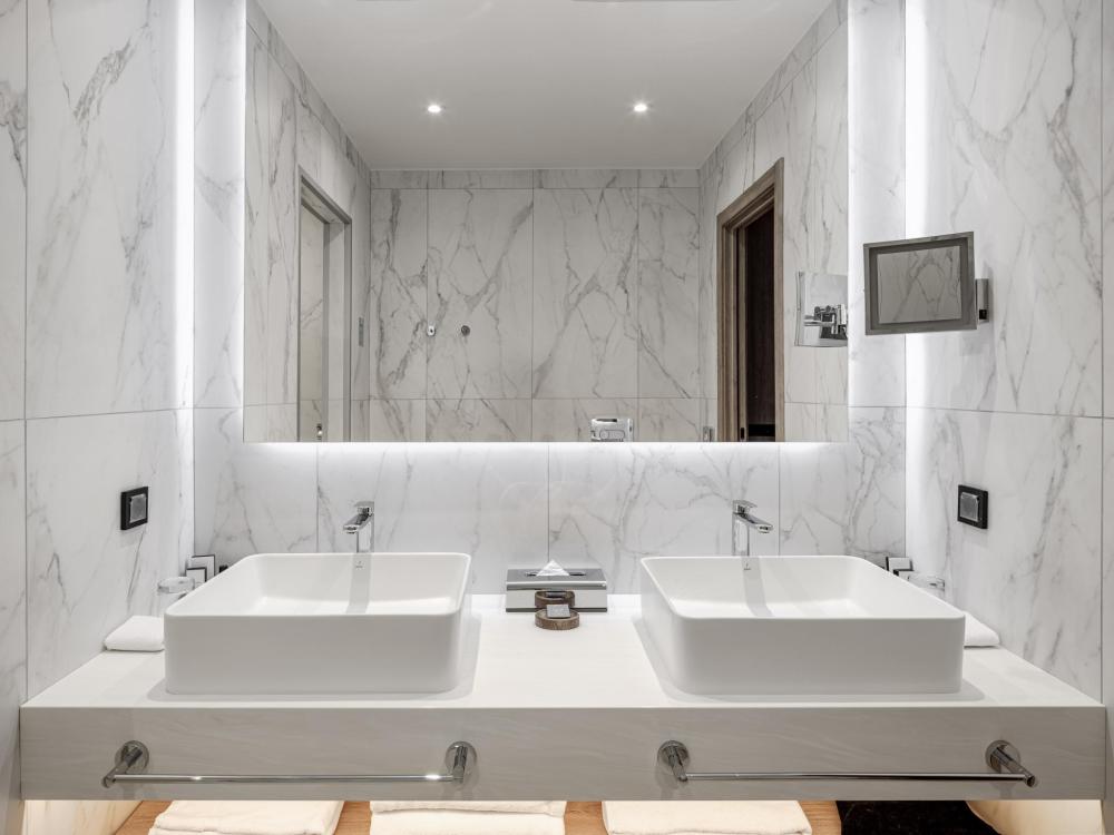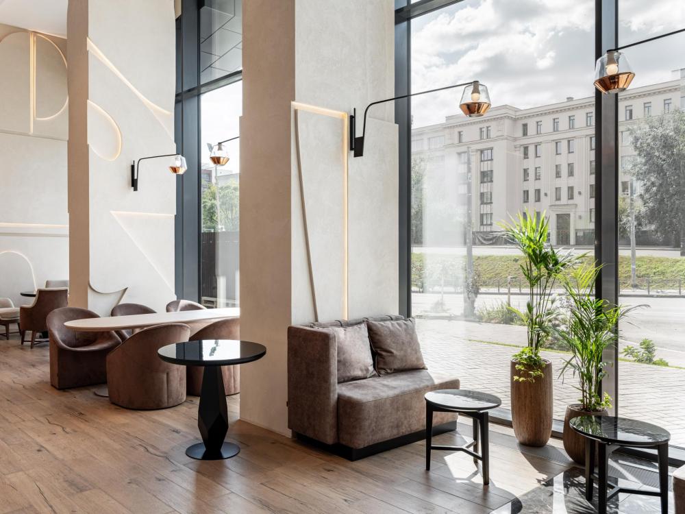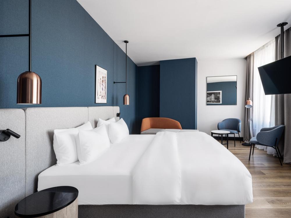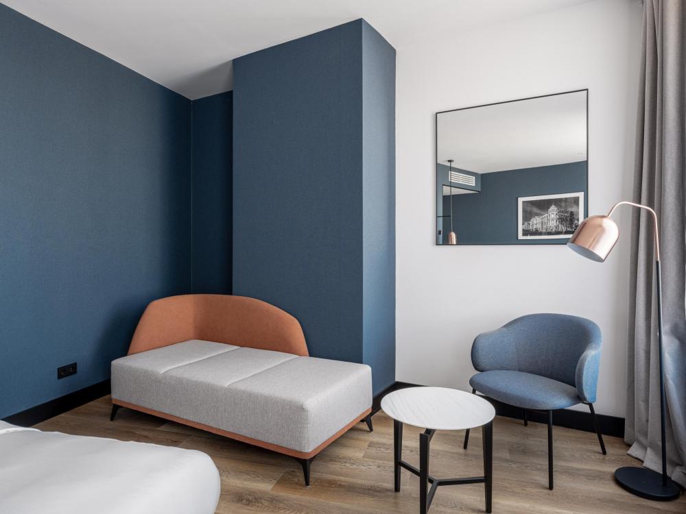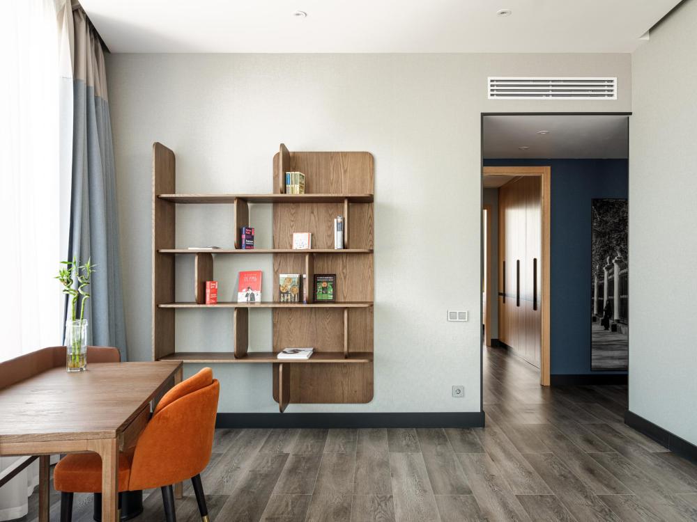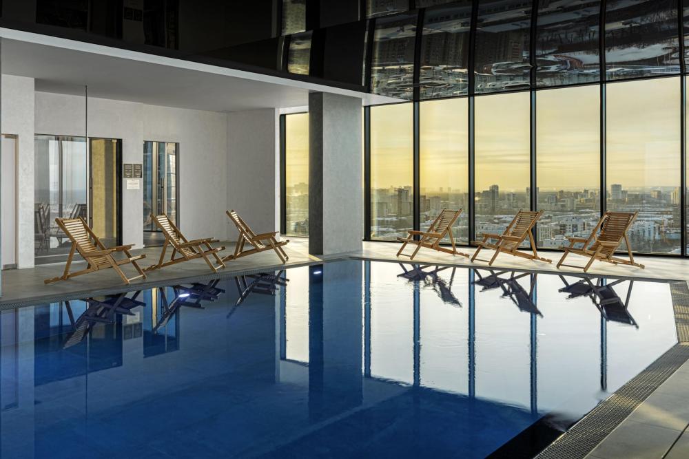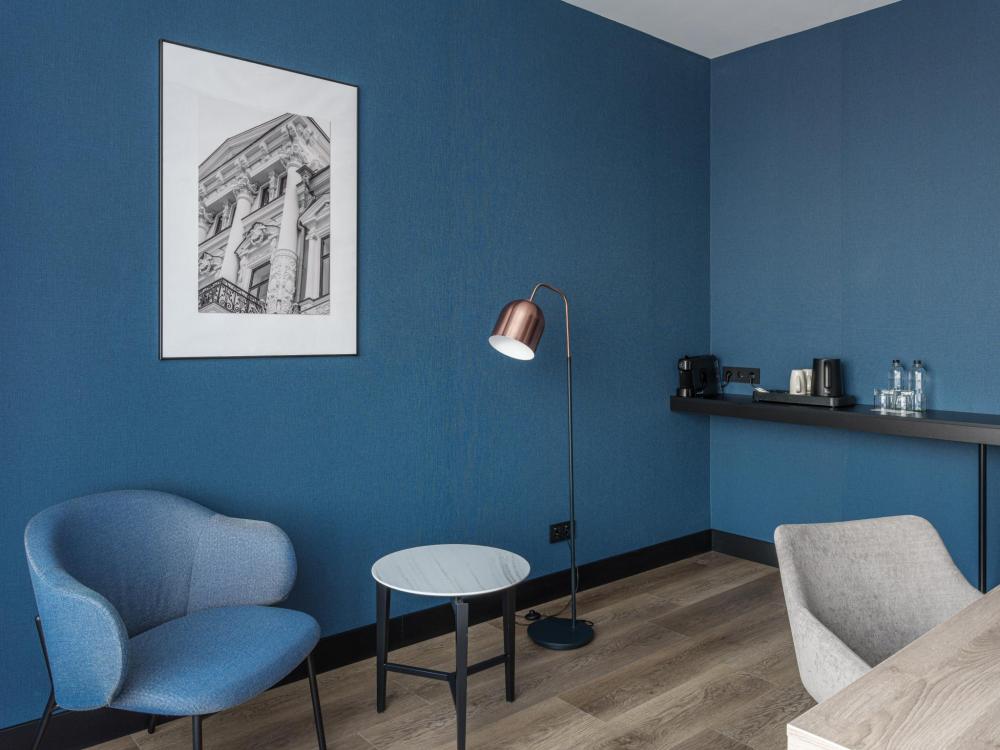 Из окон просторных Представительских люксов на верхнем этаже открывается потрясающий вид на город. Номер состоит из спальни и гостиной и современного санузла. В спальне гостей ждет просторная двуспальная кровать, телевизор, рабочее место. В гостиной расположен диван, обеденная зона, телевизор. В номере доступны дополнительные спальные места.