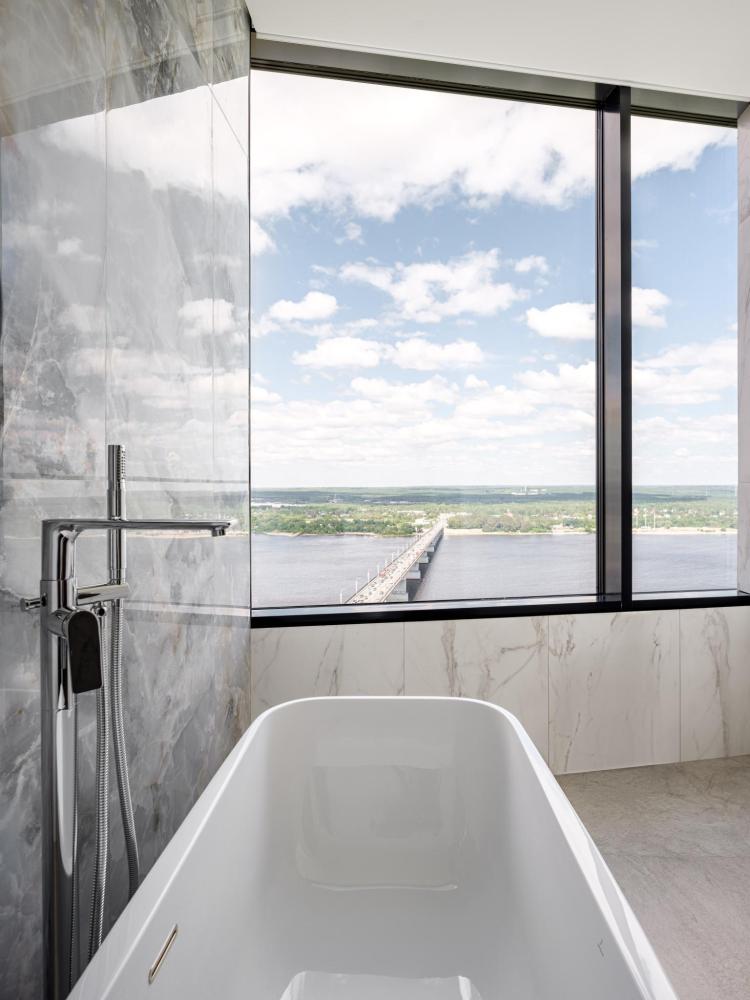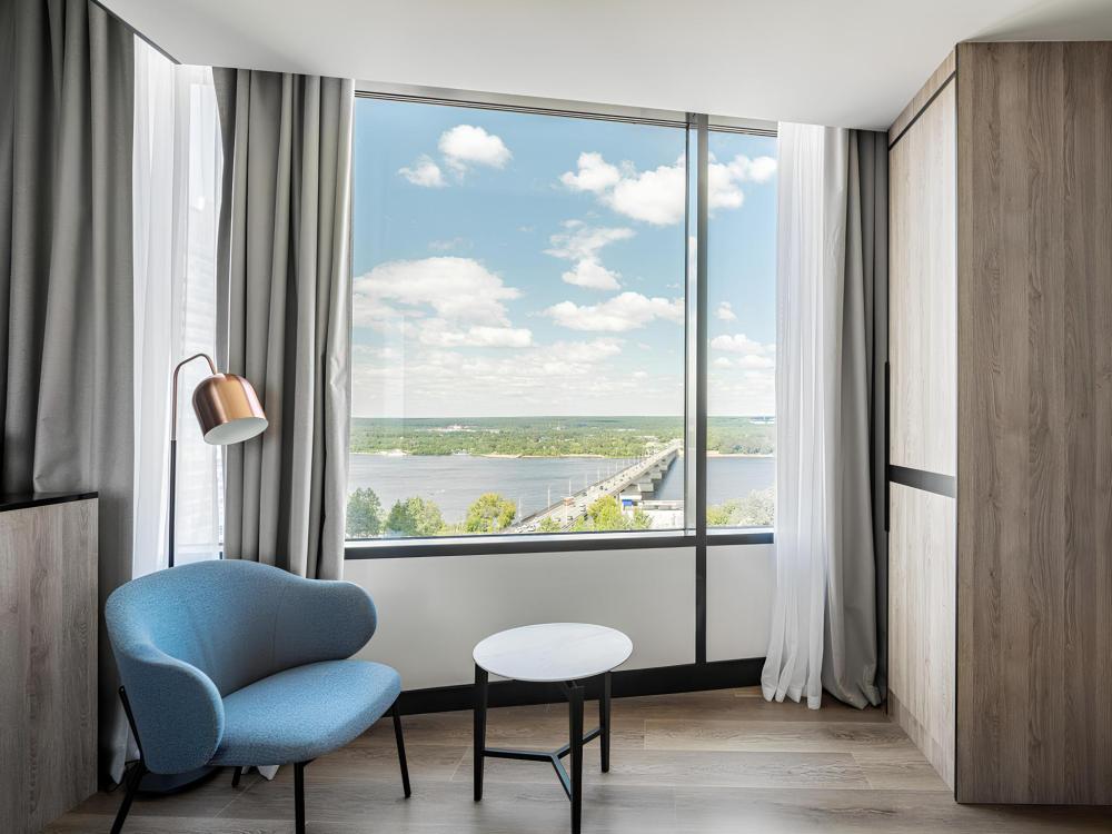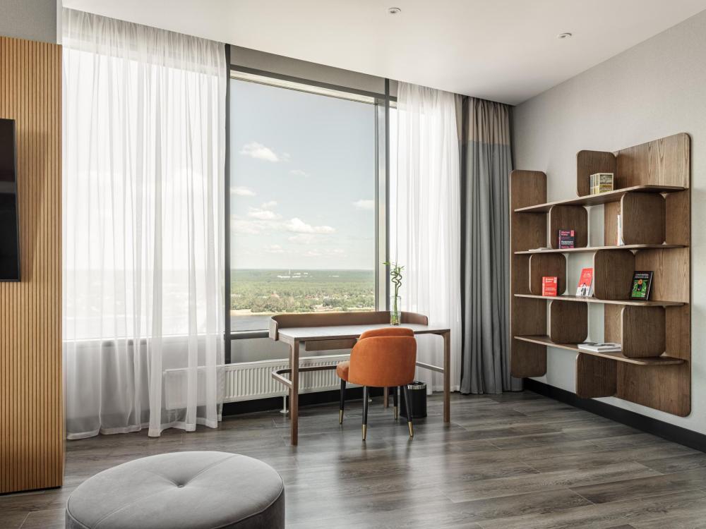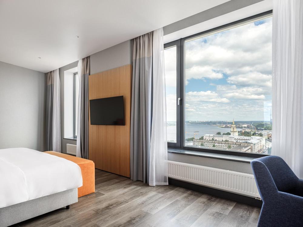 В Президентском люксе из всех комнат и ванной открывается вид на реку Каму. Этот элегантный люкс оформлен в современном скандинавском стиле и обставлен удобной мебелью. Просторный номер включает в себя спальню с двуспальной кроватью, гостиную, обеденную и кухонную зоны, а также современную ванную комнату с панорамными окнами.