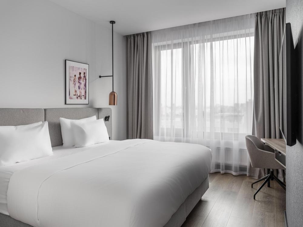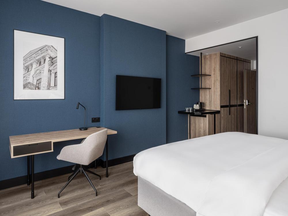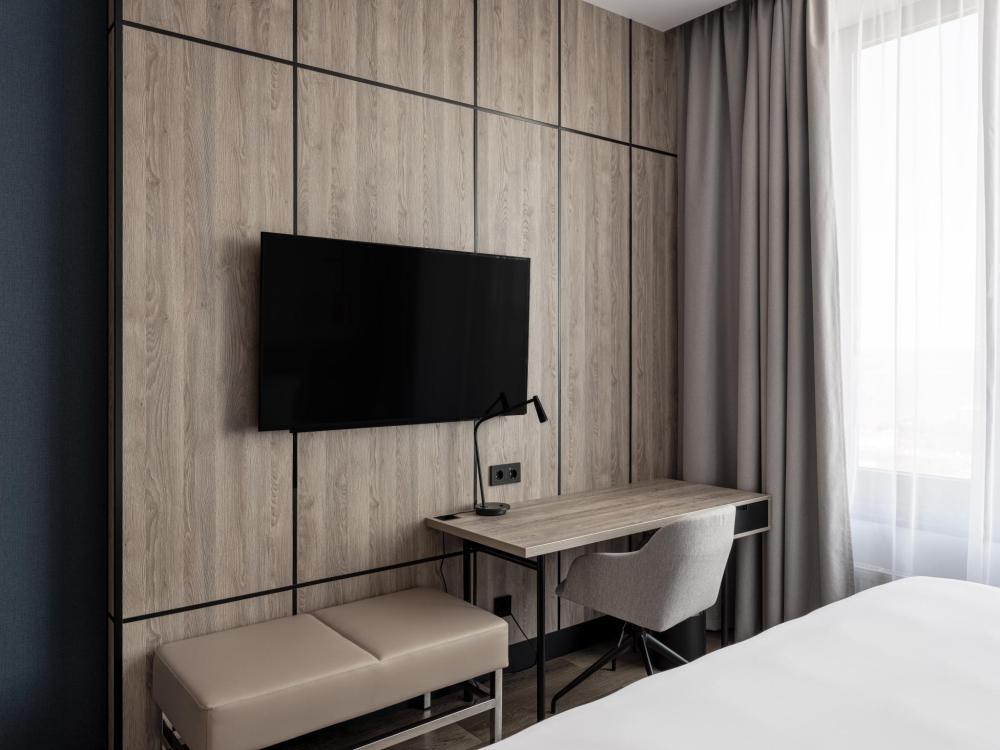 Номер категории Стандарт, оборудованный всем необходимым для комфортного проживания. В номере: двуспальная или две односпальные кровати, телевизор, рабочее место, чайная станция, современный санузел с душем.