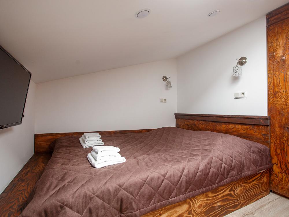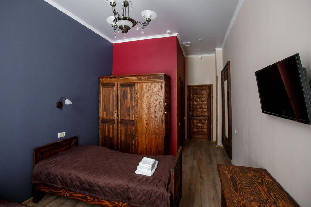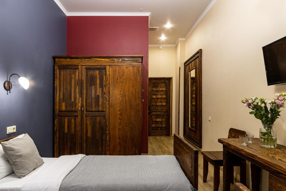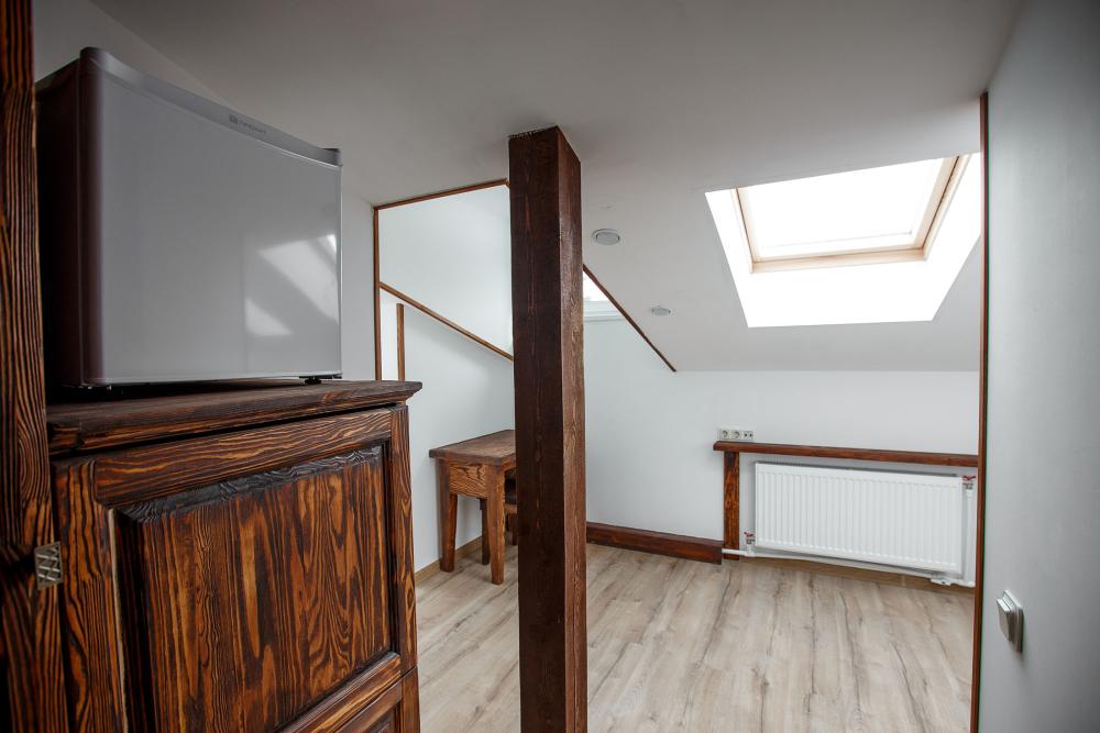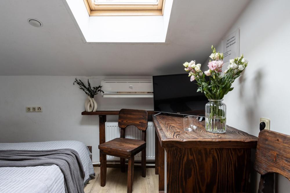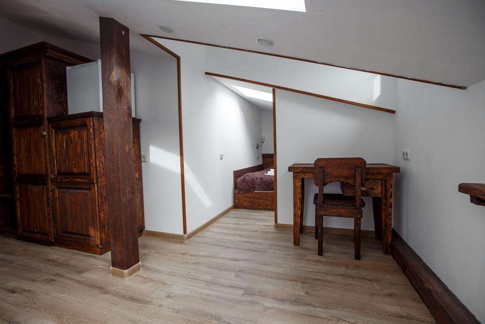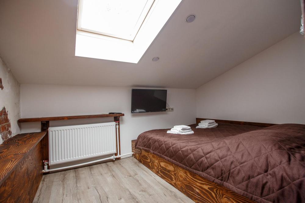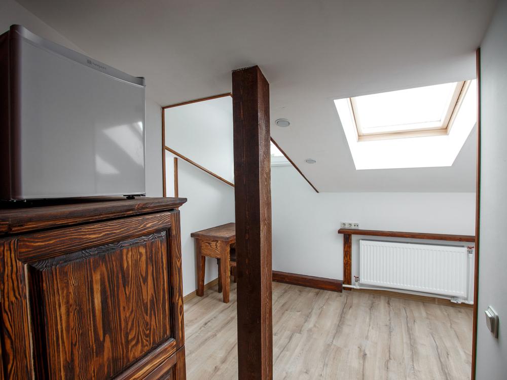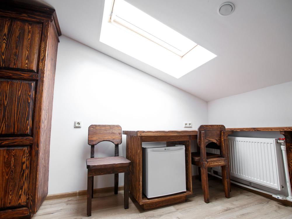 В номере есть одна двуспальная кровать и мини-диван, письменный стол, стул,шкаф для одежды, телевизор, холодильник, минибар, ванные принадлежности( одноразовые: зубная щетка, зубная паста, шампунь, гель для душа, тапочки), фен, душевая кабина и туалет, утюг и гладильная доска на ресепшене. Один из номеров мансардный.