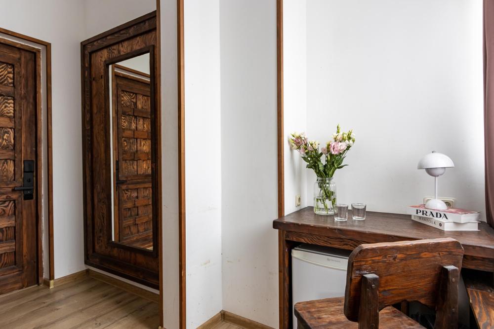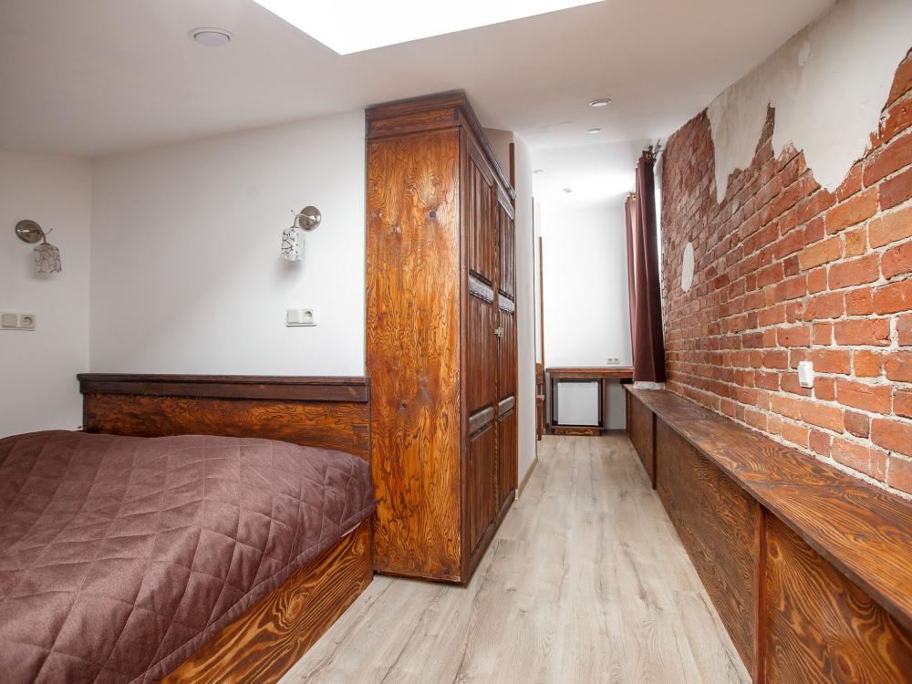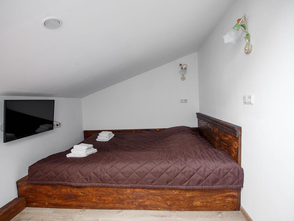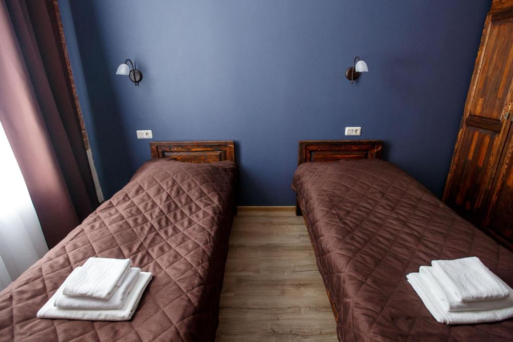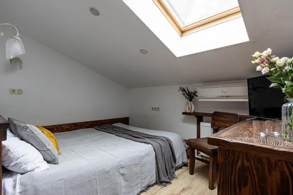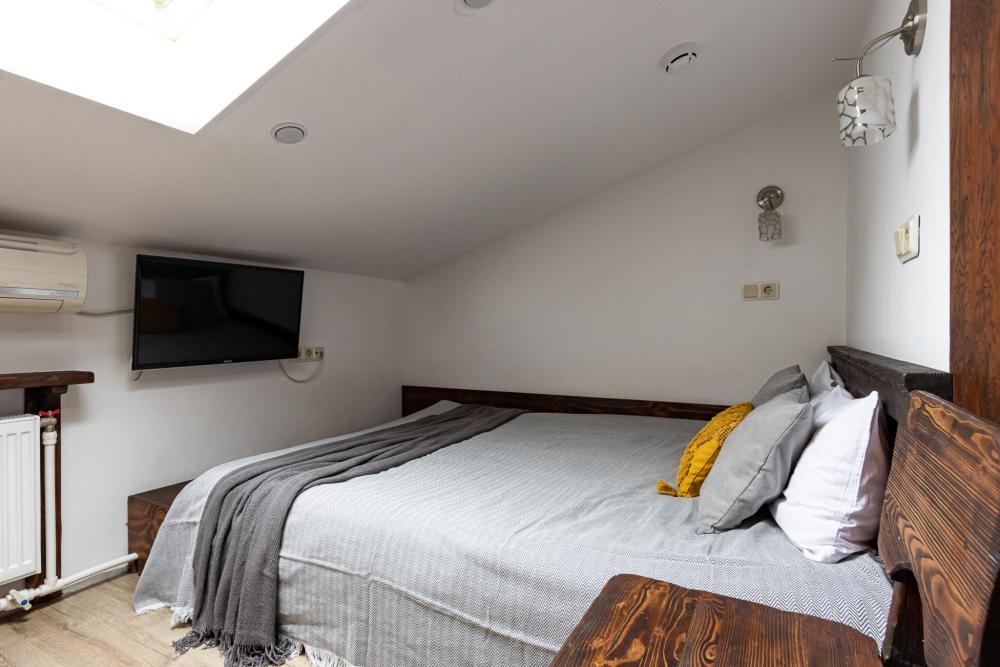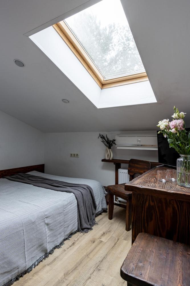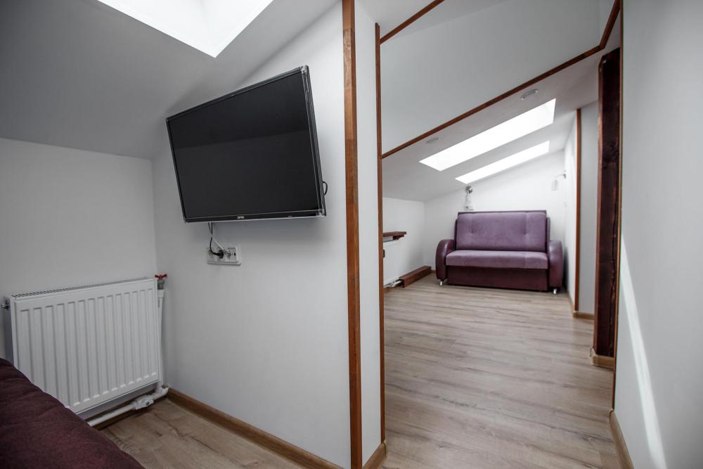 В номере есть одна двуспальная кровать и мини-диван, письменный стол, стул,шкаф для одежды, телевизор, холодильник, минибар, ванные принадлежности( одноразовые: зубная щетка, зубная паста, шампунь, гель для душа, тапочки), фен, душевая кабина и туалет, утюг и гладильная доска на ресепшене. Один из номеров мансардный.