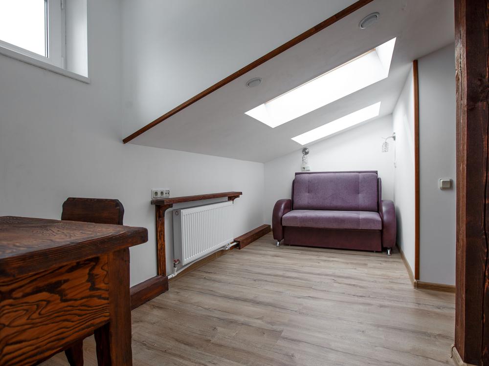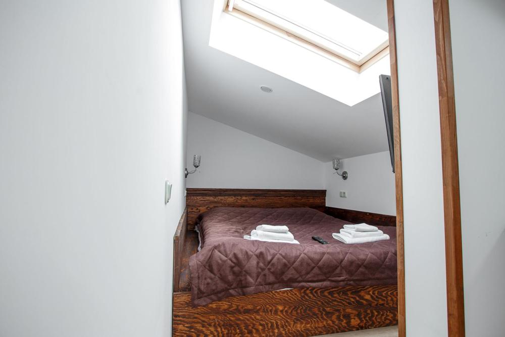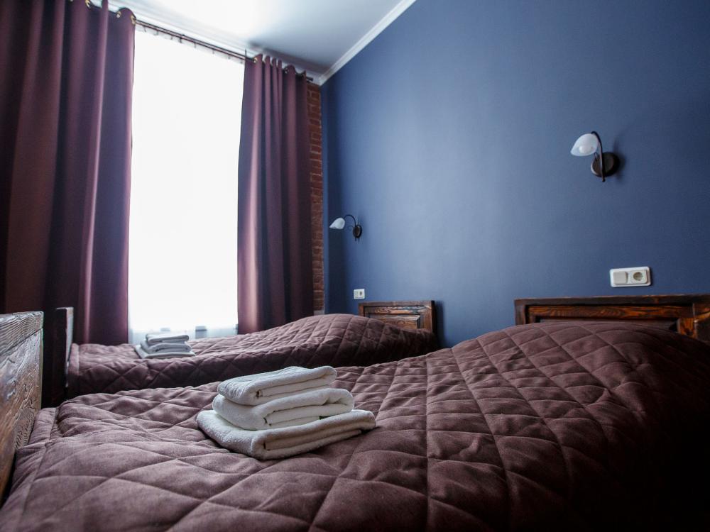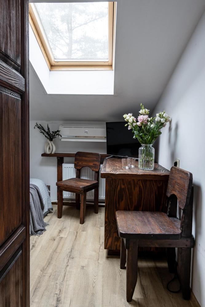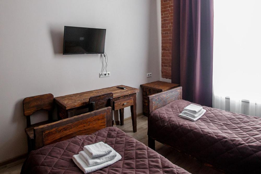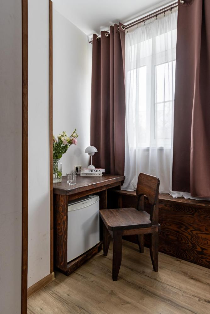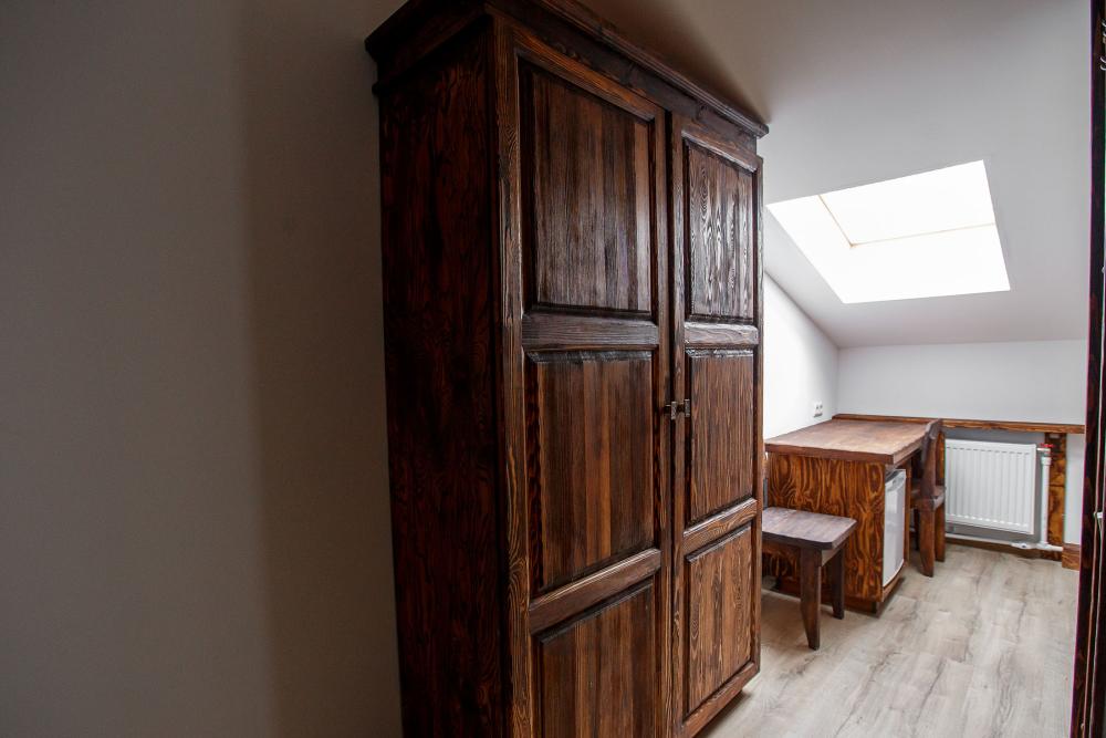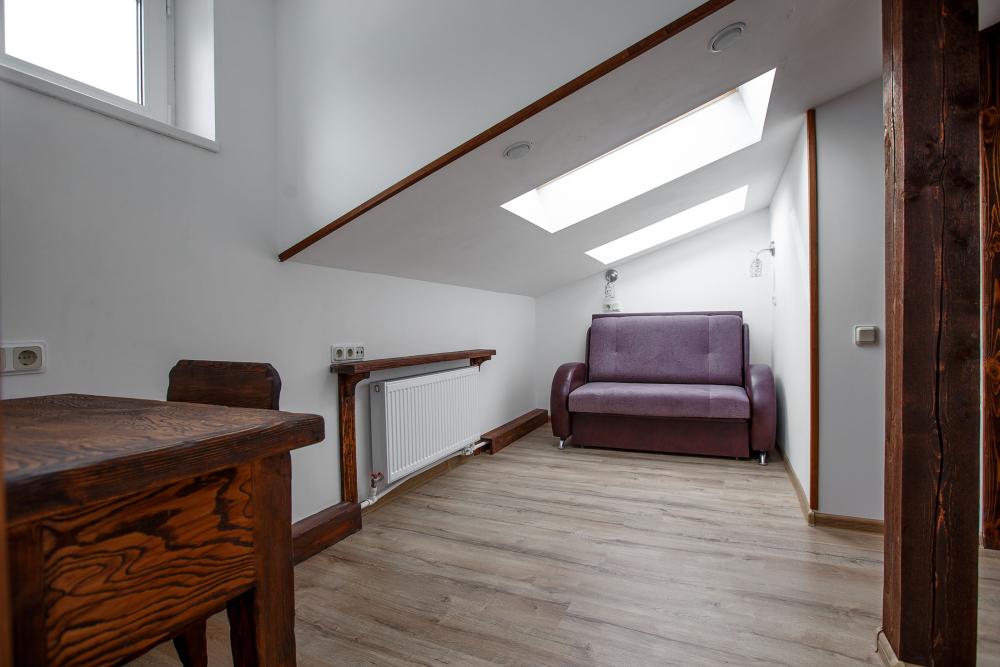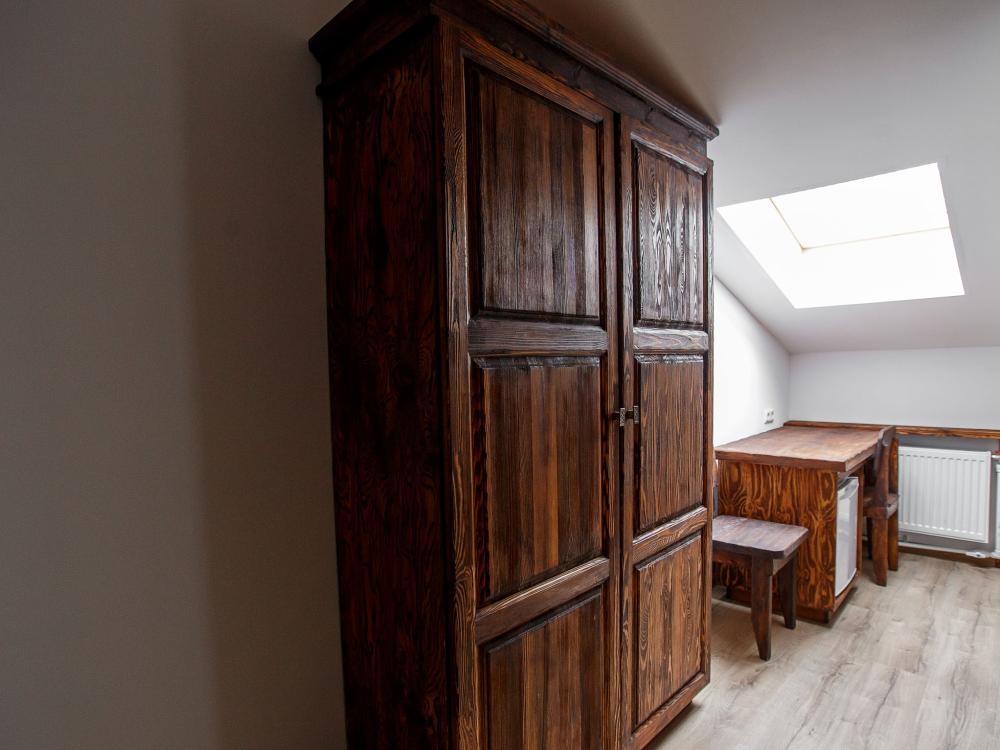 В номере есть одна двуспальная кровать и мини-диван, письменный стол, стул,шкаф для одежды, телевизор, холодильник, минибар, ванные принадлежности( одноразовые: зубная щетка, зубная паста, шампунь, гель для душа, тапочки), фен, душевая кабина и туалет, утюг и гладильная доска на ресепшене. Один из номеров мансардный.