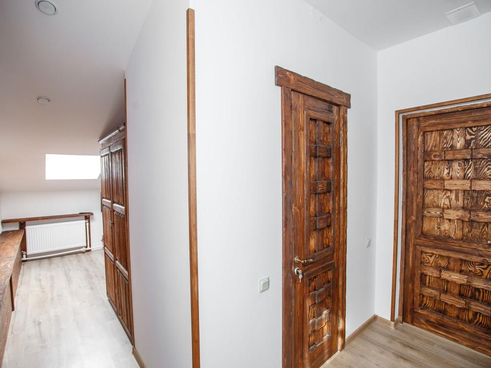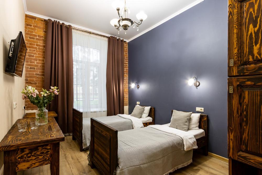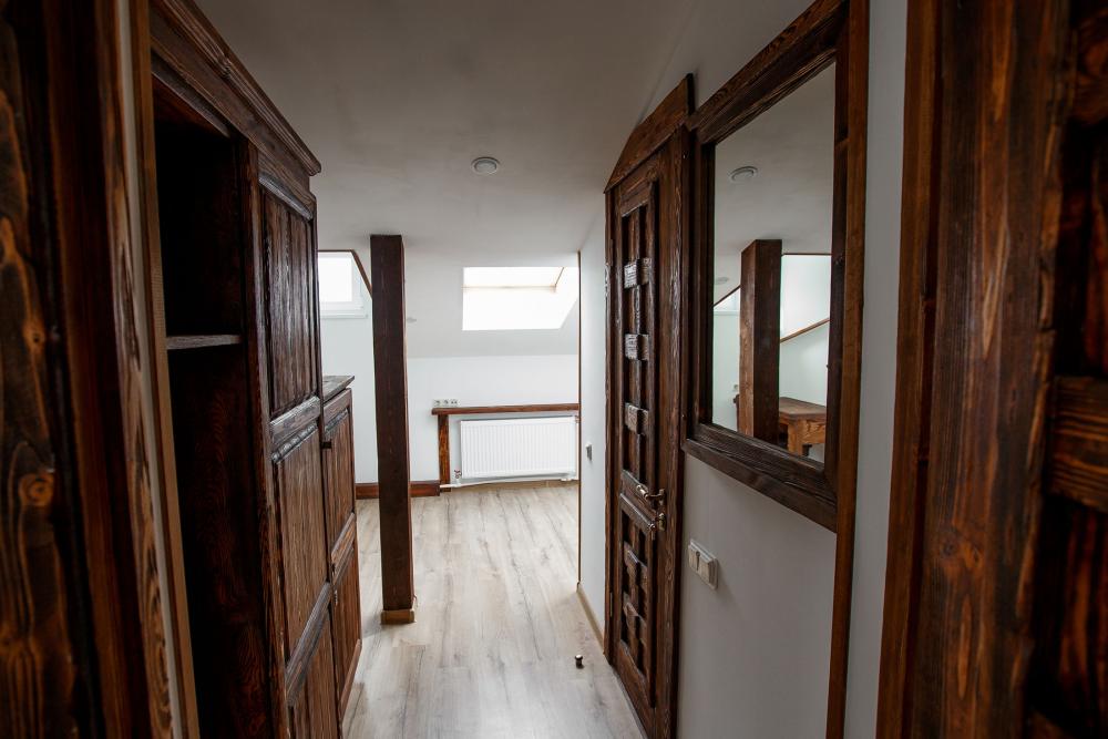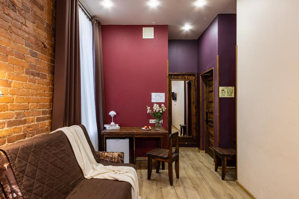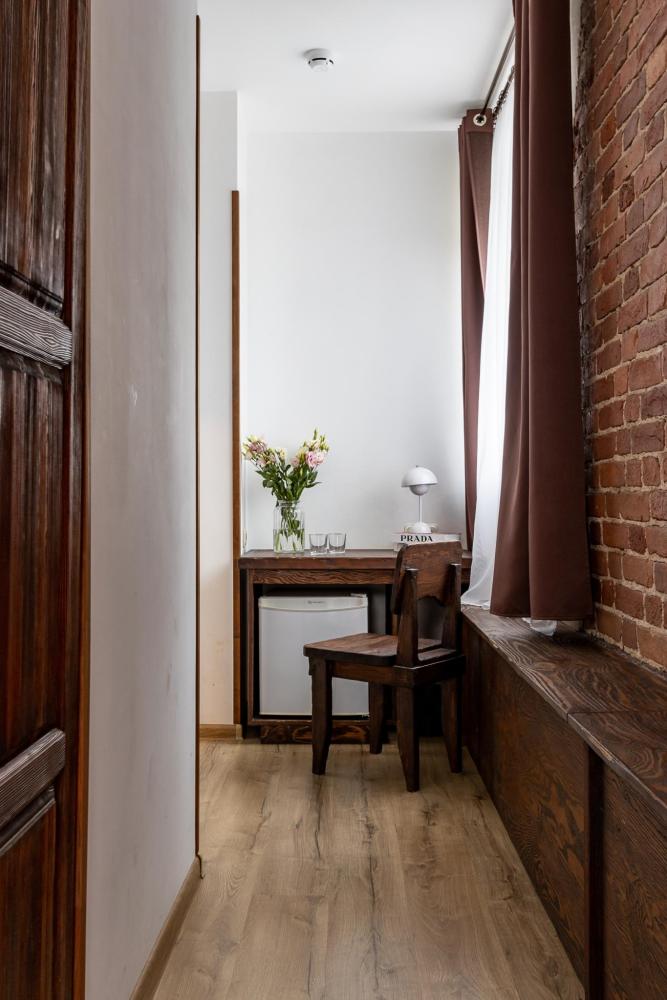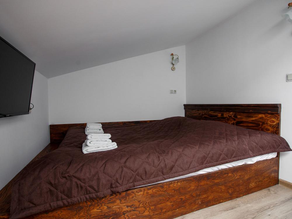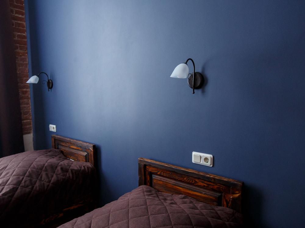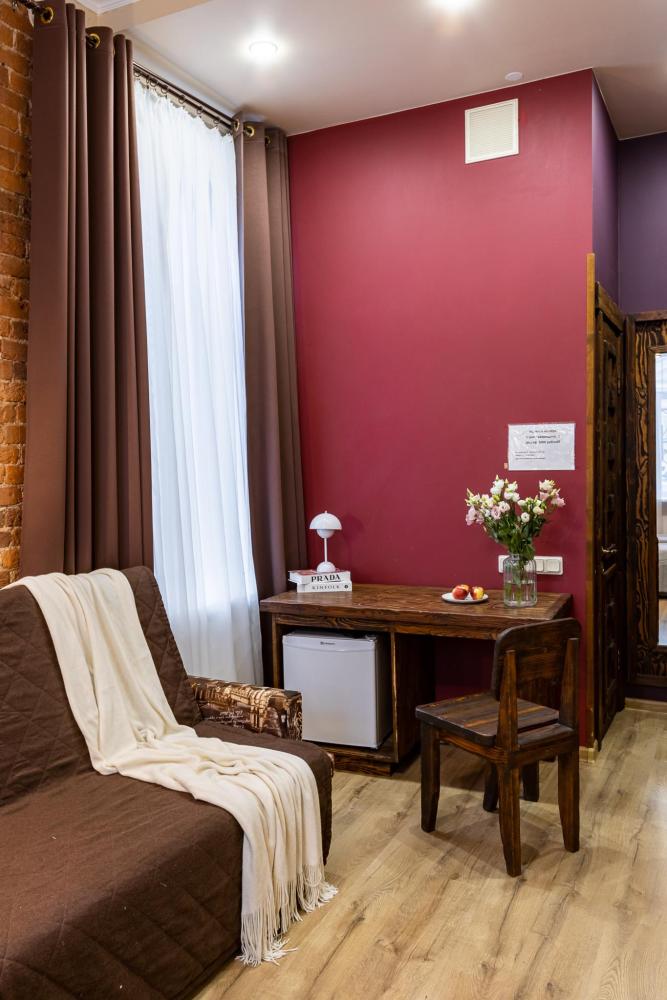 В номере есть одна двуспальная кровать и мини-диван, письменный стол, стул,шкаф для одежды, телевизор, холодильник, минибар, ванные принадлежности( одноразовые: зубная щетка, зубная паста, шампунь, гель для душа, тапочки), фен, душевая кабина и туалет, утюг и гладильная доска на ресепшене. Один из номеров мансардный.
