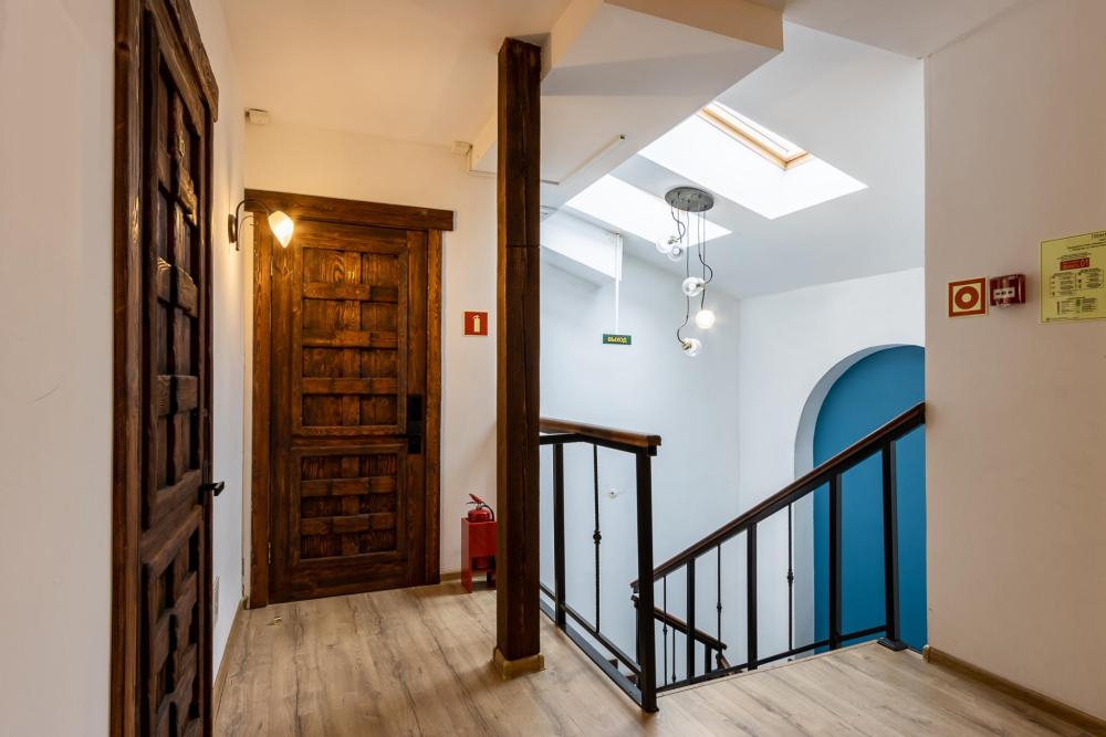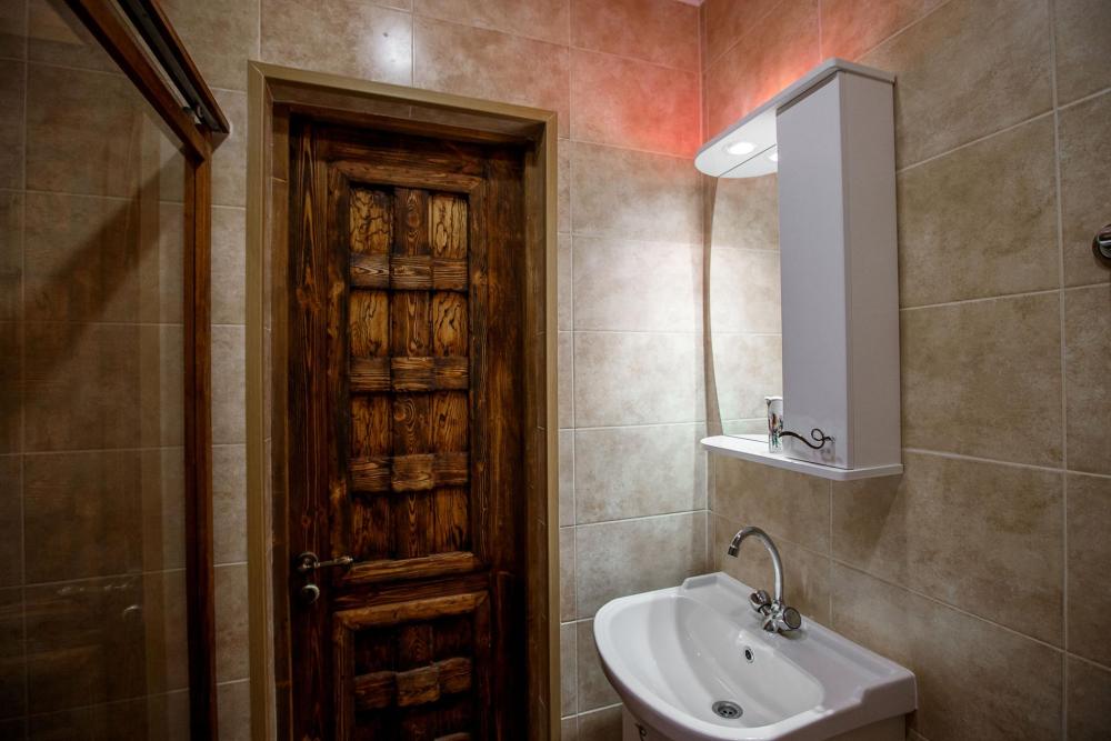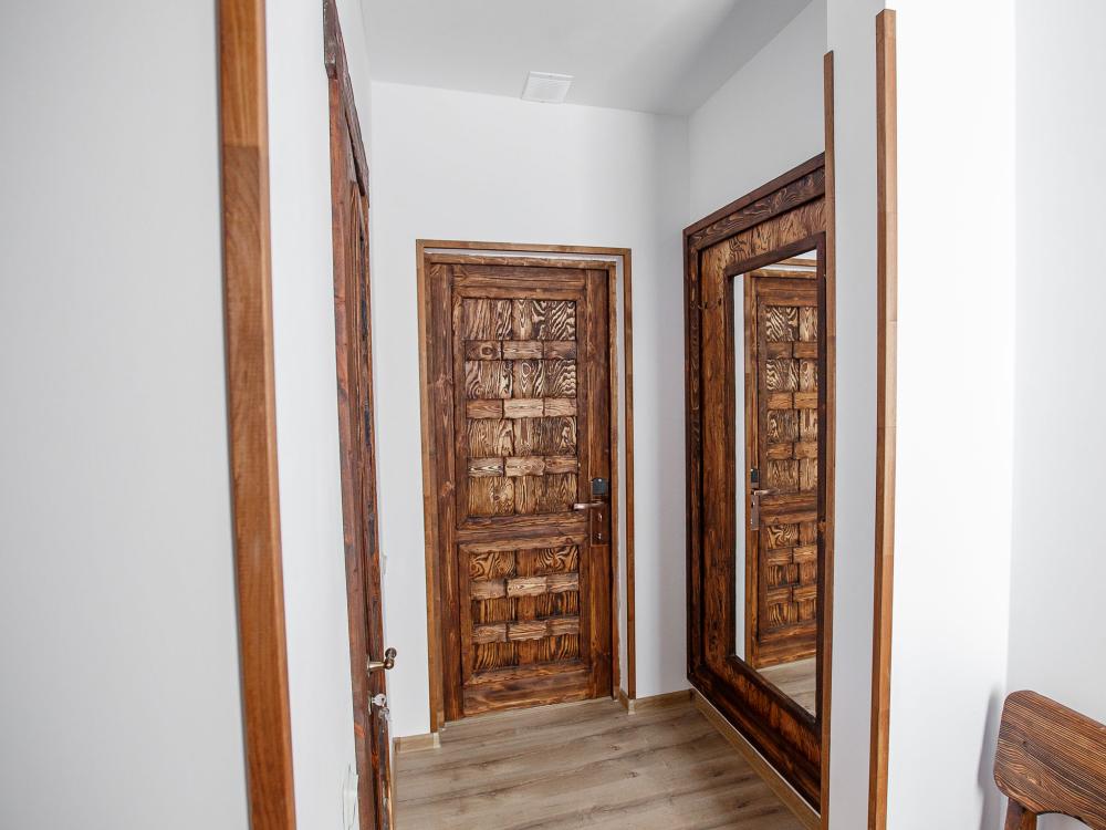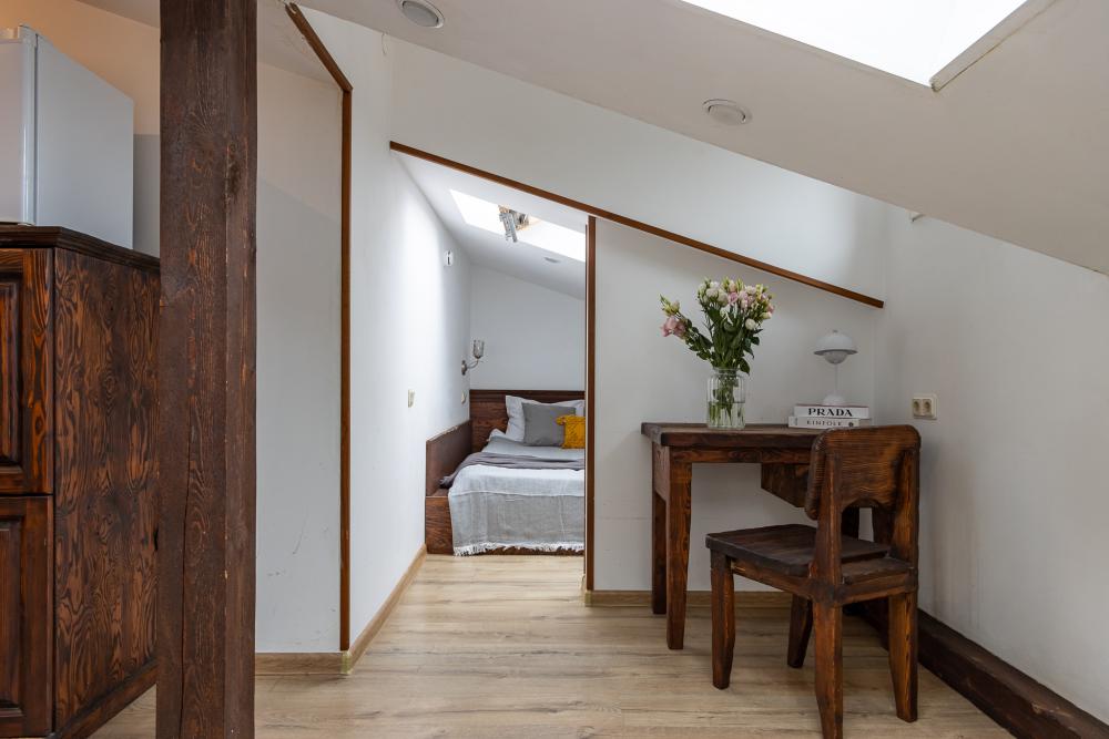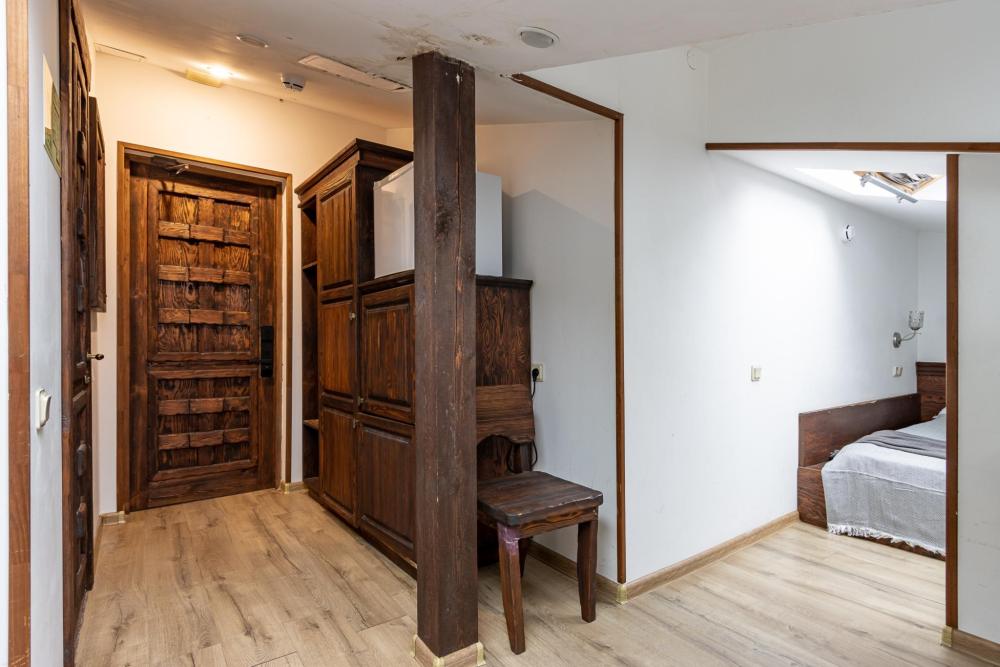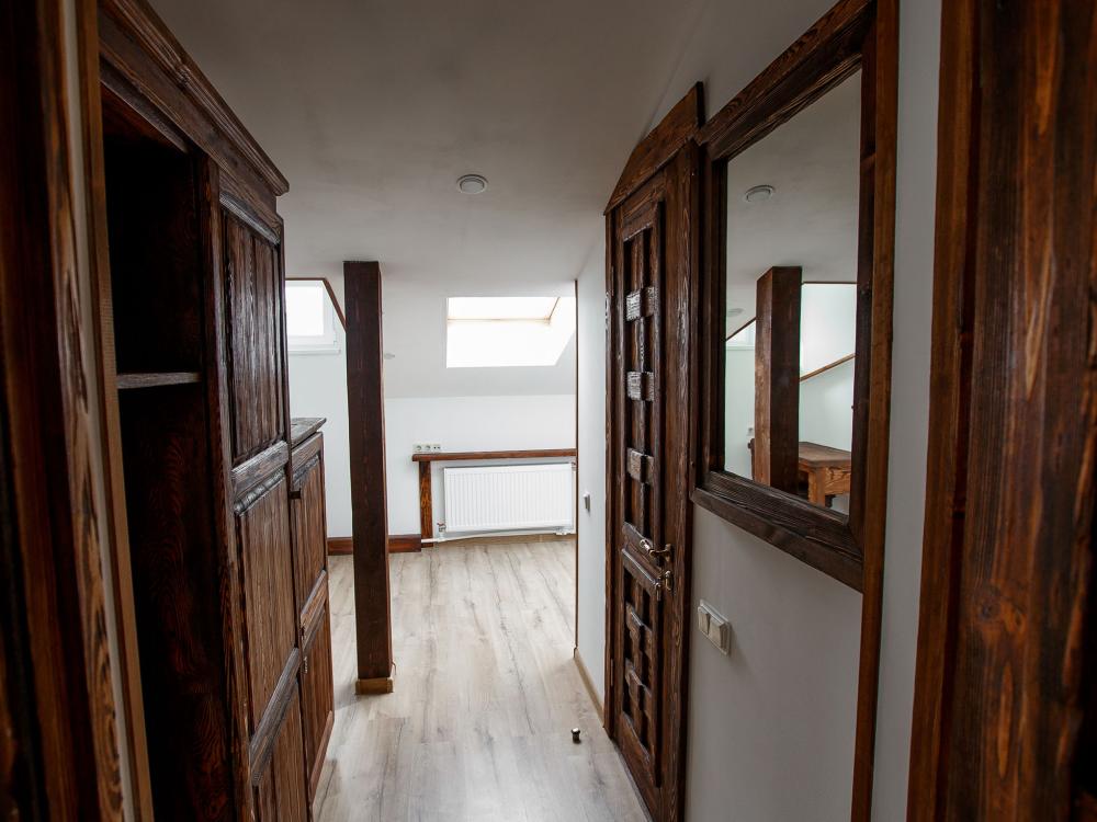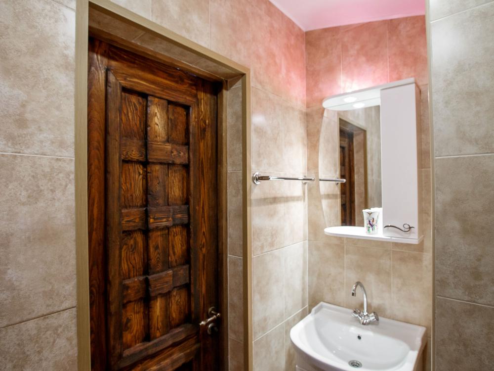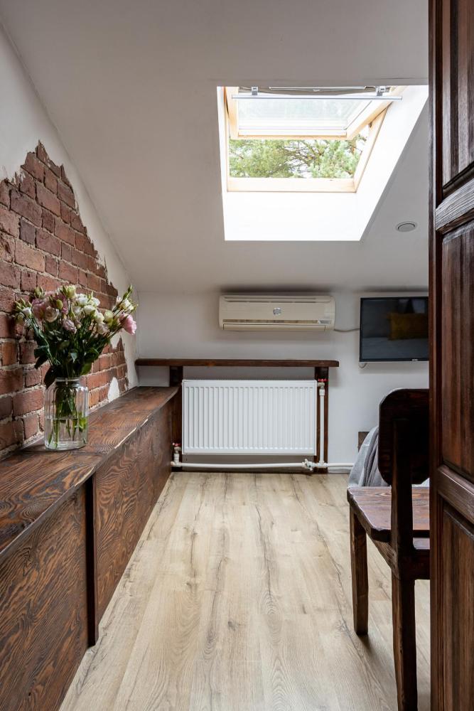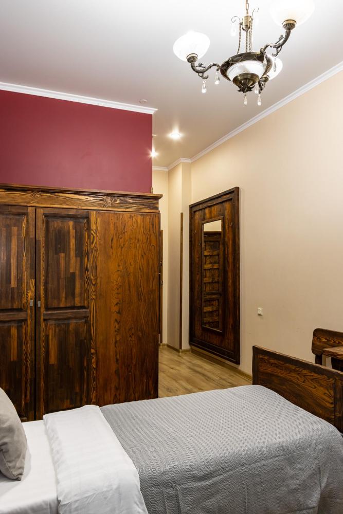 В номере есть одна двуспальная кровать и мини-диван, письменный стол, стул,шкаф для одежды, телевизор, холодильник, минибар, ванные принадлежности( одноразовые: зубная щетка, зубная паста, шампунь, гель для душа, тапочки), фен, душевая кабина и туалет, утюг и гладильная доска на ресепшене. Один из номеров мансардный.