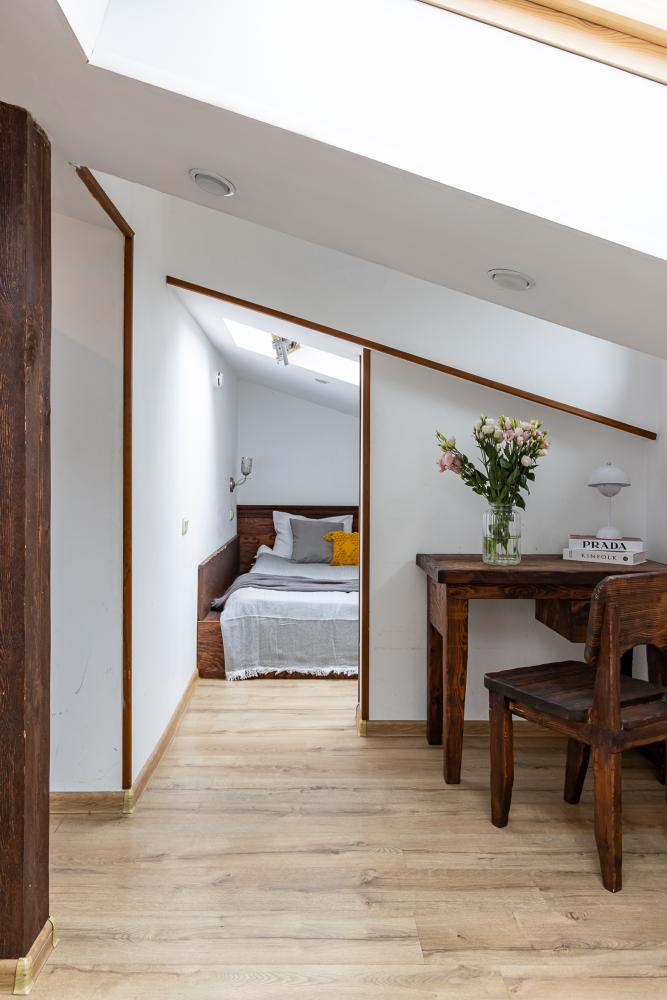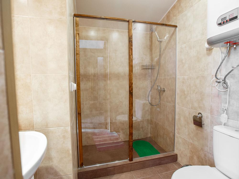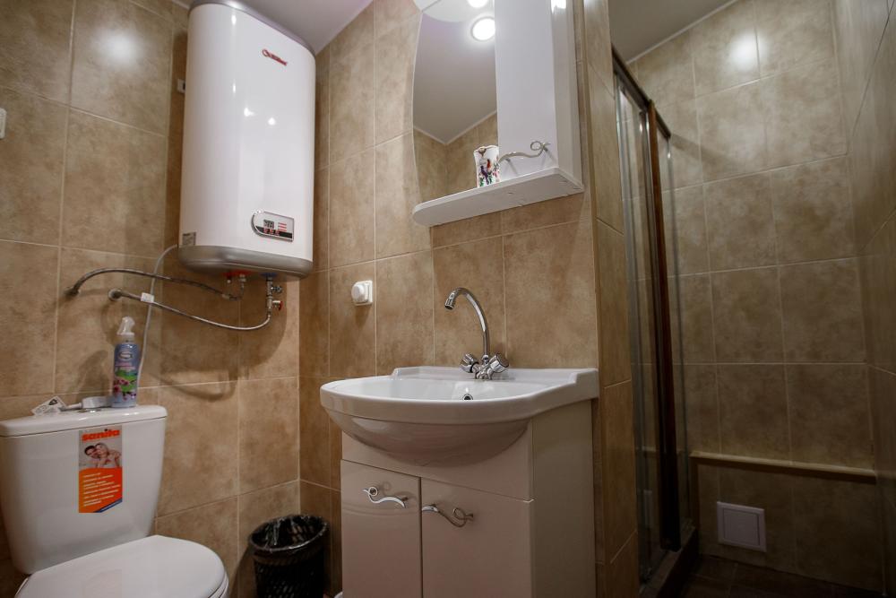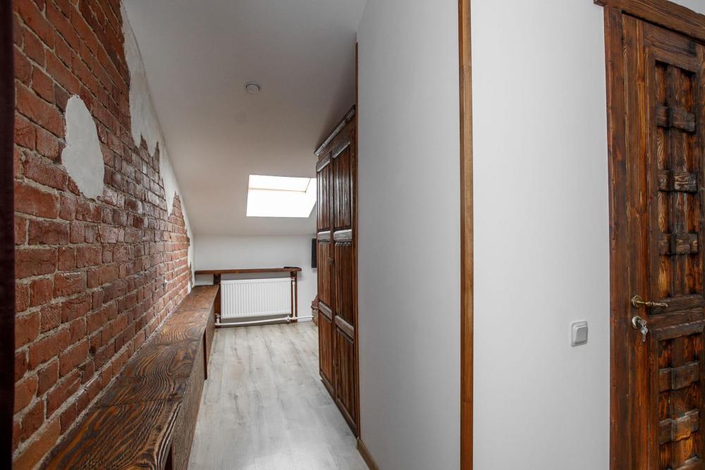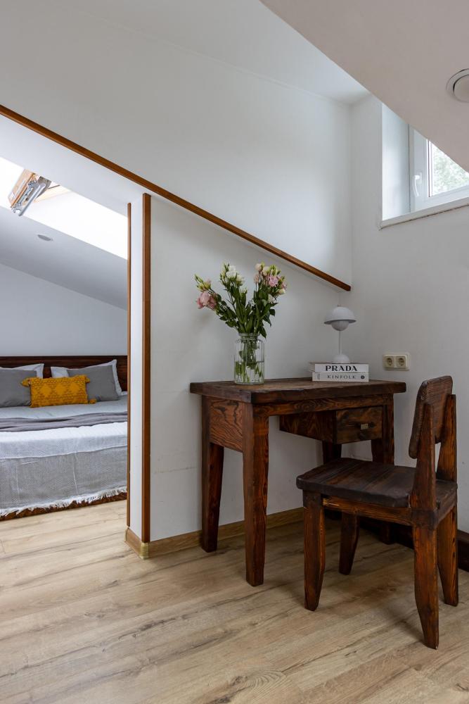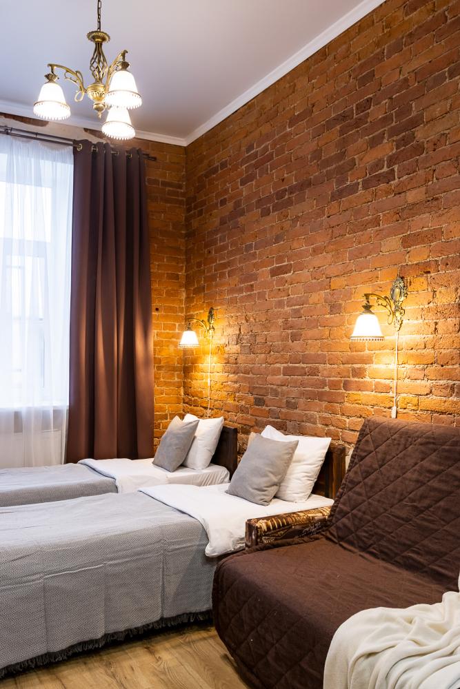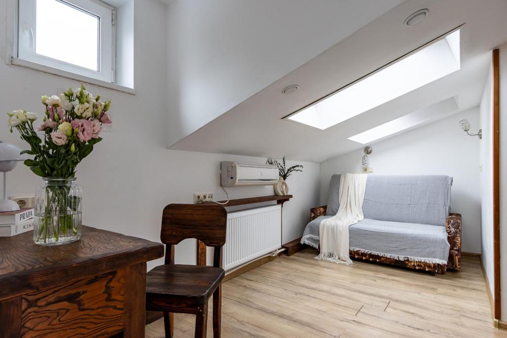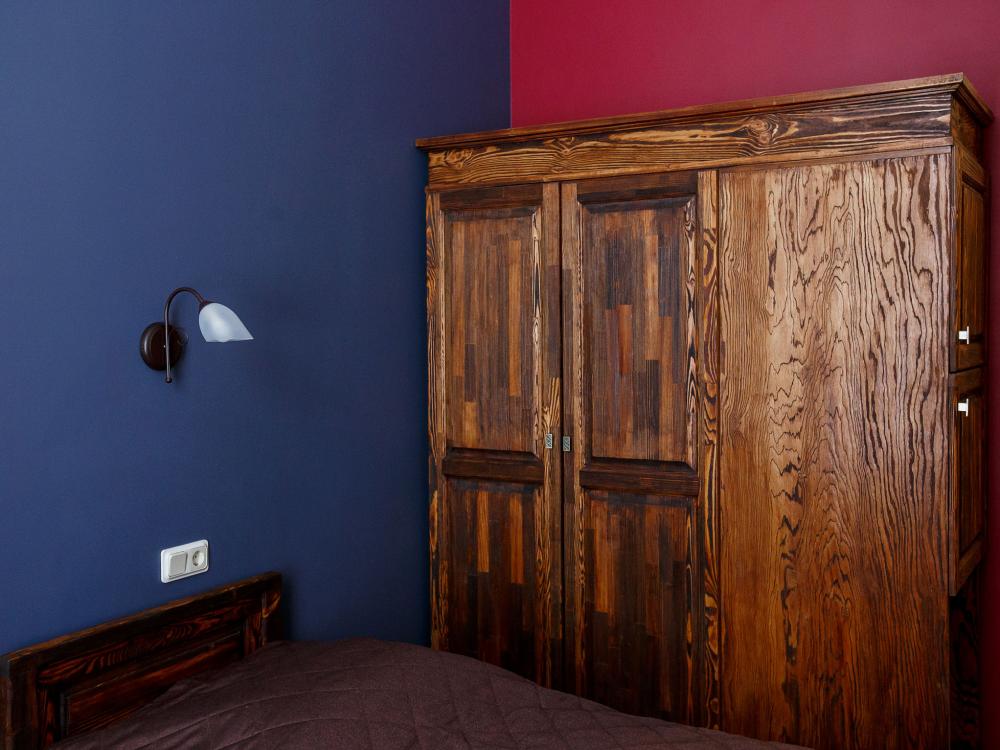 В номере есть одна двуспальная кровать и мини-диван, письменный стол, стул,шкаф для одежды, телевизор, холодильник, минибар, ванные принадлежности( одноразовые: зубная щетка, зубная паста, шампунь, гель для душа, тапочки), фен, душевая кабина и туалет, утюг и гладильная доска на ресепшене. Один из номеров мансардный.