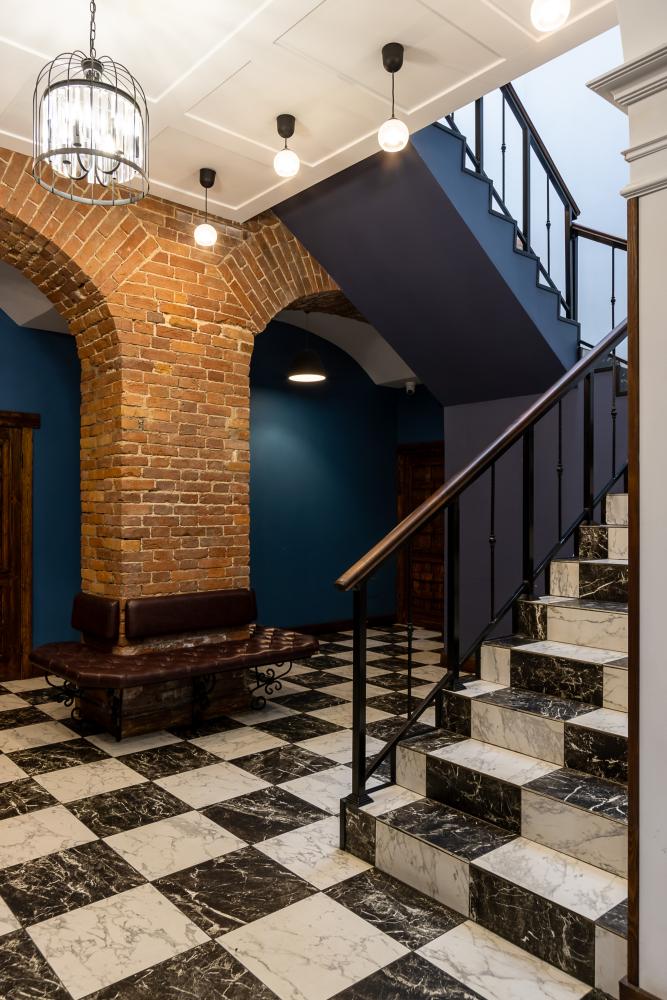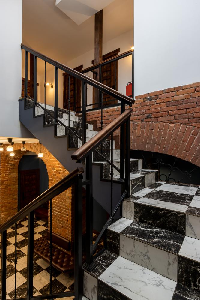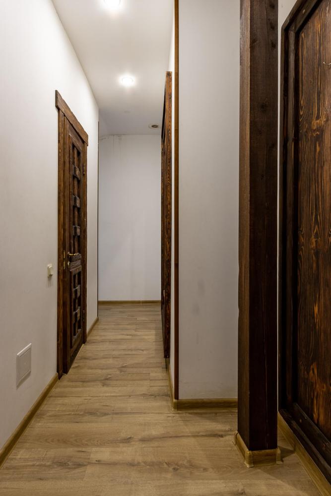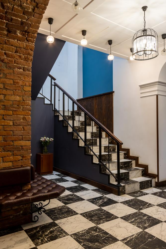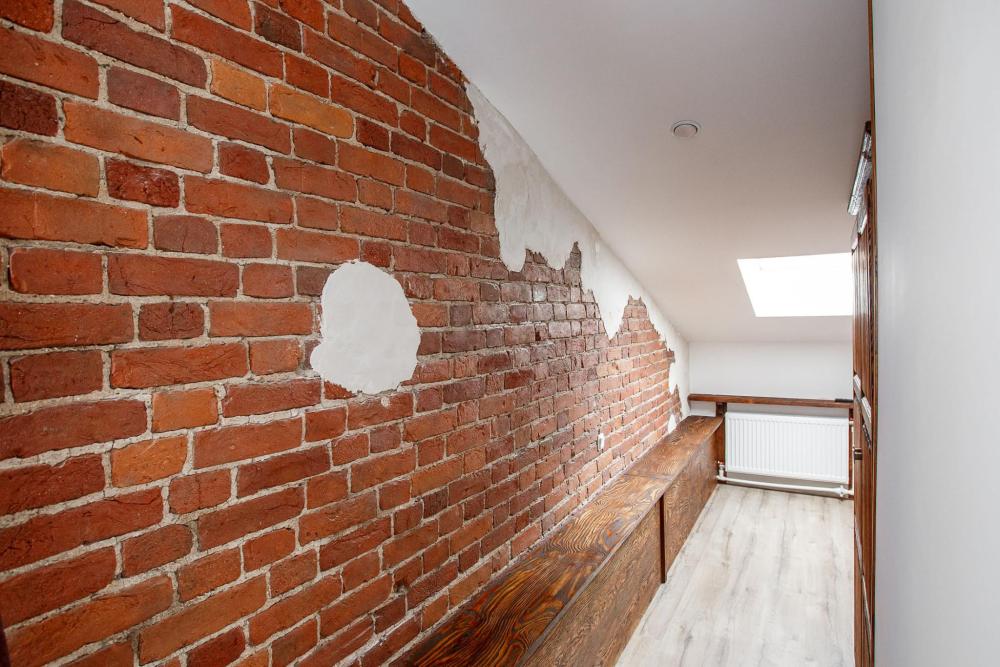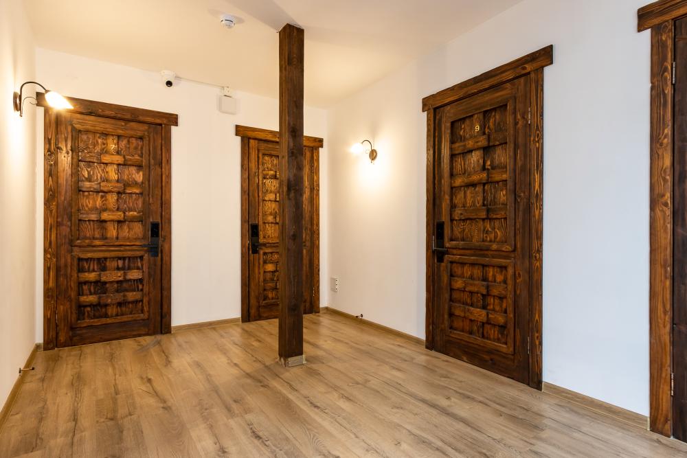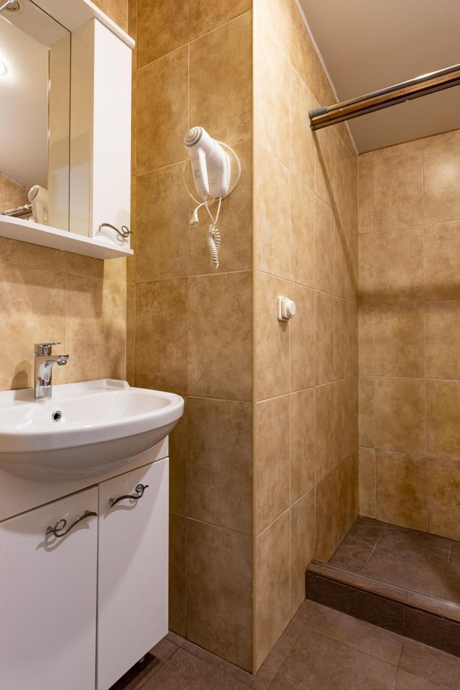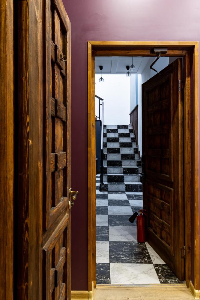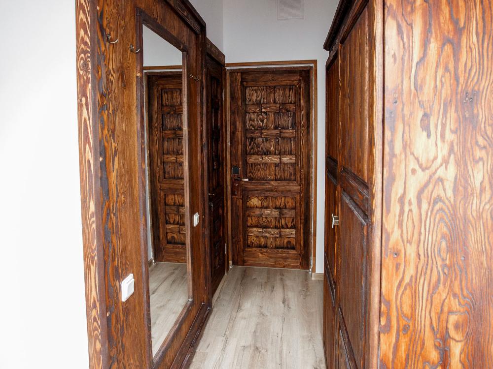 В номере есть одна двуспальная кровать и мини-диван, письменный стол, стул,шкаф для одежды, телевизор, холодильник, минибар, ванные принадлежности( одноразовые: зубная щетка, зубная паста, шампунь, гель для душа, тапочки), фен, душевая кабина и туалет, утюг и гладильная доска на ресепшене. Один из номеров мансардный.