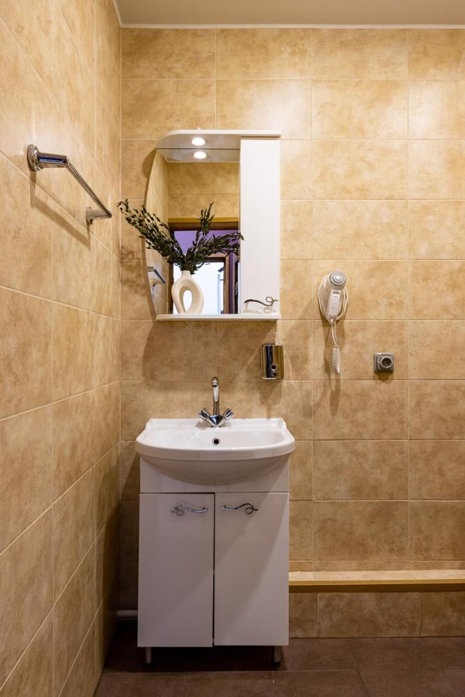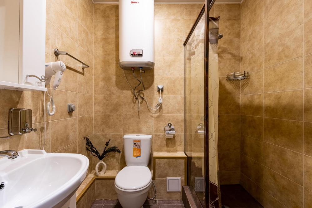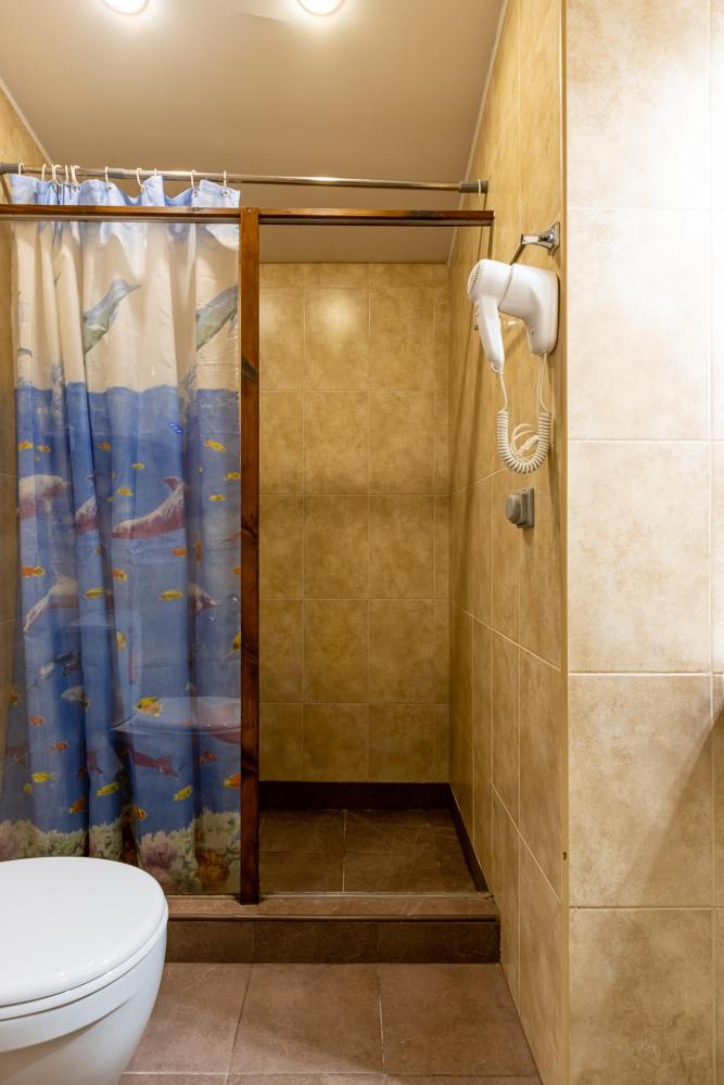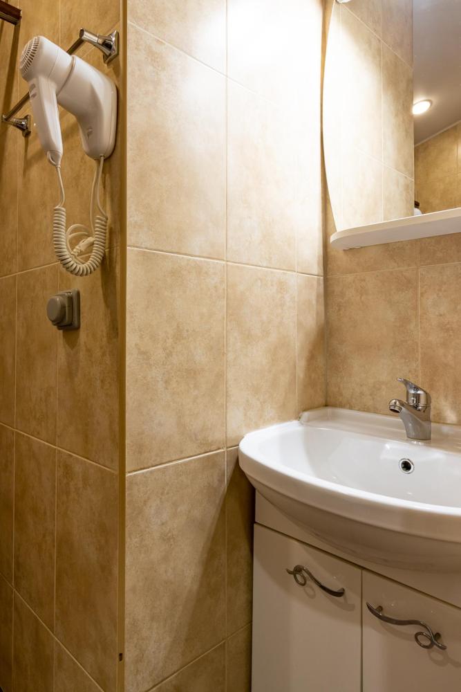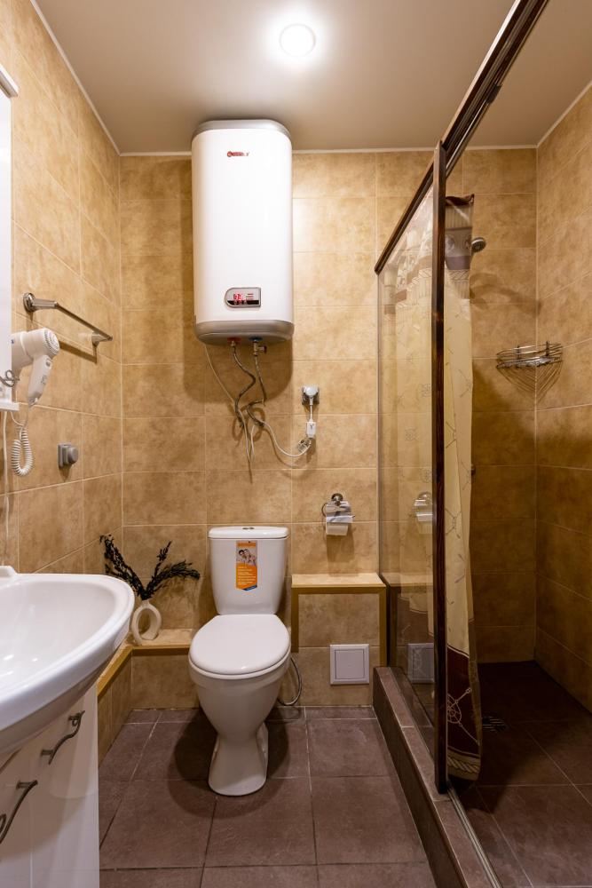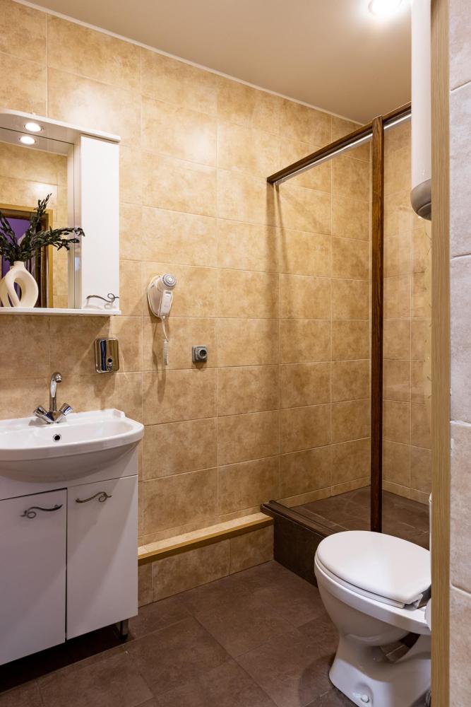 В номере есть две односпальные кровати, письменный стол, стул,шкаф для одежды, телевизор, холодильник, минибар, ванные принадлежности( одноразовые: зубная щетка, зубная паста, шампунь, гель для душа, тапочки), фен, душевая кабина и туалет, утюг и гладильная доска на ресепшене.