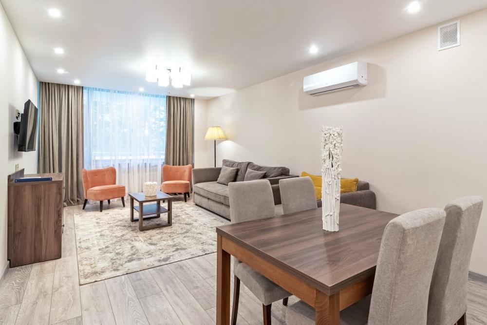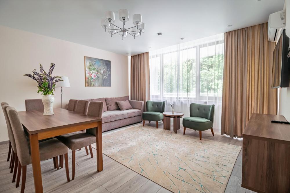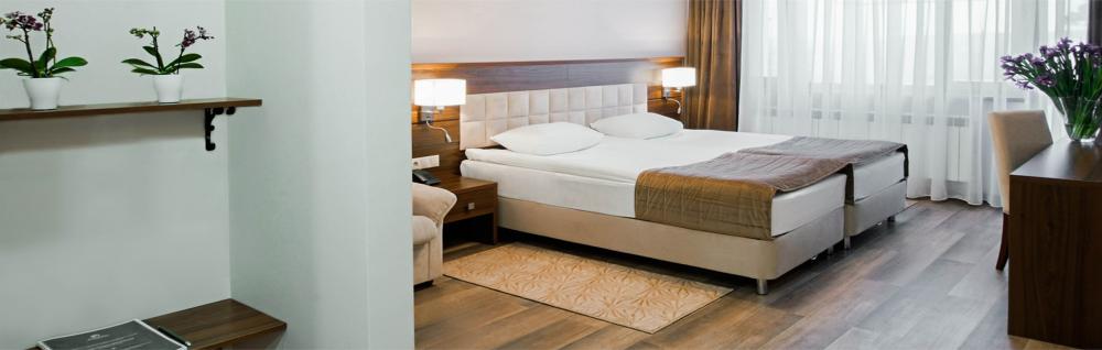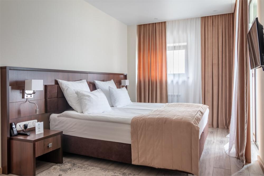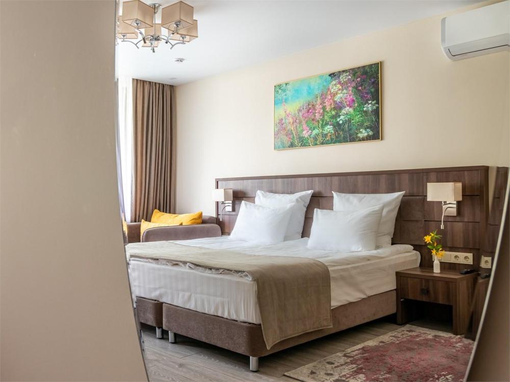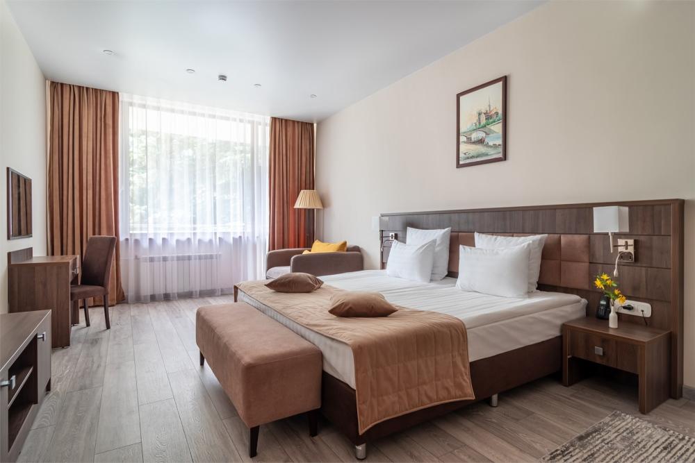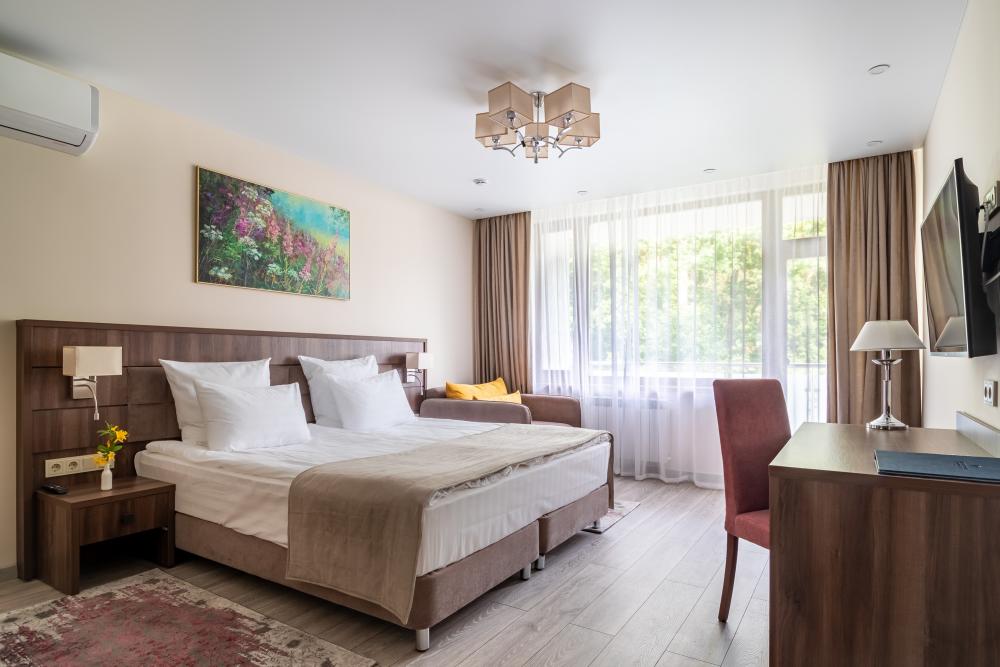 Номер категории «ЛЮКС» состоит из 2-х комнат: спальни с двуспальной кроватью и гостиной. Номер с балконом и прекрасным видом на лес. Номер рассчитан на 2-х человек (возможно 2 дополнительных места).