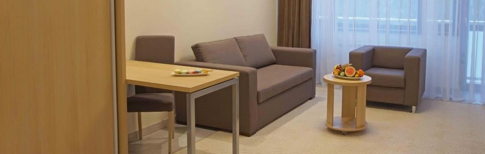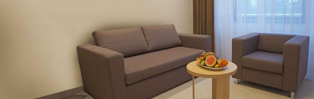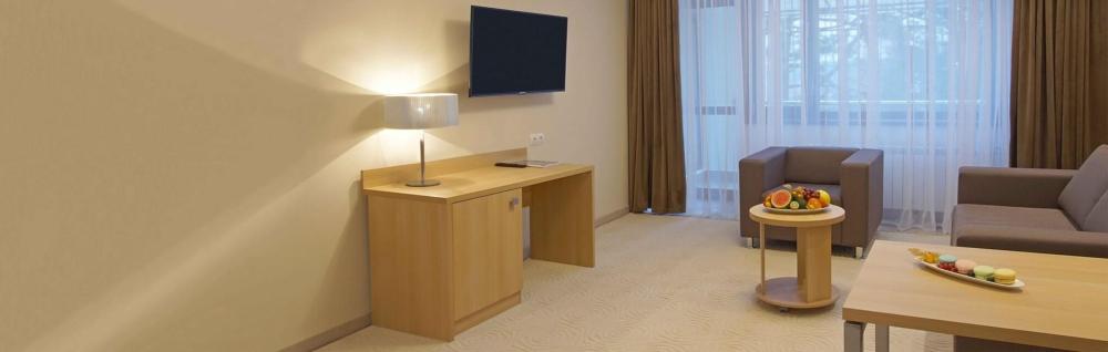 Двухкомнатный уютный номер с балконом и прекрасным видом на лес. В номере гостиная и спальня с двумя односпальными кроватями, мягкая мебель, чайная станция (чайник и набор чайной посуды), мини-холодильник, телевизор, телефон. Номер рассчитан на 2-х человек (возможно 2 дополнительных места).