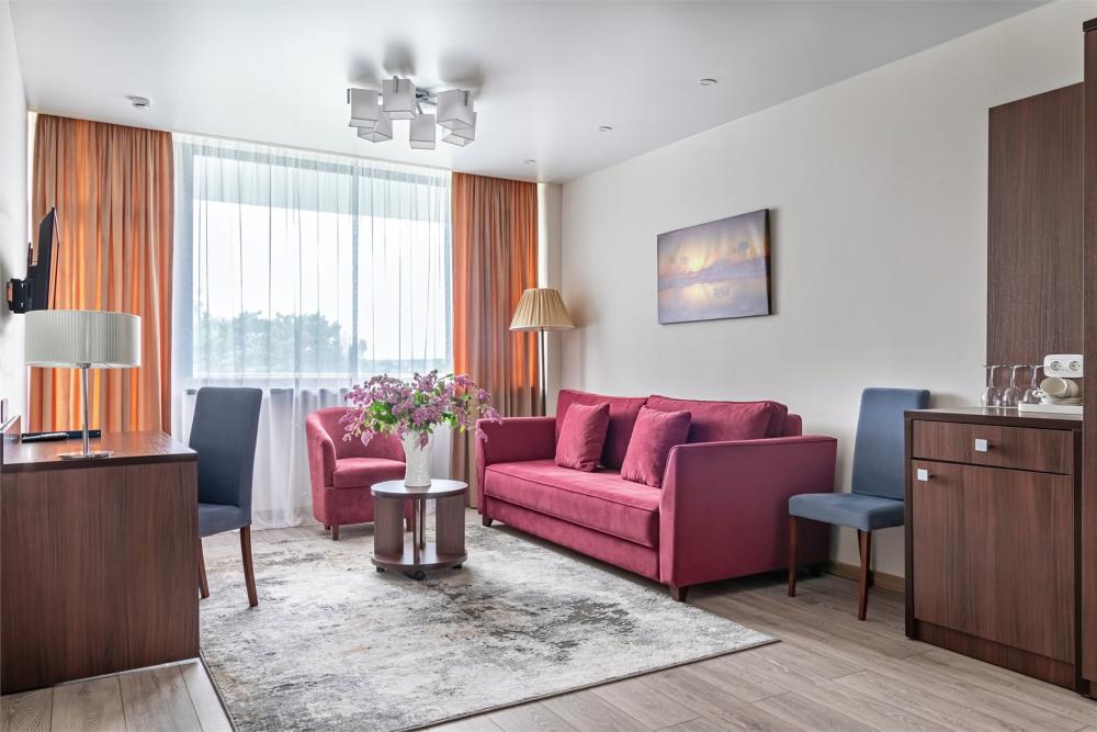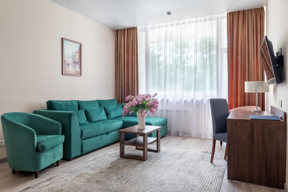 Двухкомнатный уютный номер с балконом и прекрасным видом на лес. В номере гостиная и спальня с одной двуспальной кроватью, мягкая мебель, чайная станция (чайник и набор чайной посуды), мини-холодильник, телевизор, телефон. Номер рассчитан на 2-х человек (возможно 2 дополнительных места).
