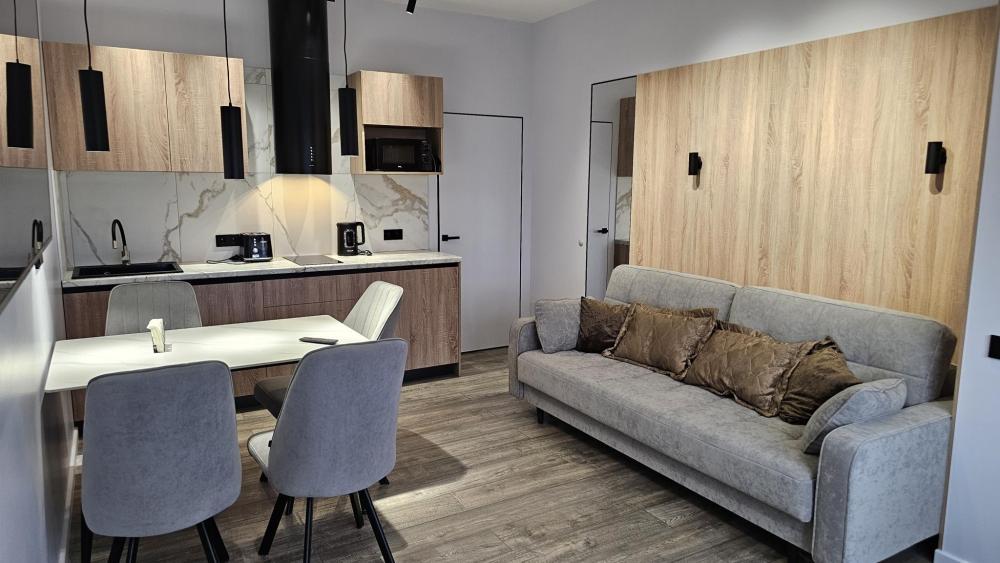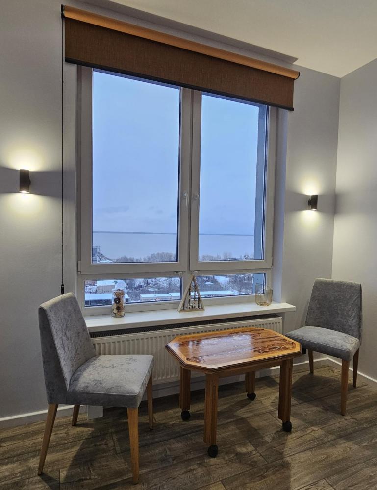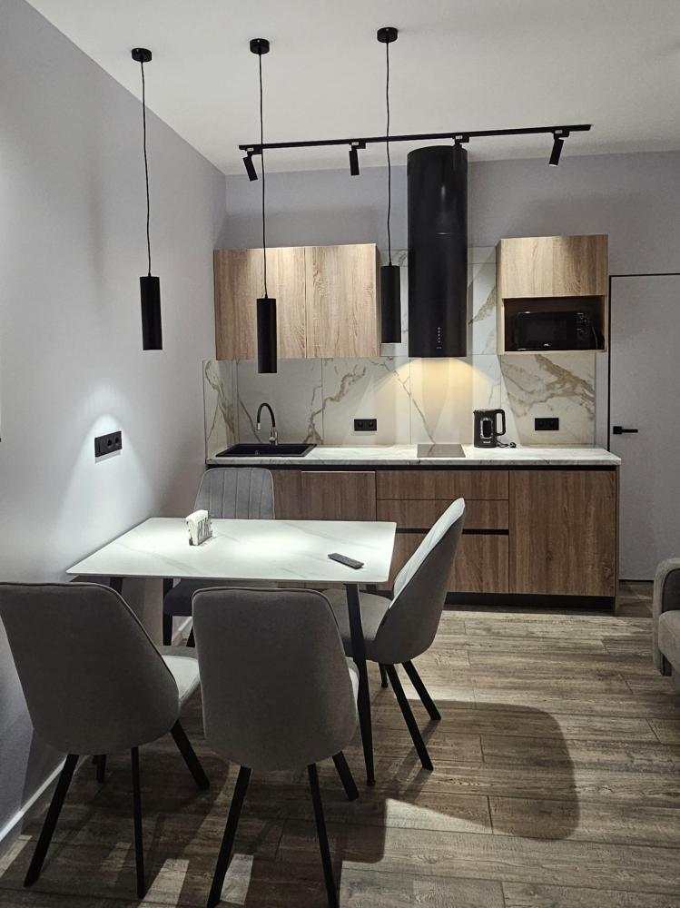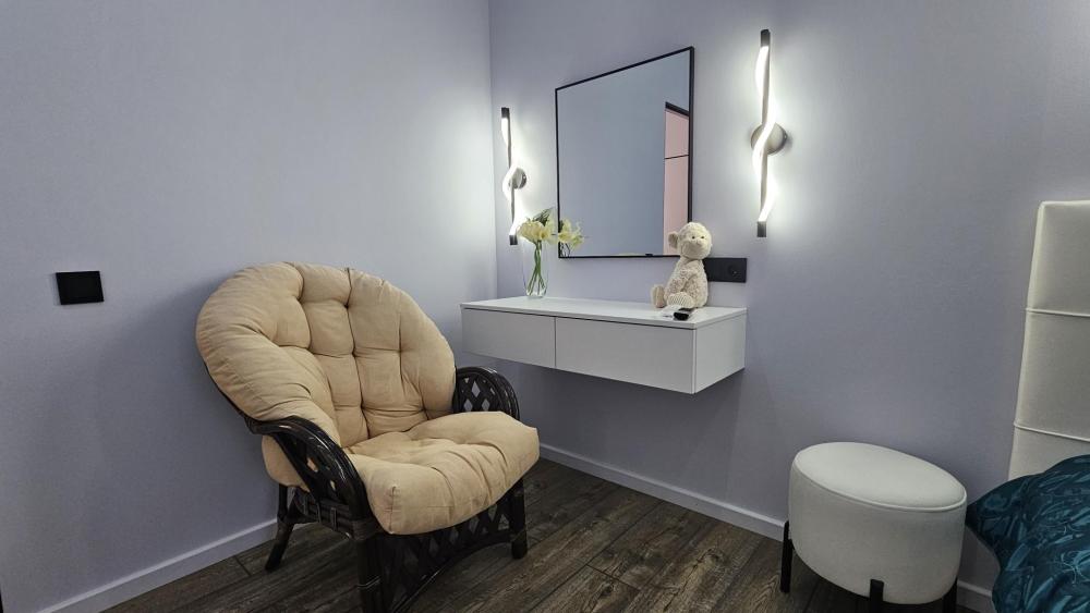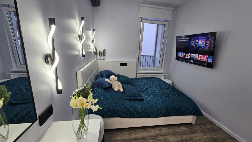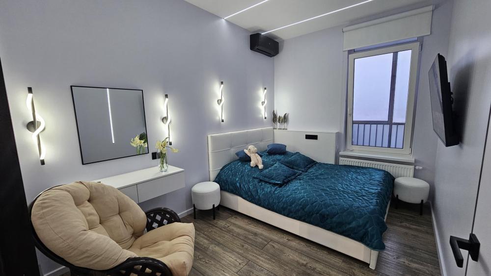Кухня-гостиная: Пространство, объединяющее зону для приготовления пищи и зону отдыха. Зона отдыха: Большой, удобный раскладной диван (спальное место для двоих), Smart TV, кондиционер. Деревянная стеновая панель и точечное освещение создают особую атмосферу уюта. Кухня: Полностью оборудована встроенной техникой (холодильник, индукционная плита, духовка, микроволновая печь), стильной вытяжкой и всем необходимым набором посуды. Обеденная зона: Современный стол и удобные стулья. Релакс-зона у окна: Мягкое кресло и журнальный столик рядом с окном и выходом на балкон — идеальное место, чтобы насладиться видом на Онежское озеро. Уютная отдельная спальня с большой двуспальной кроватью и мягким изголовьем. Освещение: Современная светодиодная подсветка на потолке (линейные светильники) и дизайнерские настенные бра создают идеальный световой сценарий для отдыха. Климат-контроль: В спальне установлен кондиционер для поддержания идеальной температуры в любое время года. Телевизор. Уголок красоты и рабочее место. Ванная комната: Современный дизайн, душ, белоснежная сантехника, большое зеркало с LED-подсветкой и стиральная машина. Всегда предоставляются свежие полотенца и основные средства гигиены. Функциональная Гардеробная: Отдельная комната с удобной системой хранения, штангой для одежды, а также гладильной доской и утюгом. Дополнительно предоставляется: Детский стульчик. В квартире имеется wi- fi. Аптечка. Нитки и иголка. Средства гигиены. Тостер для приготовления хрустящих бутербродов. В квартире имеется система пожарной безопасности.