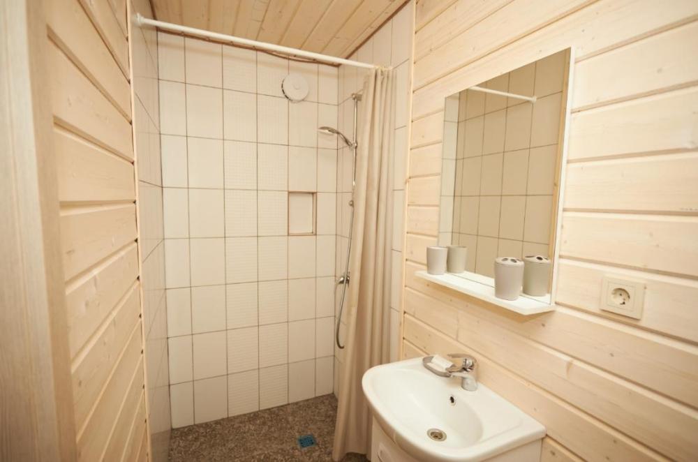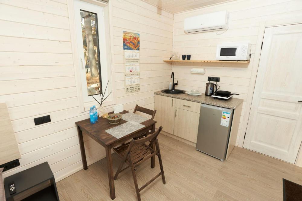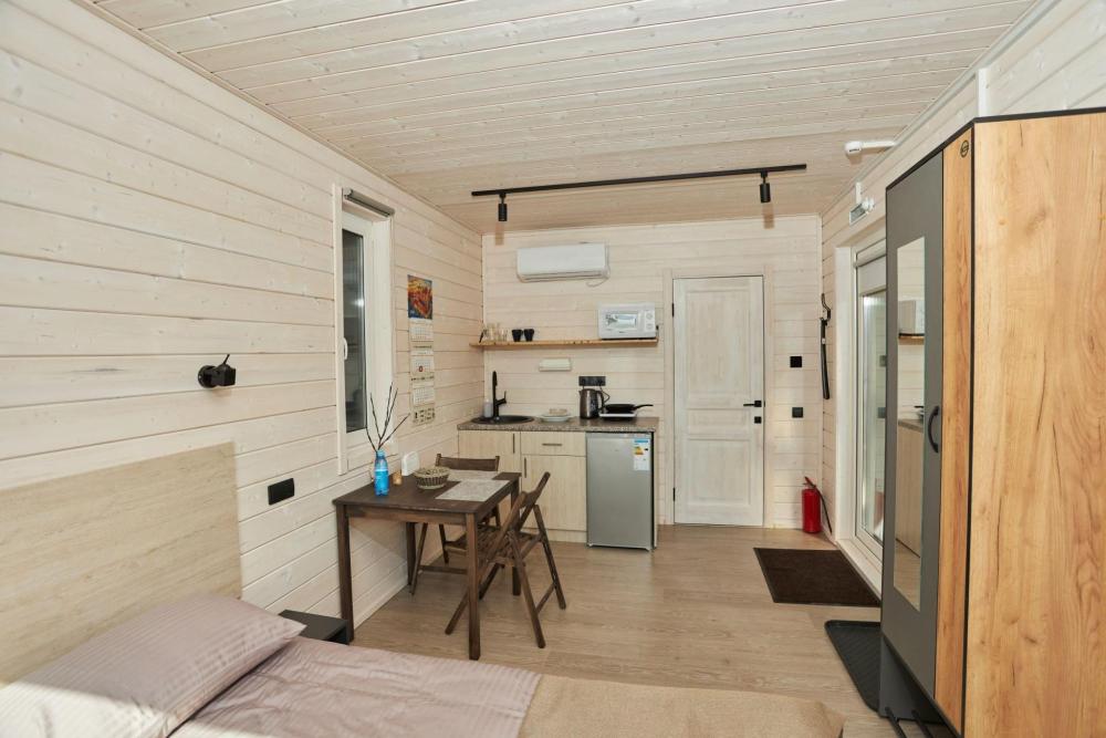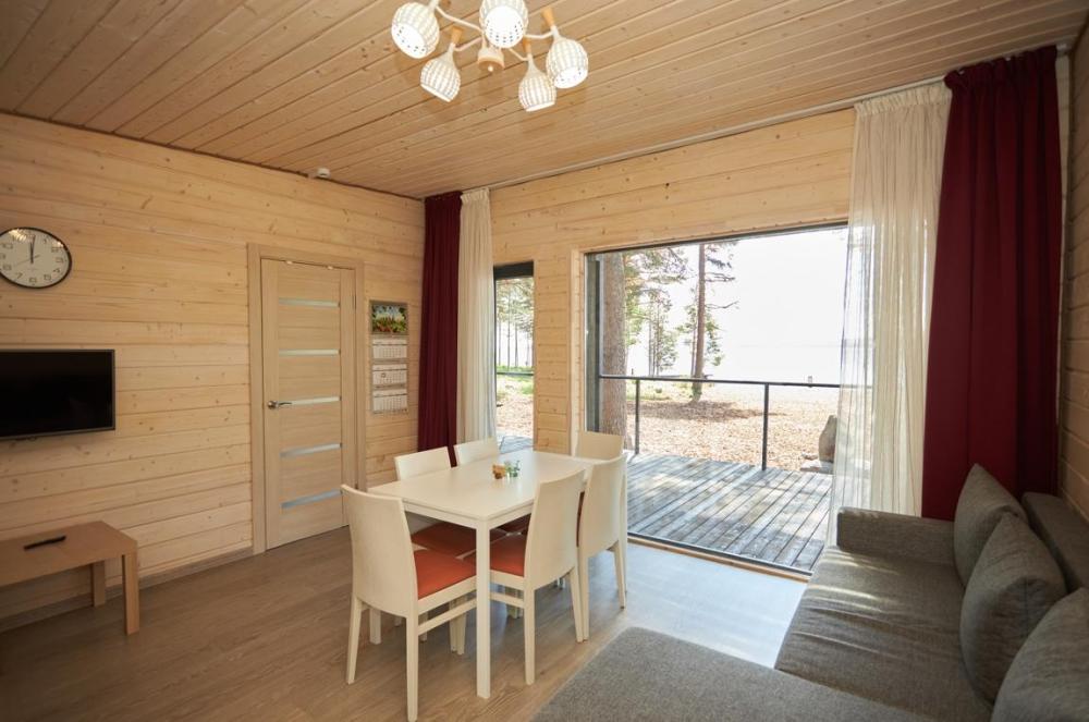 Комфортный дом категории «Комфорт с сауной» 32м2, с видом на Онежское озеро. Домики на второй береговой линии, до 200 метров от берега, рядом с рестораном. В каждом домике есть: спальня с двухместной кроватью (с возможностью разделения спальных мест); гостиная с диваном, на котором возможно разместить еще до двух гостей, за доплату; кухня со всем необходимым (холодильник, чайник, плита с одной конфоркой, микроволновка, посуда для приготовления и приема пищи); санузел с горячим душем и туалетом; небольшая электрическая сауна, нагревается до 60-70 градусов; Smart TV и wi-fi; кондиционер; терраса с уличной мебелью и качелью; мангал с шампурами и решеткой на территории каждого домика. Максимальное количество гостей: 4. Количество основных мест 2, доп. место на диване в гостиной + 2.
