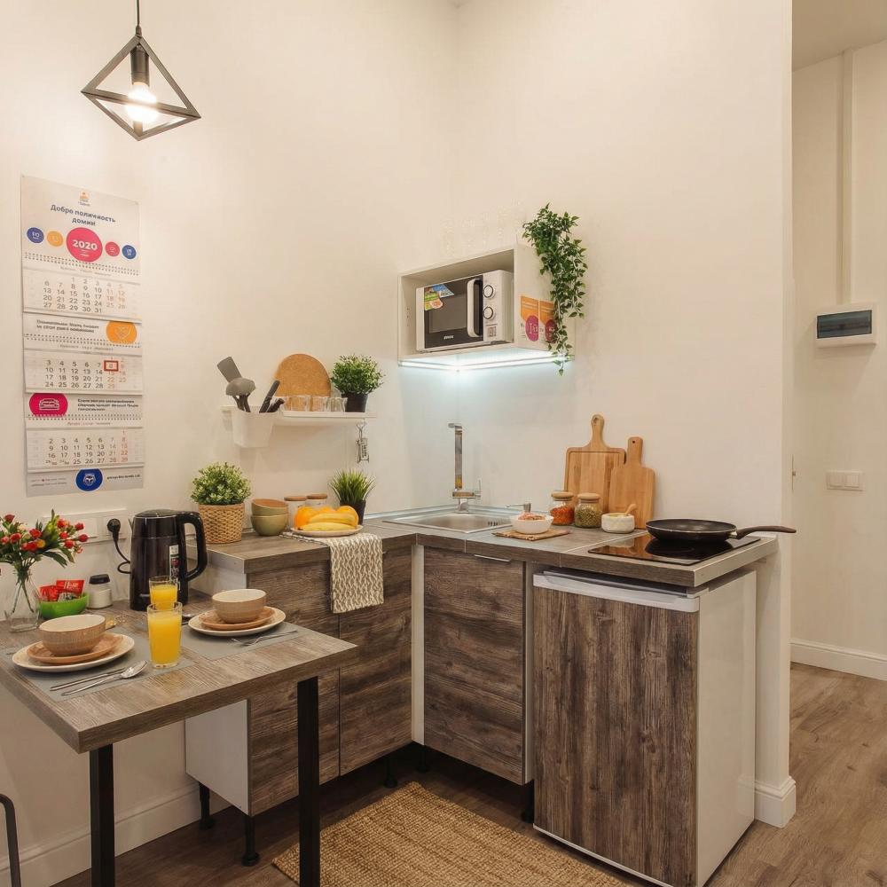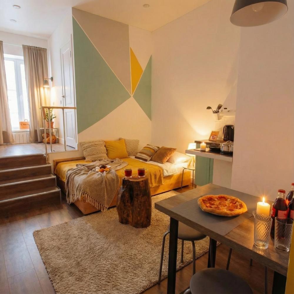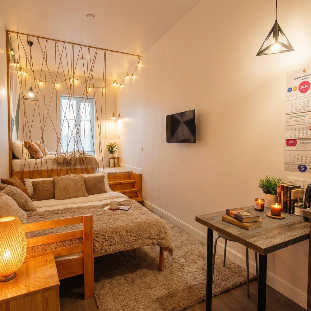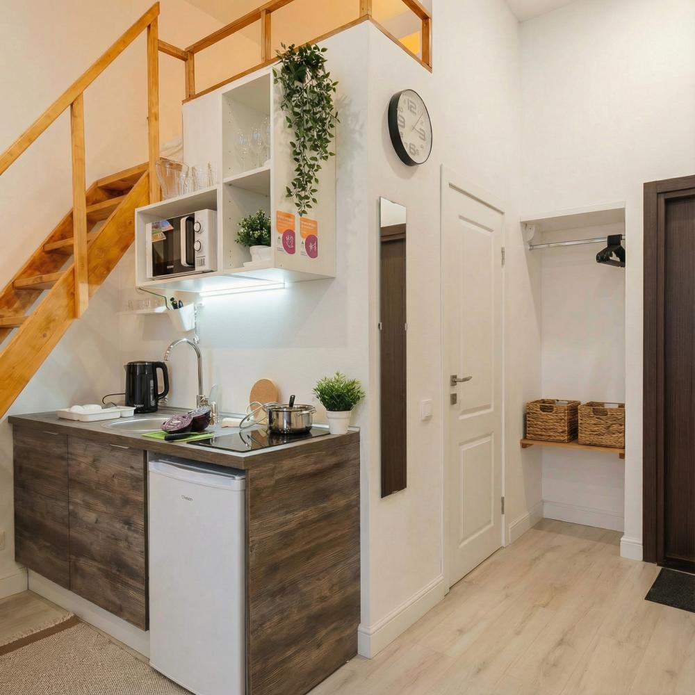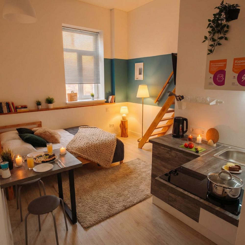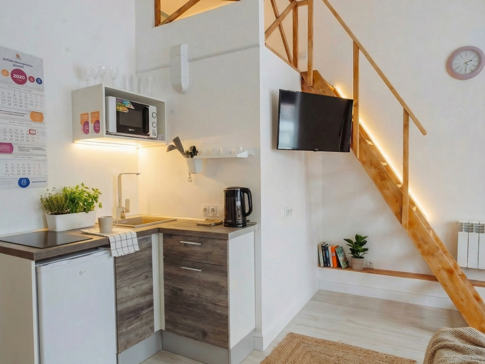 Комфортный однокомнатный двухуровневый номер с двумя раздельными кроватями. В номере есть собственная ванная комната с душевой кабиной, бесплатные гигиенические принадлежности, фен, высокоскоростной wi-fi, телевизор с плоским экраном, обеденная зона и кухонный уголок, оборудованный бытовой техникой, посудой и кухонной утварью. К услугам гостей в отеле расположена комната быта, где самостоятельно можно постирать, высушить и погладить вещи абсолютно бесплатно!