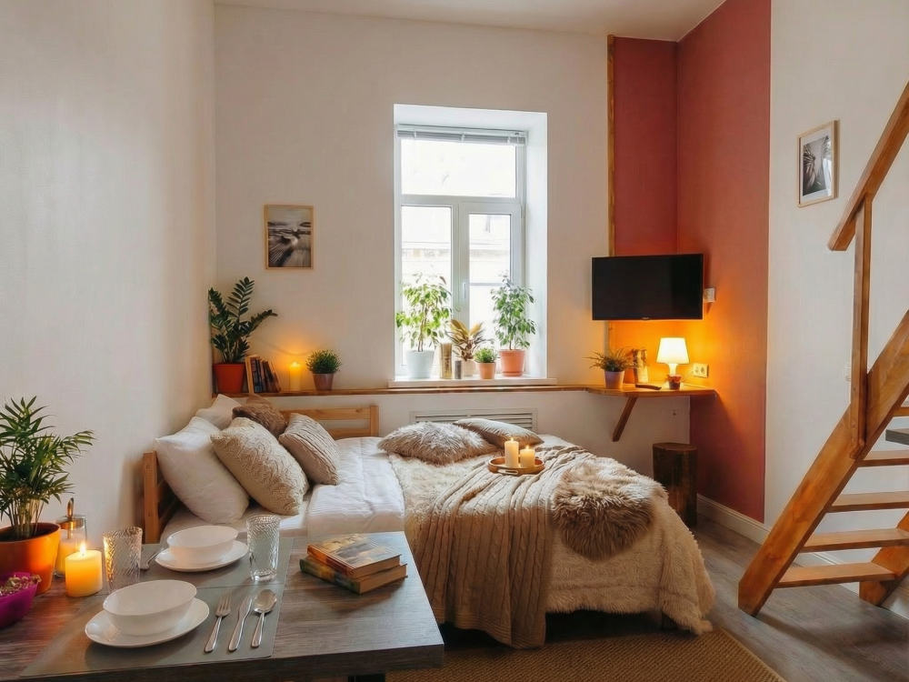 Комфортный однокомнатный двухуровневый номер с двумя раздельными кроватями. В номере есть собственная ванная комната с душевой кабиной, бесплатные гигиенические принадлежности, фен, высокоскоростной wi-fi, телевизор с плоским экраном, обеденная зона и кухонный уголок, оборудованный бытовой техникой, посудой и кухонной утварью.
