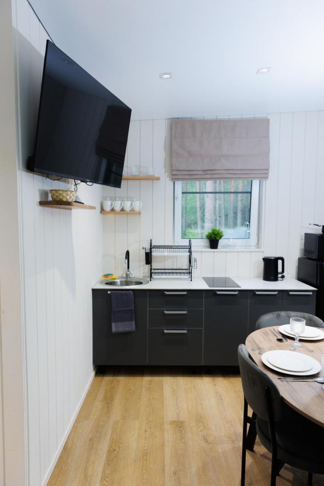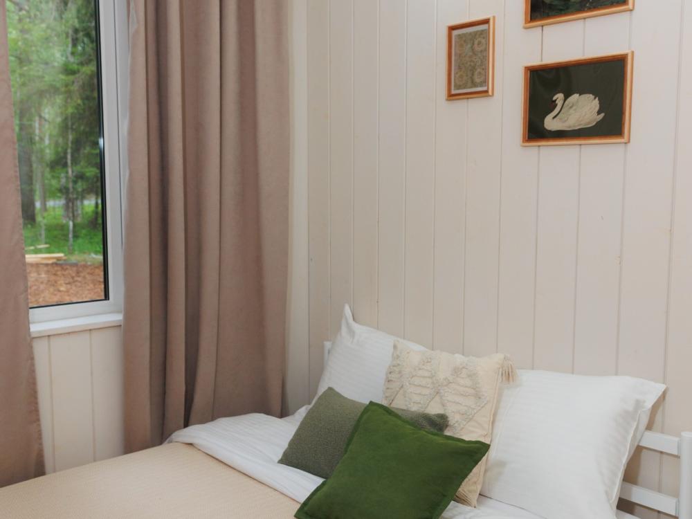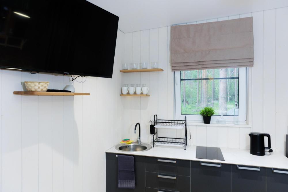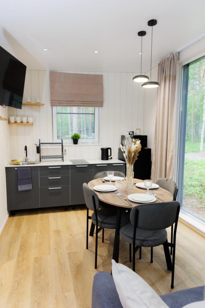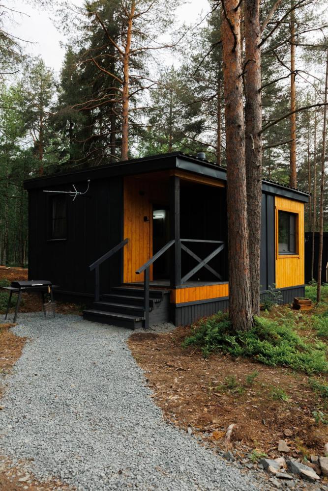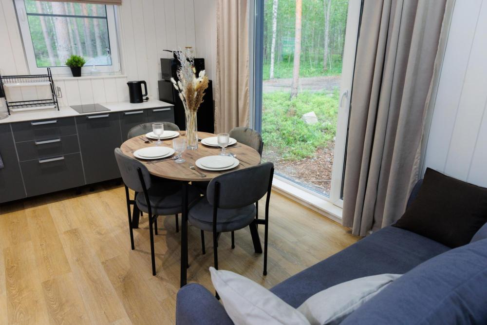 Стильные комфортабельные дома площадью 80 м² с панорамными окнами и просторной террасой с видом на озеро. В каждом доме: – 3 раздельные спальни, в каждой спальне двуспальная кровать с ортопедическим матрасом; – большая гостиная, с кухней и с большим дизайнерским столом; – в гостиной также есть одно дополнительное спальное место; - раскладной диван, телевизор Smart TV, умная колонка Яндекс с Алисой – кухня оснащена всем необходимым: посуда, электрический чайник, варочная поверхность, холодильник, микроволновая печь, гейзерная кофеварка – санузел, совмещенный с электрической сауной – у каждого дома своя индивидуальная мангальная зона