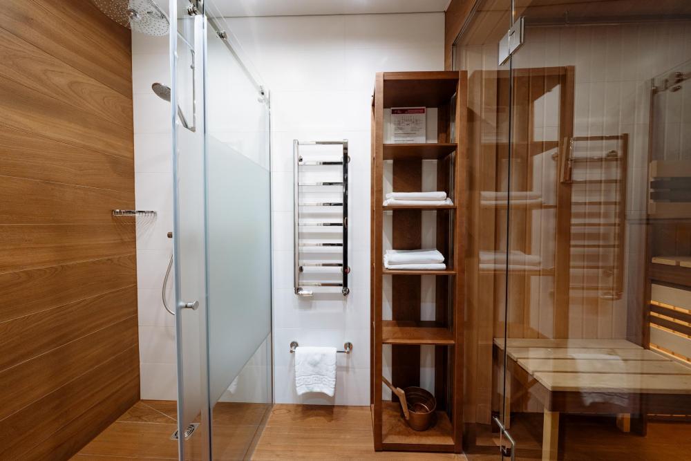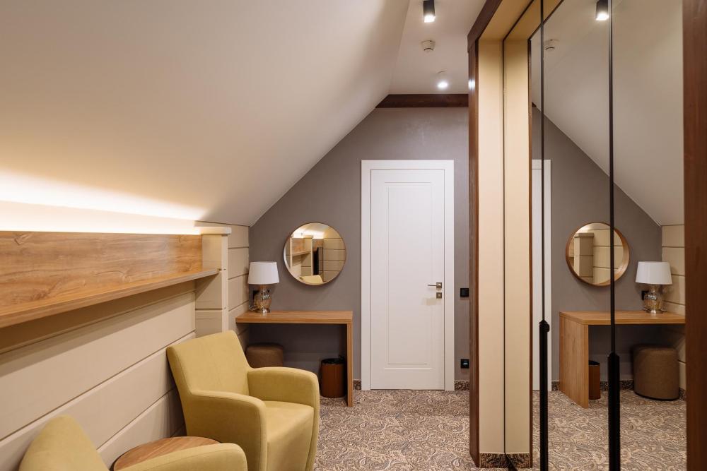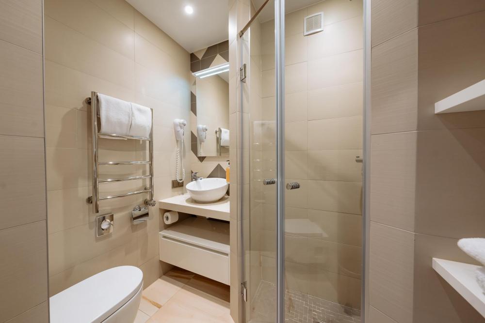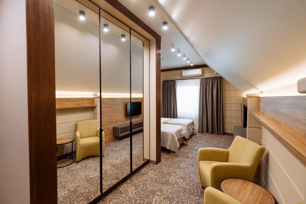 Двухкомнатный номер категории "Люкс" в Отеле с одной двуспальной кроватью, которая, по желанию гостей, может быть трансформирована в две раздельные кровати. Номер также располагает комфортабельной зоной гостиной с диваном, плазменным телевизором. Гостям предоставляются халаты и тапочки, минеральная вода при заезде.