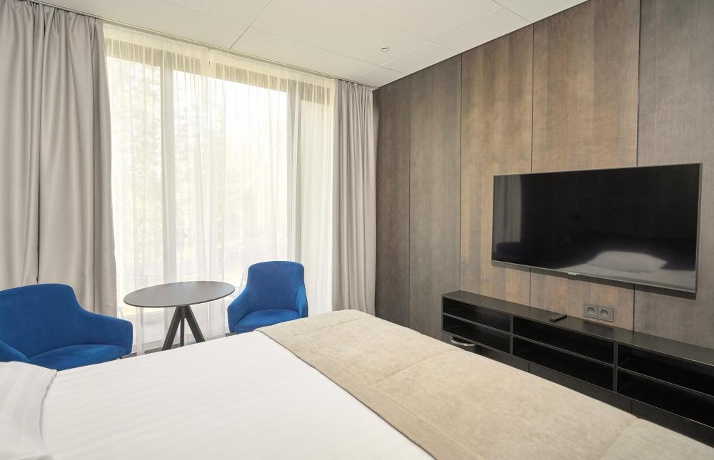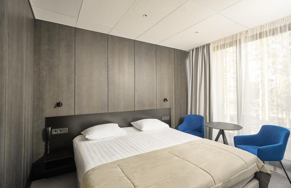 Классический однокомнатный номер с панорамными окнами, в котором есть всё необходимое для загородного отдыха. Возможно размещение с одной большой двуспальной кроватью или двумя односпальными кроватями. Номер площадью 20 кв. м с панорамными окнами и отдельным входом. Рассчитан на 1-2 человек и имеет полный набор бытовой техники (ЖК-телевизор*, кондиционер), сейф, платный мини-бар и душевую кабину. Бесплатный доступ к WI-FI. *ЖК-телевизор настроен на подключение к сети Wi-Fi «IGORA TV WIFI». Всего в отеле 64 номера «Стандарт».