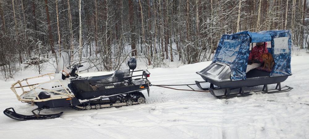 Прогулки на снегоходе по уникальному, по своей красоте, сосновому бору, с посещением действующего маяка в бухте Вуохенсало и поклонного креста мыса Мустаниеми на берегу Ладоги. Снегоход оборудован вместительными санями.