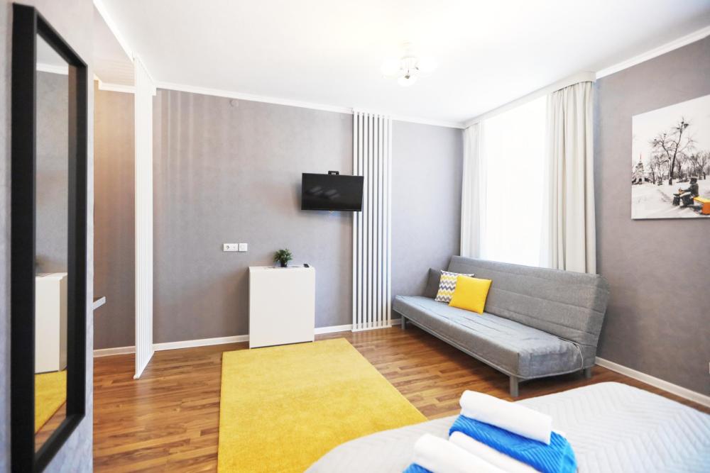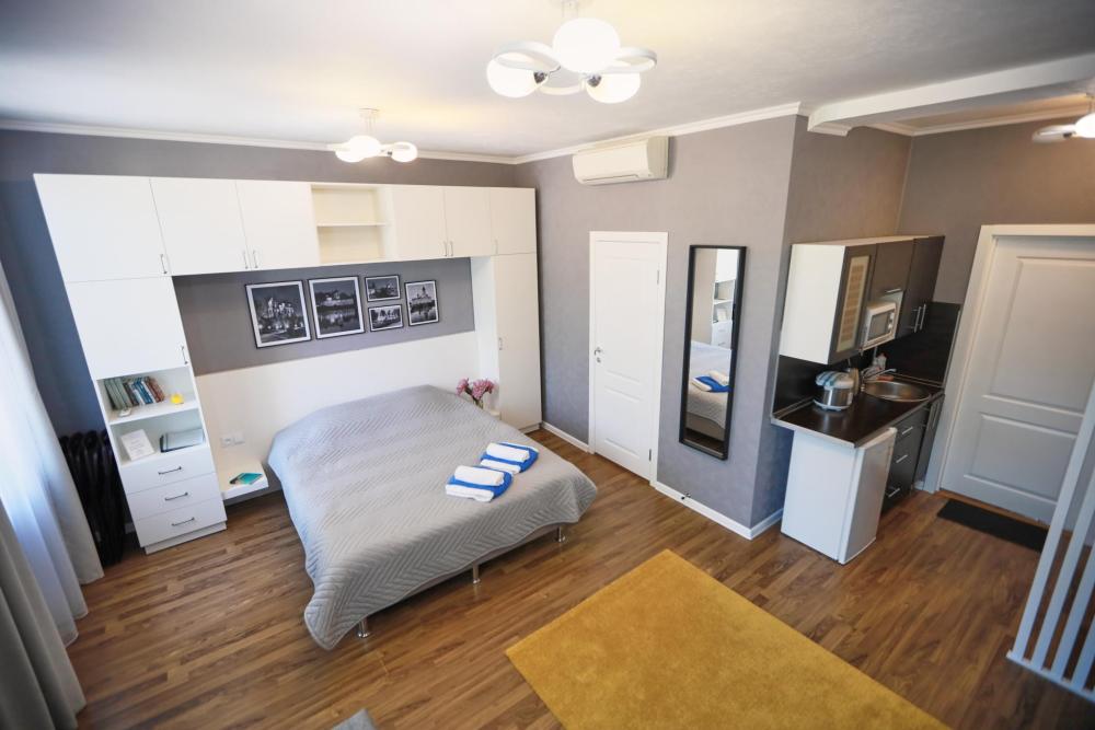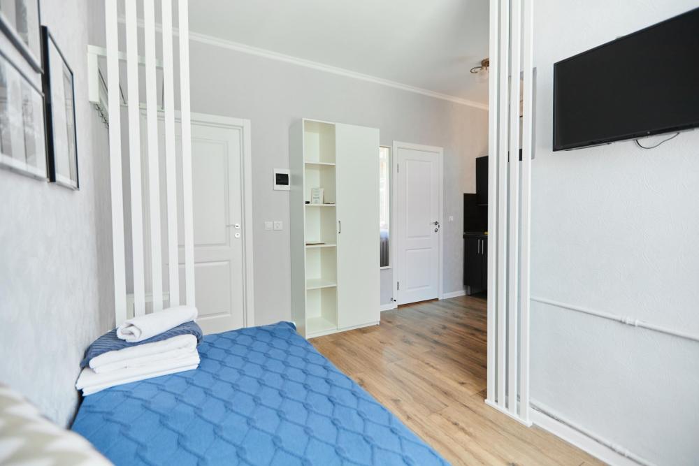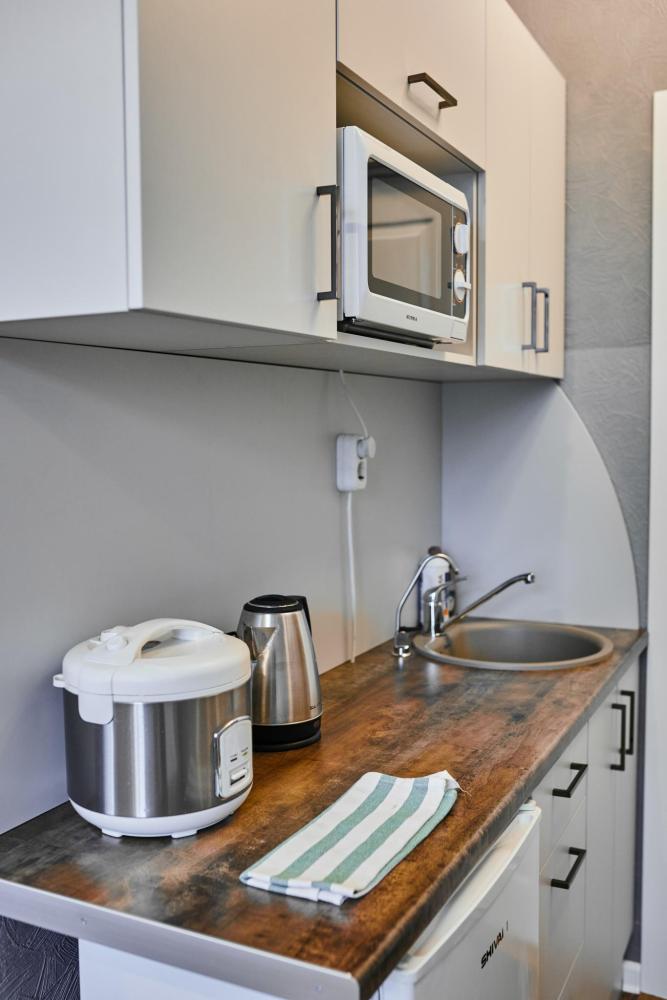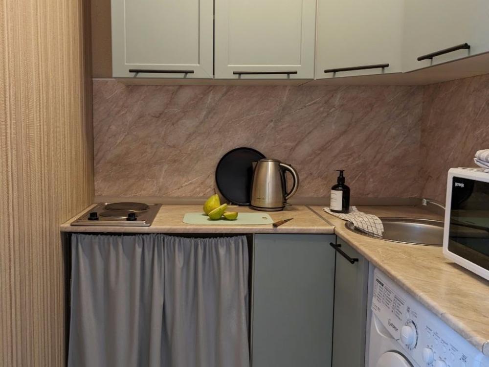 Современная студия, ремонт осуществлен в 2021 году. В студии для удобства есть кондиционер, фен, утюг, гладильная доска. Мини кухня вмещает СВЧ, мультиварка, набор посуды, чайник, индукционная плитка.