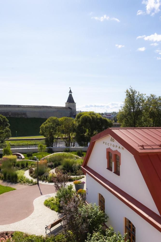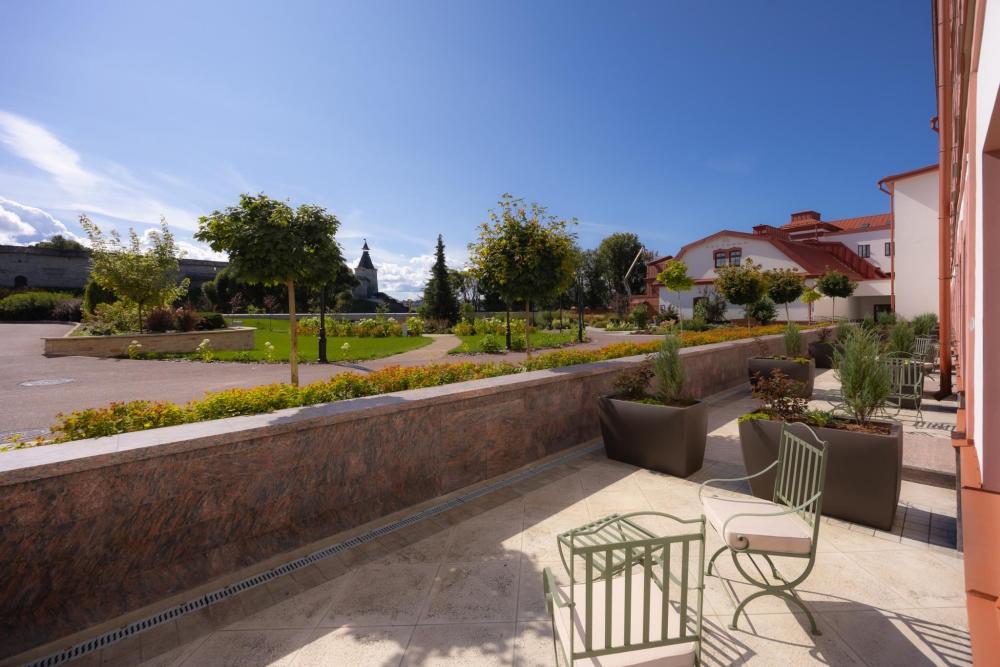 В зависимости от предпочтений гостей, можно выбрать номер с живописным видом на Псковский кремль, парк, уютный номер с мансардными окнами или номер с террасой. Номер с террасой — идеальный выбор для тех, кто ценит пространство и отдых вдали от городской суеты. Терраса открывает вид на древний Кремль, создавая атмосферу уединения и спокойствия. Расположенный на первом этаже, номер сочетает приватность и комфорт высокого уровня. В нашем отеле есть номера с выбором типа кроватей, которые подойдут как для семейного отдыха, так и для деловых поездок. Площадь номера: 32-39 м²
