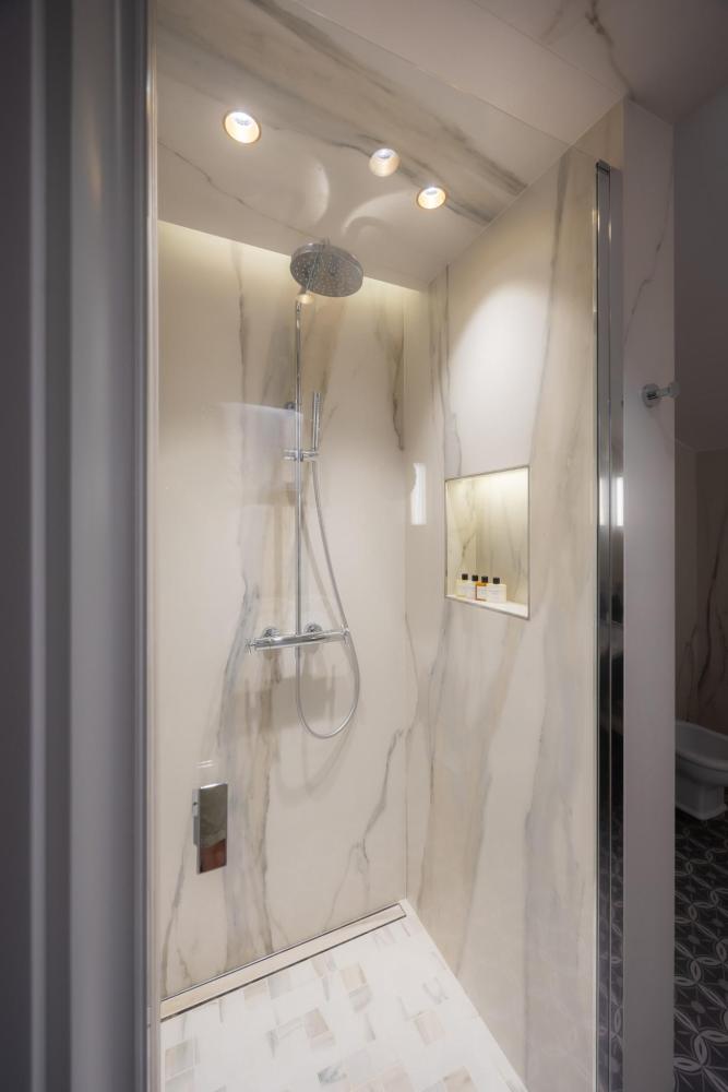 Просторный номер на мансардном этаже с большой двуспальной кроватью и раскладным диваном. Ванная комната оснащена душевой кабиной ванной.