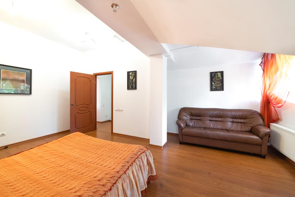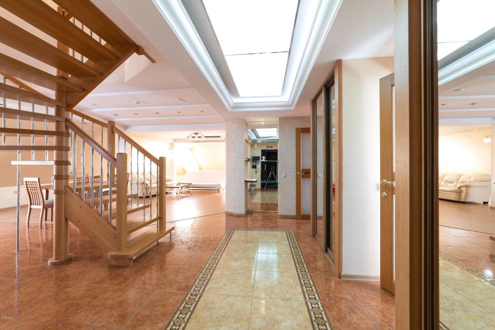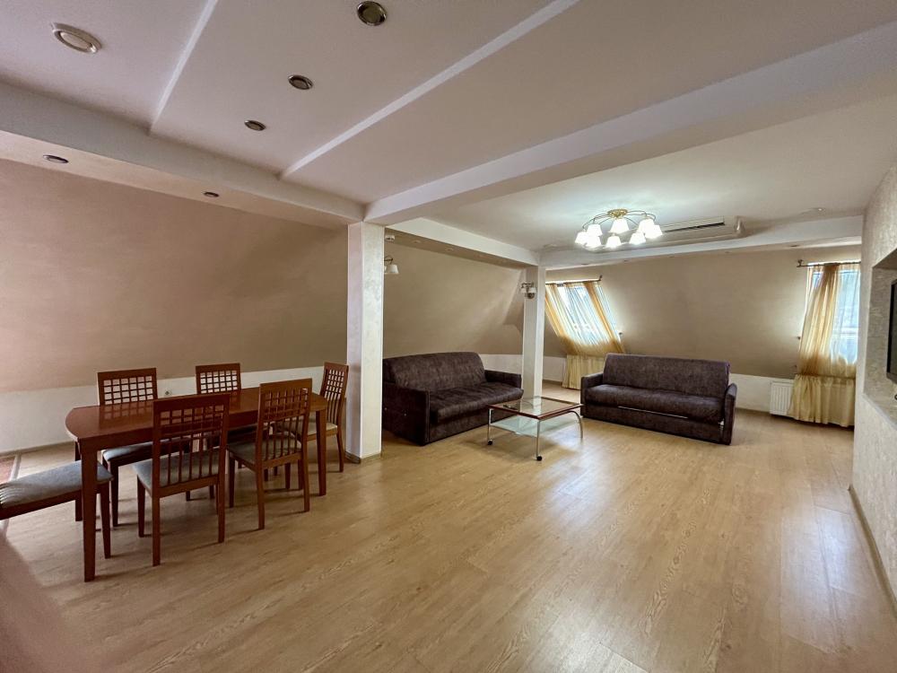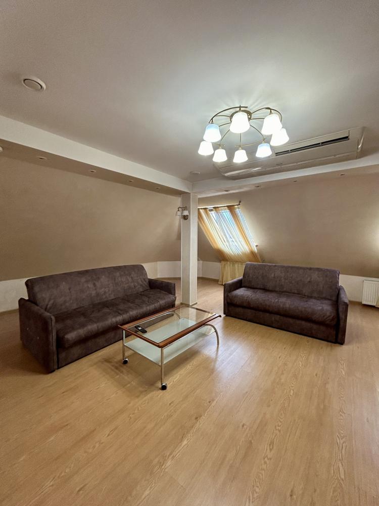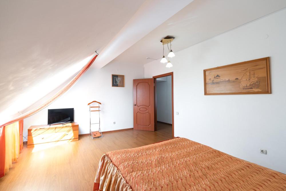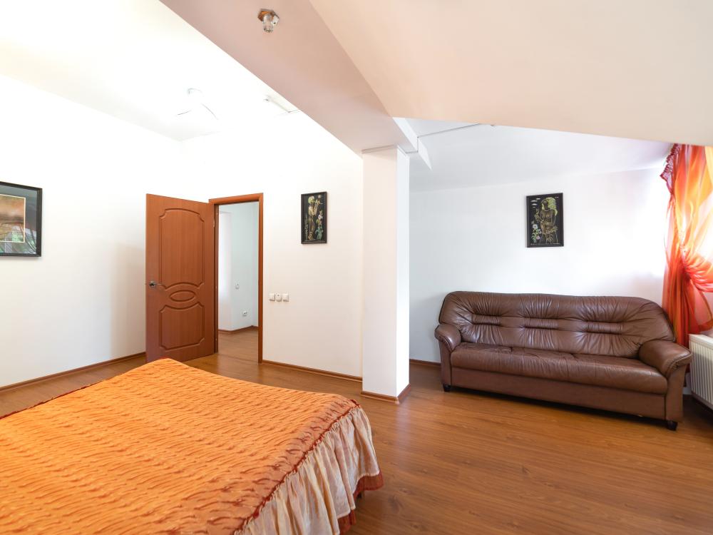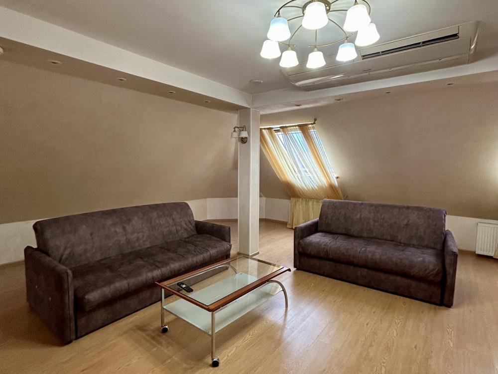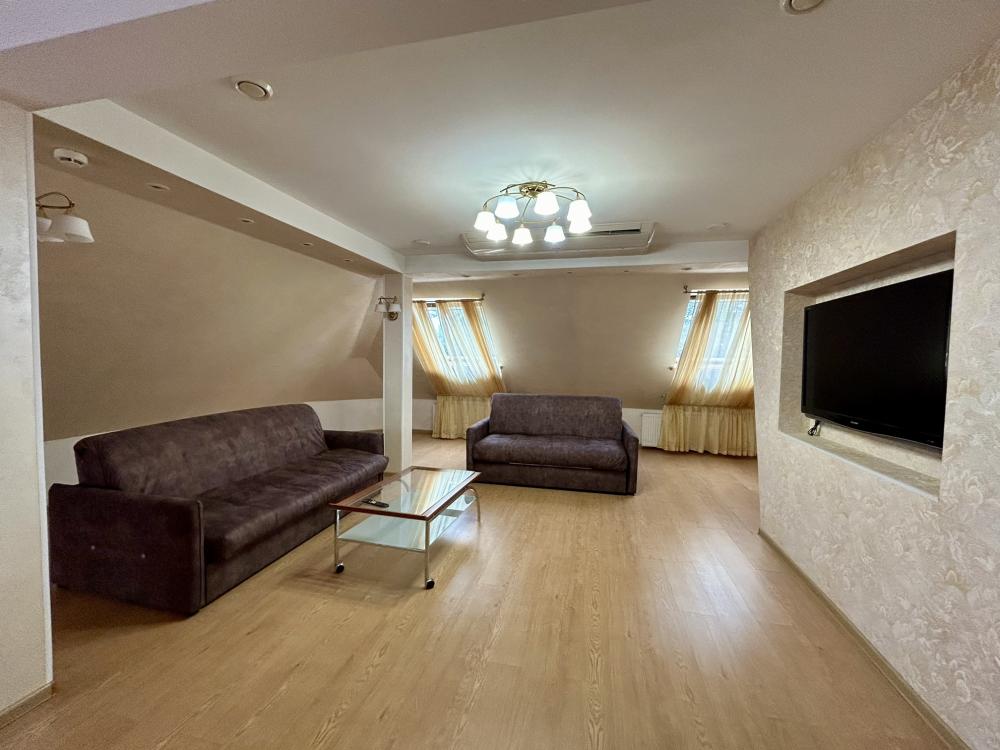 Двухуровневые апартаменты для 6-ти взрослых Апартаменты с кондиционером располагаются на двух уровнях (второй уровень – мансарда). Номер имеет 3 спальни и 3 санузла. В общей кухне-гостиной со всей необходимой бытовой техникой, можно приготовить еду и собраться за общим столом или комфортно расположиться на диванах перед TV. В собственной ванной комнате имеются бесплатные косметические принадлежности, предоставляются халаты.