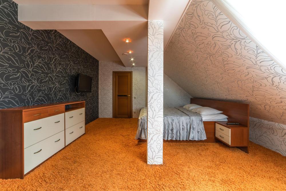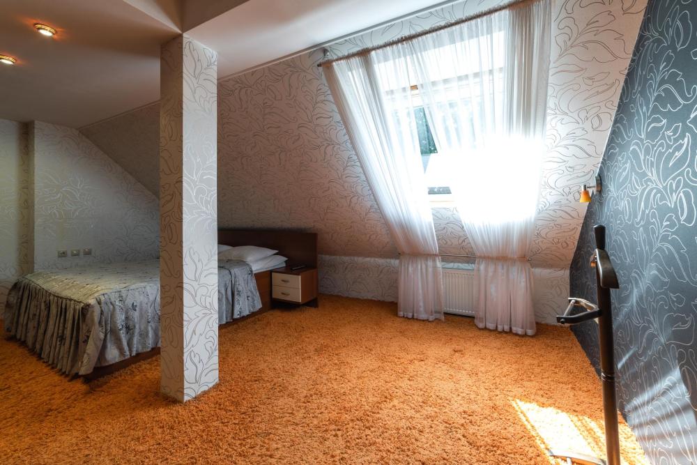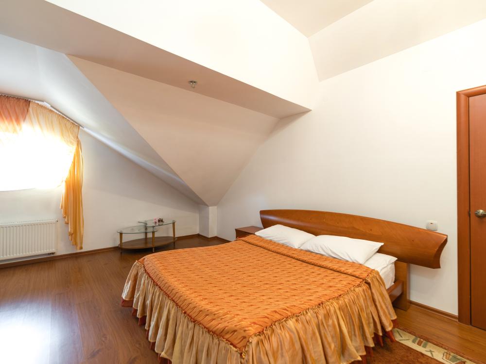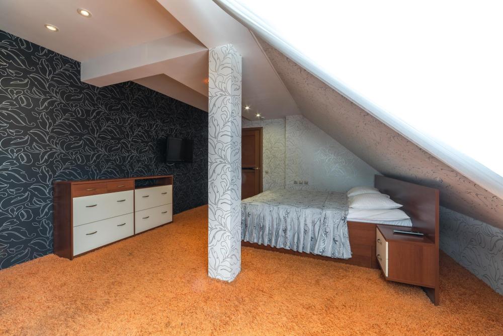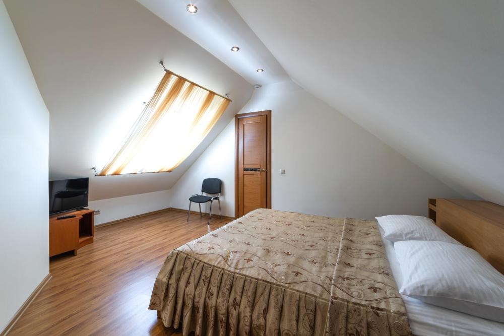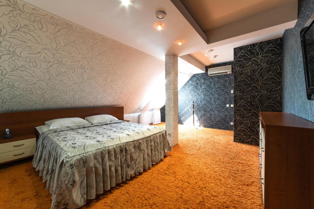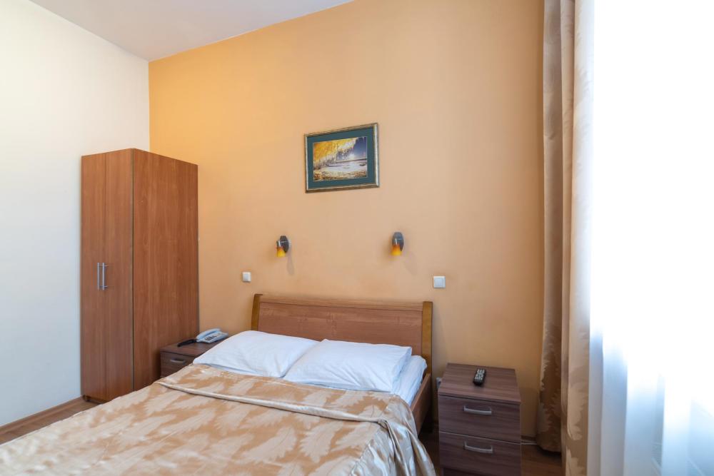 Полулюкс Уникальный дизайн номера делит его на две зоны: зону отдыха с креслами и плазменным TV и спальную зону с кофмортной двуспальной кроватью. В номере имеется холодильник и чайник. В собственной ванной комнате имеются бесплатные косметические принадлежности, предоставляются халаты. По запросу в номер может быть предоставлена детская кроватка (бесплатно) или дополнительное место в виде евро-раскладушки (платно).