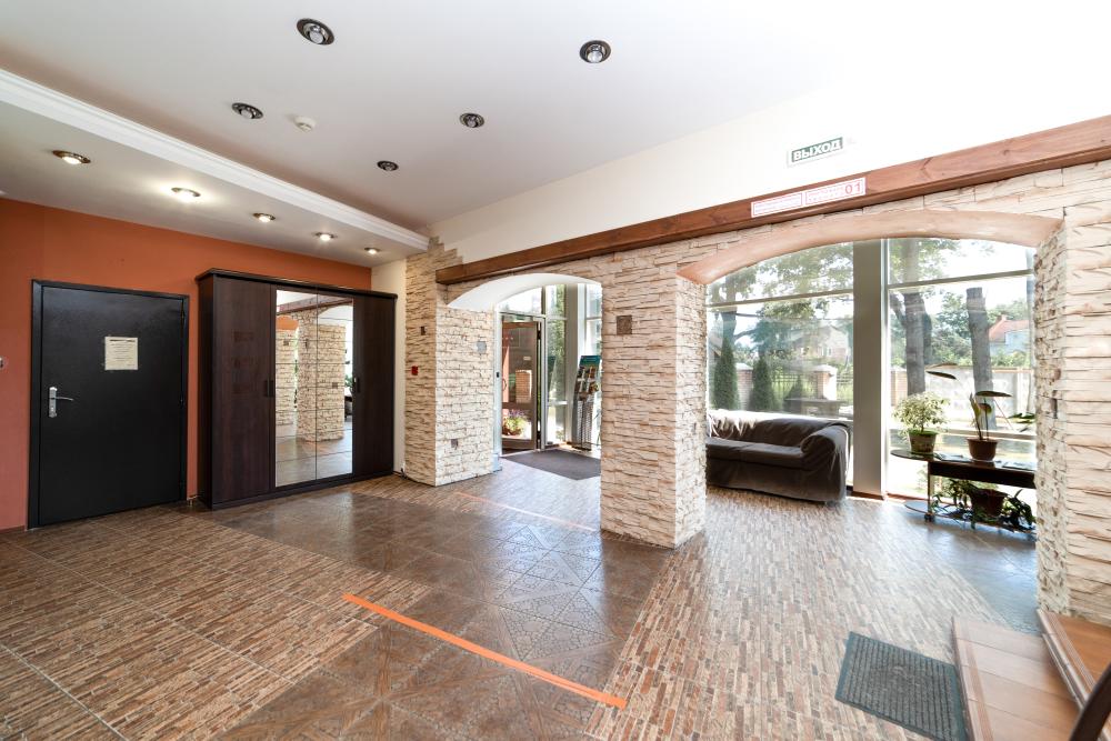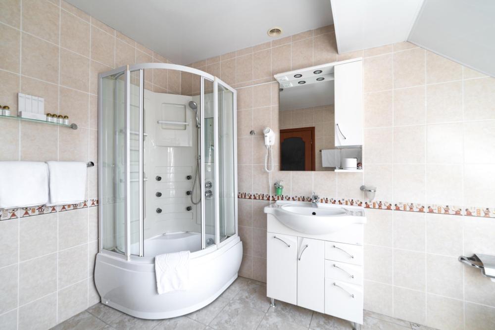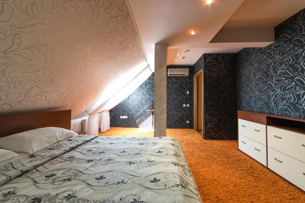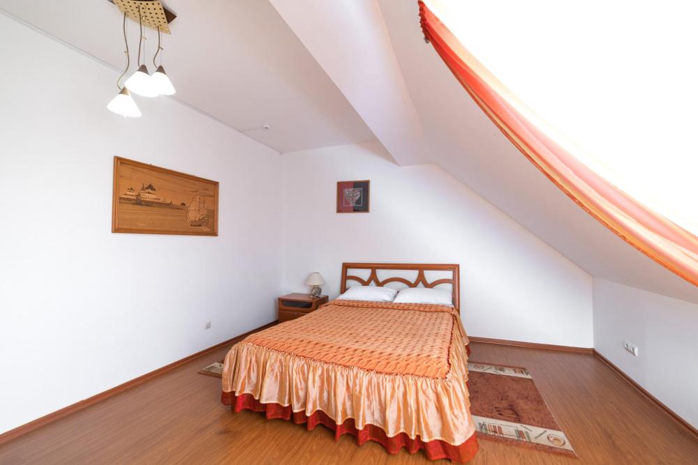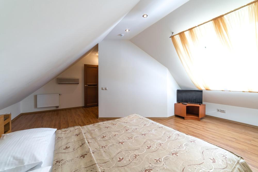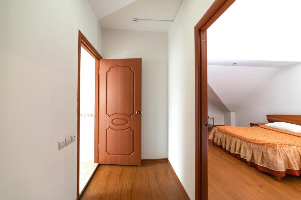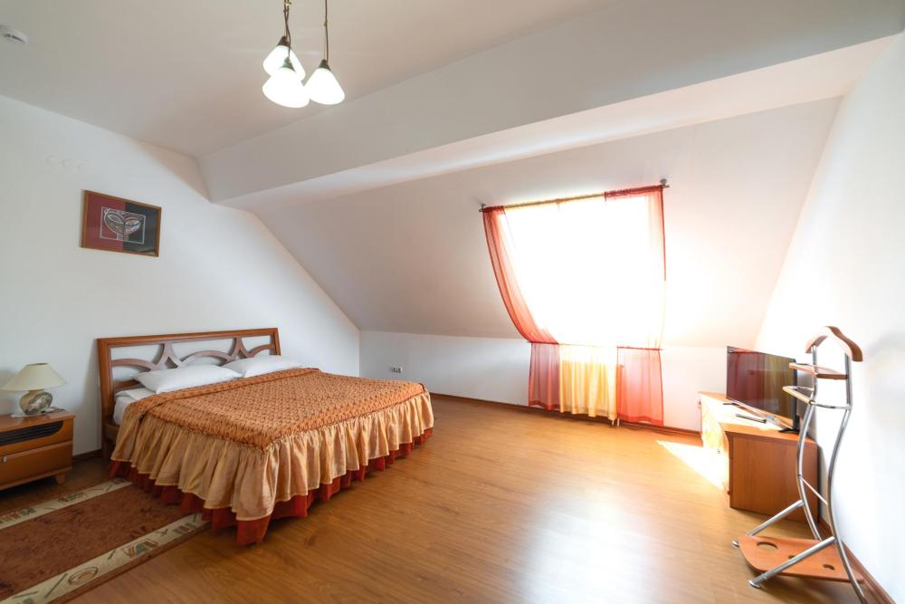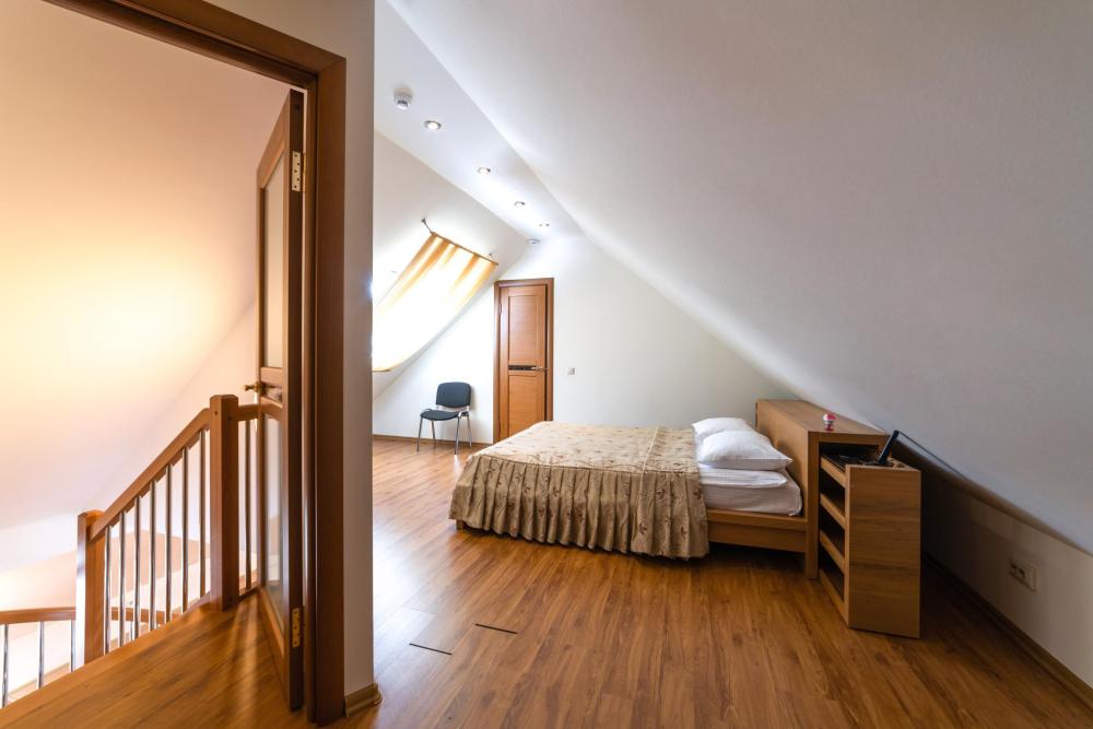 Полулюкс Уникальный дизайн номера делит его на две зоны: зону отдыха с креслами и плазменным TV и спальную зону с кофмортной двуспальной кроватью. В номере имеется холодильник и чайник. В собственной ванной комнате имеются бесплатные косметические принадлежности, предоставляются халаты. По запросу в номер может быть предоставлена детская кроватка (бесплатно) или дополнительное место в виде евро-раскладушки (платно).