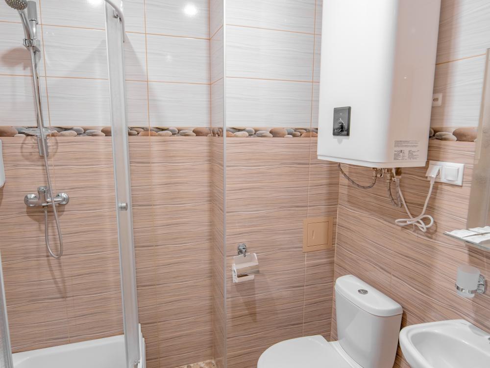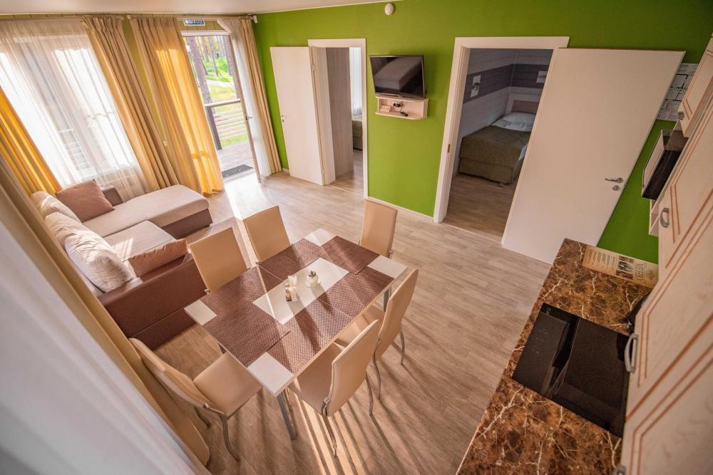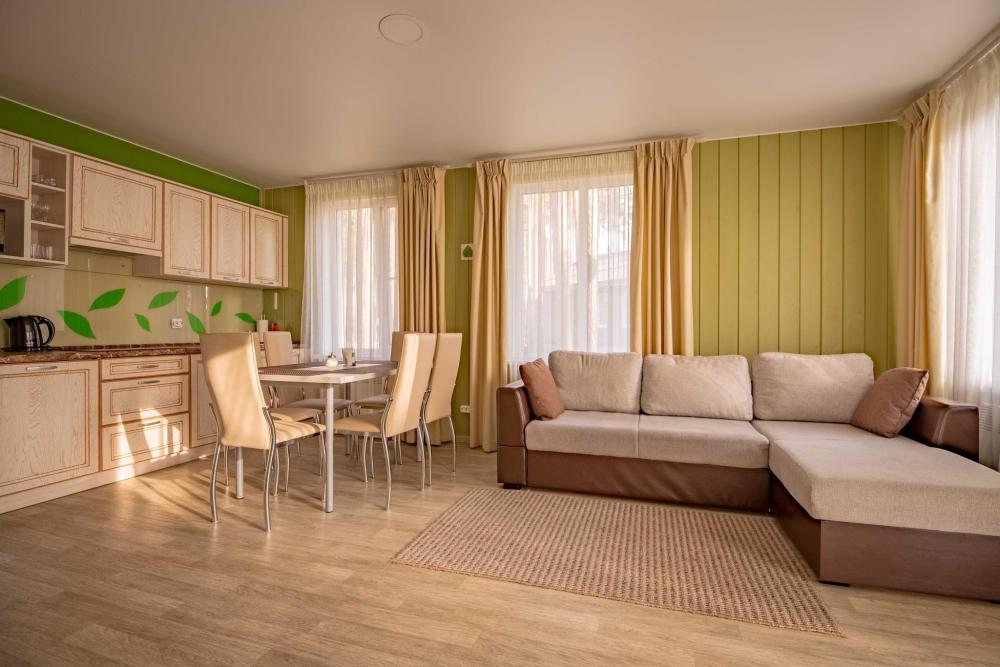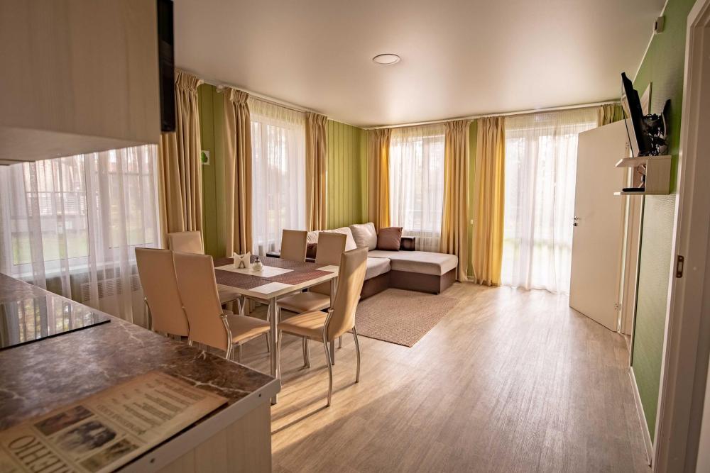 Кухня, микроволновая печь, душ, туалет, телевизор. В спальне две раздельные кровати. В гостиной зоне находится двуспальный диван.